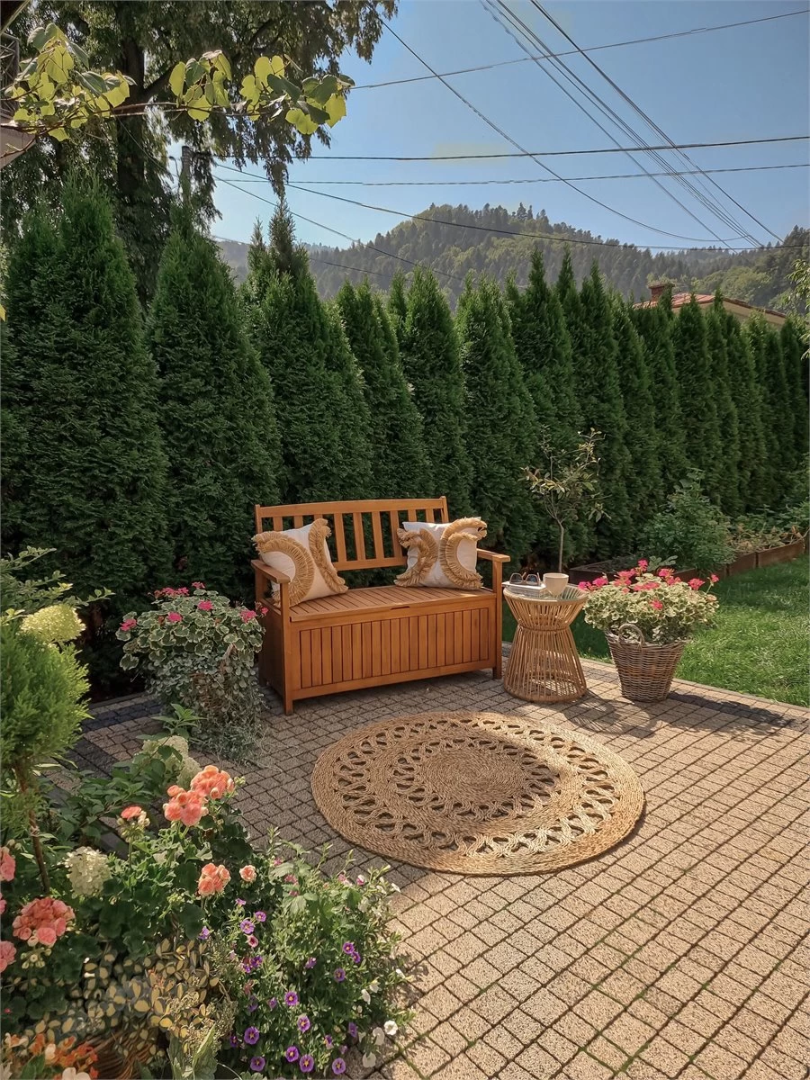 Banco de jardín con compartimento. Mejora la decoración de tu espacio al aire libre con este banco de jardín. Fabricado de madera de acacia de alta calidad, es duradero y de fácil mantenimiento. El banco está equipado con un compartimento oculto debajo del asiento. Se puede utilizar para guardar herramientas de jardín o cubiertas de muebles. El diseño minimalista de inspiración escandinava lo convierte en un complemento perfecto para cualquier jardín. Detalles: Tipo de Producto: Banco Estilo: Tradicional Color: Madera clara Tipo de material: Madera maciza Material principal: Madera de acacia Acabado: Aceitado Dimensiones: Altura del apoyabrazos: 64 cm Profundidad: 60 cm Altura del asiento: 45 cm Ancho: 120 cm Altura: 91 cm Superficie del asiento: 114×48 cm Peso: 24 kg Capacidad de peso: 300 kg La oferta incluye: 1 x Banco Ventajas: Los nudos y vetas de madera natural hacen que cada pieza sea única, Diseño clásico, Brinda un toque acogedor a cualquier espacio, Permanece estable incluso en superficies irregulares, Práctico espacio de almacenaje para todos tus accesorios Información de montaje: Requiere montaje completo. 45-60 min. Información adicional: Por favor, ten en cuenta que la madera es un producto natural, y cada pieza puede presentar ligeras variaciones. Las diferencias en el color o la textura, como las arrugas u otras características naturales, no se consideran un defecto ni tampoco una base de reclamación, El producto viene con un libro de cuidados detallado para ayudarte a mantener tus muebles en las mejores condiciones durante muchos años. Consulta estos consejos para garantizar el mantenimiento adecuado de tus muebles nuevos – encontrarás las instrucciones de mantenimiento junto con el manual de montaje. Texto de resistencia: Gracias a su resistencia al agua, puedes utilizar el producto al aire libre y dejarlo a la intemperie durante lluvias ligeras. Si no es posible guardarlo en un lugar cerrado y protegido, recomendamos utilizar una funda protectora. La exposición prolongada a la humedad puede provocar daños en el mueble. Resistencia: Agua ligera / humedad Consejos de mantenimiento: Madera de acacia: 1.Limpiar con un limpiador suave y un paño suave en la dirección de la veta. Secar con un paño inmediatamente después de limpiar 2.Durante el invierno o en condiciones climáticas adversas, utilice una funda protectora o guarde los muebles en el interior 3.Los muebles con acabado de aceite deben volverse a engrasar antes de ponerlos en uso y al menos una vez al año, especialmente en el clima húmedo.