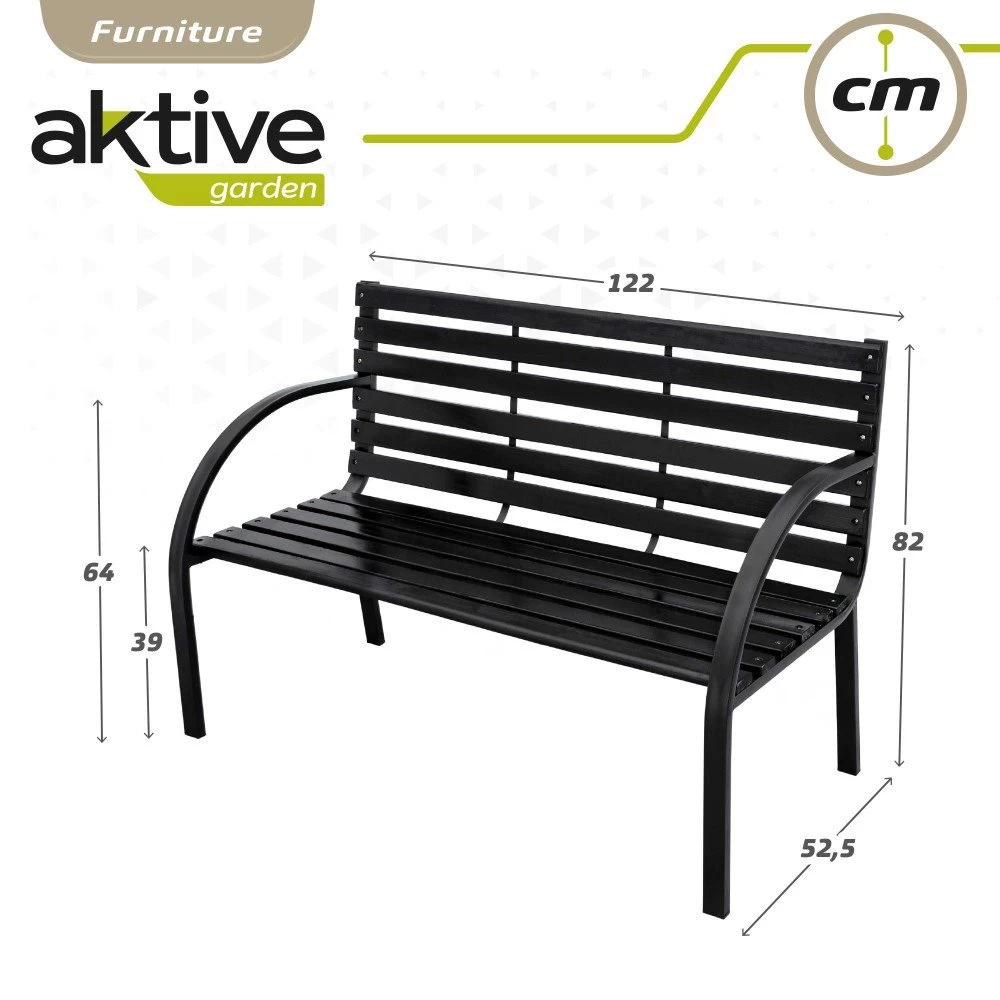 Este banco para jardín de madera de Aktive Garden es ideal para colocar en jardines, terrazas o patios y disfrutar de momentos únicos al exterior. Cuenta con un diseño clásico compuesto de listones con reposabrazos laterales, fácil de combinar con el resto de elementos de la terraza o jardín. Su asiento y respaldo están fabricados de madera color oscura y su estructura es de acero color negro. Tiene unas medidas de 122 cm de ancho, 52,5 cm de largo y 82 cm de alto y capacidad para sentarse hasta dos personas soportando un peso máximo de 220 kg. Pesa 9 kg y se puede lavar con facilidad con un paño húmedo y requiere de poco mantenimiento.