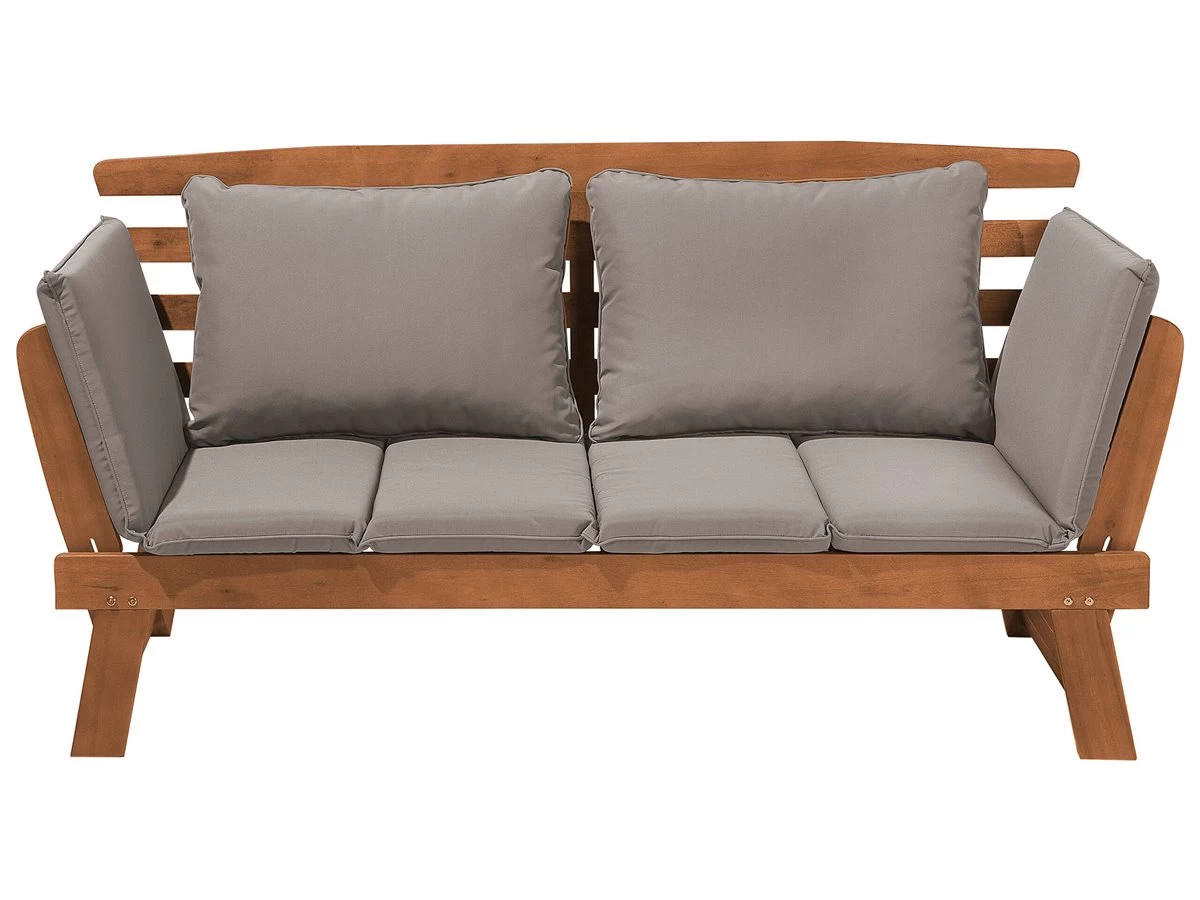 Elegante banco de jardín en madera de eucalipto con reposabrazos ajustables. ¡Este acogedor banco de jardín será tu nuevo lugar favorito en la terraza! Como un sofá de dos plazas, el banco del jardín ofrece mucho espacio para dos personas, y con unos sencillos pasos, los apoyabrazos se pliegan y tienes una cómoda tumbona para el sol. Los almohadones y cojines acolchados garantizan un óptimo confort. Las fundas en color gris están elaboradas en poliéster, repelente a la humedad y resistente a los rayos UV, y las fundas de las almohadas son extraíbles y lavables a 30°C. El robusto armazón con elegantes listones de madera de eucalipto oscuro combina a la perfección con cualquier diseño de jardín clásico. ¡Haz unas vacaciones de ensueño en tu propio jardín! Detalles: Tipo de Producto: Banco Estilo: Retro Color: Madera oscura Tipo de material: Madera maciza Material principal: Madera de eucalipto Material adicional: Poliéster Composición del Material: 100% Poliéster Densidad de espuma del asiento: 17 kg/m3 Dimensiones: Altura del apoyabrazos: 40 cm Profundidad: 66 cm Espesor del asiento: 6 cm Altura del asiento: 30 cm Ancho: 210 cm Altura: 82 cm Superficie del asiento: 132×63 cm Peso: 26 kg Capacidad de peso: 200 kg La oferta incluye: 1 x Banco, 1 x Cojín del asiento, 2 x Cojín Ventajas: Brinda comodidad y relajación, Perfecto para todo tipo de exterior, Estructura duradera y sólida, Resistencia UV 4 (ISO 105-B02, Muy fácil de conservar, Fundas extraíbles Información de montaje: Requiere montaje completo. 20-40 min. Información adicional: El producto viene con un libro de cuidados detallado para ayudarte a mantener tus muebles en las mejores condiciones durante muchos años. Consulta estos consejos para garantizar el mantenimiento adecuado de tus muebles nuevos – encontrarás las instrucciones de mantenimiento junto con el manual de montaje. Texto de resistencia: Gracias a su resistencia al agua, puedes utilizar el producto al aire libre y dejarlo a la intemperie durante lluvias ligeras. Si no es posible guardarlo en un lugar cerrado y protegido, recomendamos utilizar una funda protectora. La exposición prolongada a la humedad puede provocar daños en el mueble. Resistencia: Agua ligera / humedad Consejos de mantenimiento: Madera de eucalipto: 1.Los muebles con acabado de aceite deben volverse a engrasar antes de ponerlos en uso y al menos una vez al año, especialmente en el clima húmedo 2.Limpiar con un limpiador suave y un paño suave en la dirección de la veta. Secar con un paño inmediatamente después de limpiar 3.Durante el invierno o en condiciones climáticas adversas, utilice una funda protectora o guarde los muebles en el interior. Poliéster: 1.Lavar a mano o seleccionar un ciclo de lavado de lana (30 ° C, a menos que el fabricante especifique lo contrario. Lavar del revés con la cremallera cerrada 2.Cuando no esté en uso, manténgalo en un lugar limpio y seco para protegerlo de las condiciones atmosféricas 3.No secar en secadora y no planchar.