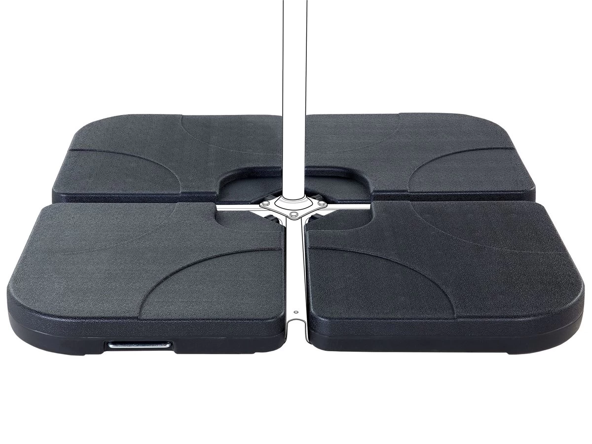 Base para sombrilla – conjunto de cuatro secciones de peso. Añade funcionalidad a tu zona exterior con esta base para sombrilla. Está fabricada a partir de material sintético resistente a los rayos UV y a condiciones climáticas adversas. Puedes rellenar cada pieza con agua o arena y ajustar el peso a tus necesidades. Detalles: Tipo de Producto: Accesorios para sombrilla Estilo: Moderno Color: Negro Tipo de material: Material sintético Material principal: Material sintético Forma: Cuadrada Recommendado para: Sombrilla sin volantes Dimensiones: Profundidad: 52 cm Ancho: 52 cm Altura: 8 cm Peso: 9 kg La oferta incluye: 1 x Base para sombrilla (4 piezas Ventajas: Gran durabilidad, Ideal para uso al aire libre, Resistencia UV, Resiste a la intemperie y a todo tipo de clima, Mantenimiento sencillo Información de montaje: Requiere montaje parcial. 5-15 min. Texto de resistencia: Gracias a su resistencia al agua, puedes utilizar el producto al aire libre y dejarlo a la intemperie durante lluvias ligeras. Si no es posible guardarlo en un lugar cerrado y protegido, recomendamos utilizar una funda protectora. La exposición prolongada a la humedad puede provocar daños en el mueble. Resistencia: Agua ligera / humedad Consejos de mantenimiento: Material sintético: 1.Manténgalo alejado de fuentes de calor, como parrilla o fuego, ya que las chispas pueden causar daños graves. No coloque utensilios calientes directamente sobre la superficie, 2.Limpiar con un limpiador a base de jabón suave y un paño suave, 3.El material es extremadamente resistente a la intemperie. Sin embargo, se recomienda utilizar una funda protectora para la temporada de invierno o, si es posible, guardar los muebles en un lugar fresco y seco.