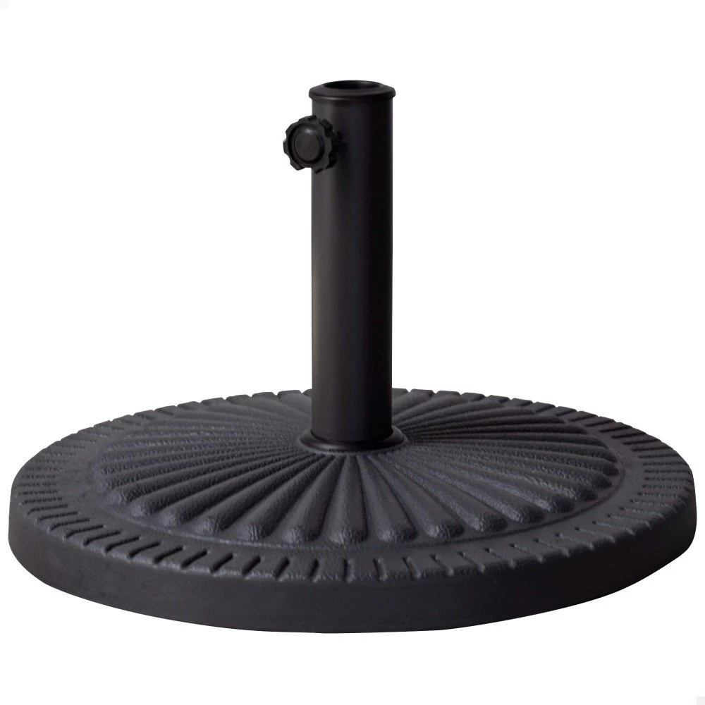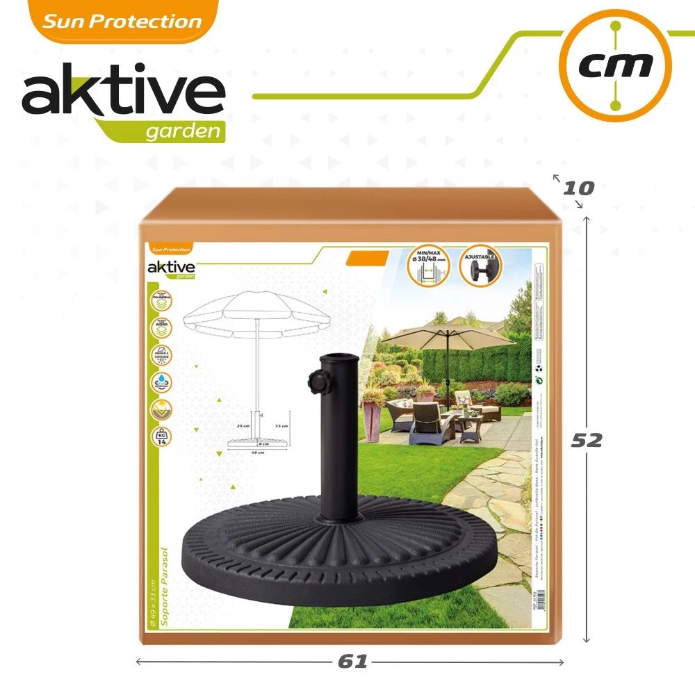 Soporte para sombrilla Aktive Garden de poliresina con medidas de 49 cm de diámetro y 33 cm de altura. La pieza pesa 14 kilos. Diseño funcional en gris oscuro y con tubo de acero. Fabricada con material resistente al agua y a los rayos de sol. Ideal para asegurar la estabilidad y sujeción de tu sombrilla frente alviento. Apto para sombrillas con mástil de 38 y 48 mm, con rosca ajustable.