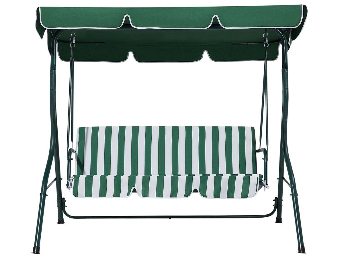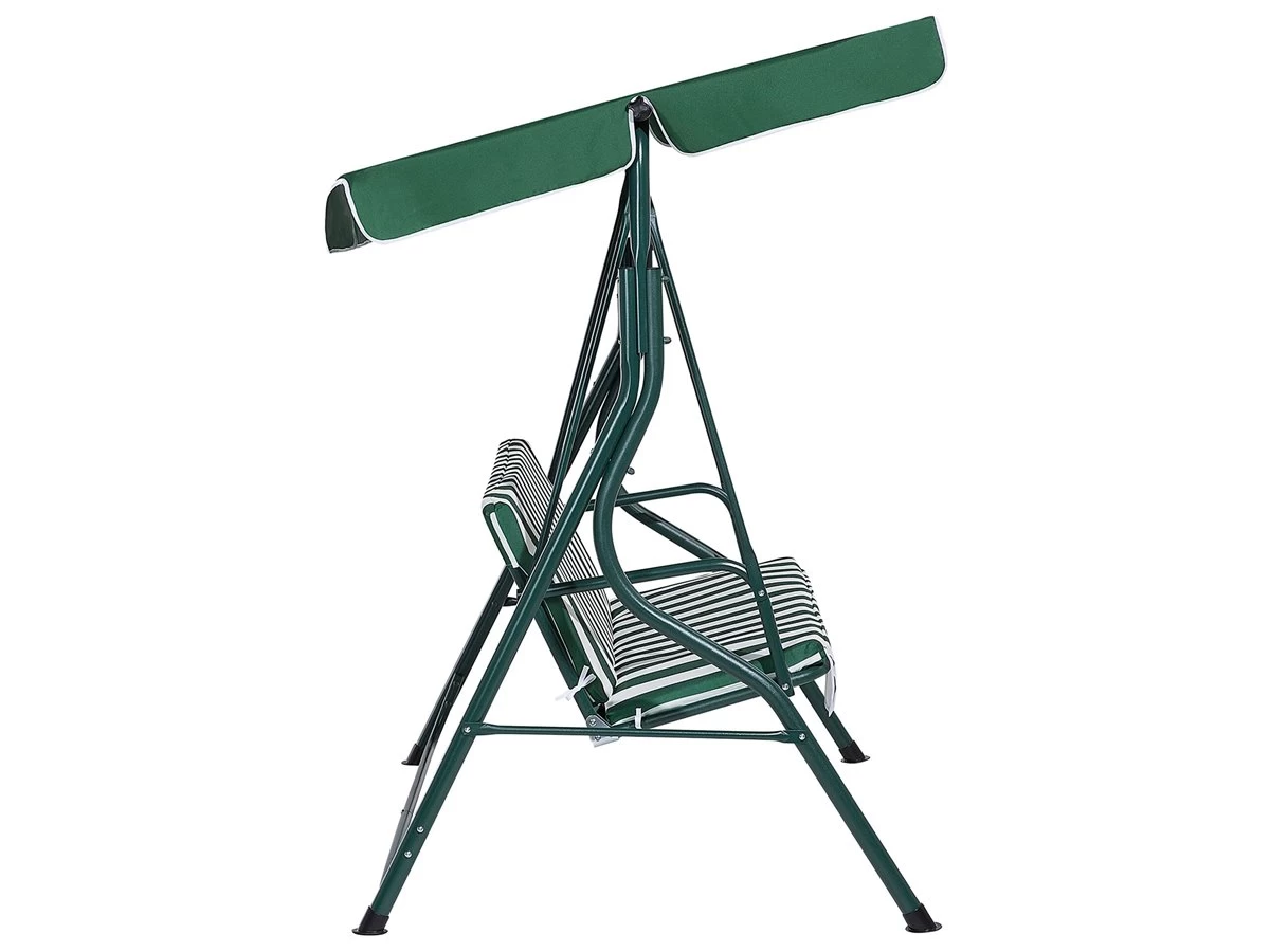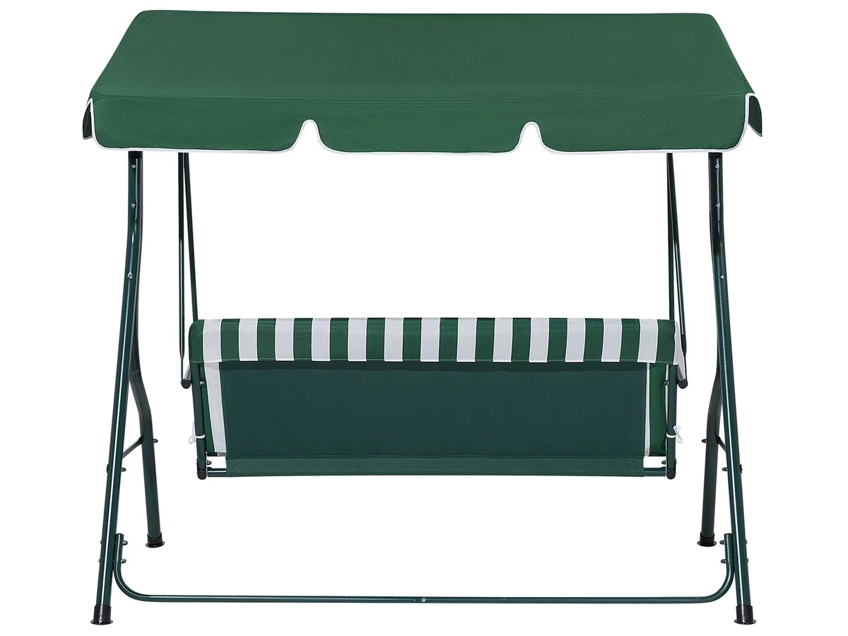 Columpio de jardín. Este columpio de jardín combina bien con cualquier decoración moderna. Está fabricado de acero con recubrimiento en polvo que garantiza durabilidad y estabilidad. El dosel de fibra sintética es resistente a las manchas y aporta un toque de relajación en los días más soleados. El respaldo alto y los asientos acolchados garantizan la máxima comodidad al sentarse. Detalles: Tipo de Producto: Columpio Estilo: Retro Color: Verde Tipo de material: Acero Material principal: Acero Material adicional: Poliéster Composición del Material: 100% Poliéster Acabado: Revestimiento en polvo Dimensiones: Altura del apoyabrazos: 18 cm Profundidad: 118 cm Espesor del asiento: 6 cm Altura del asiento: 53 cm Ancho: 174 cm Altura: 147 cm Superficie del asiento: 115×41 cm Peso: 13 kg Capacidad de peso: 260 kg La oferta incluye: 1 x Columpio Ventajas: La práctica cubertura brindará protección contra el viento y el sol, Las tiras ofrecen una fijación segura, Perfecto para todo tipo de exterior, Resistencia UV 3 (ISO 105-B02, Construcción muy estable Información de montaje: Requiere montaje completo. Más de 60 min. Texto de resistencia: Gracias a su resistencia al agua, puedes utilizar el producto al aire libre y dejarlo a la intemperie durante lluvias ligeras. Si no es posible guardarlo en un lugar cerrado y protegido, recomendamos utilizar una funda protectora. La exposición prolongada a la humedad puede provocar daños en el mueble. Resistencia: Agua ligera / humedad Consejos de mantenimiento: Poliéster: 1.Limpiar con champú seco y una esponja húmeda o un limpiador suave 2.Cuando no esté en uso, manténgalo en un lugar limpio y seco para protegerlo de las condiciones atmosféricas 3.Aspire con un accesorio adecuado. Acero: 1.Los muebles de acero y sus elementos no deben exponerse al agua. De lo contrario, existe la posibilidad de que el agua oxidada salga de las tuberías del marco 2.Cuando no estén en uso, los muebles deben guardarse en el interior o bajo una cubierta protectora 3.Para aumentar la durabilidad del artículo, manténgalo seco y recuerde la limpieza regular 4.Cualquier daño a la capa de pintura exterior debe protegerse de la humedad 5.Para garantizar la protección contra la corrosión, evite los limpiadores alcalinos o ácidos. Después de limpiar, secar bien 6.Quite las tapas protectoras con regularidad para que salga todo el líquido, déjelas secar y utilice un spray anticorrosión si es necesario 7.Limpiar con detergentes suaves.