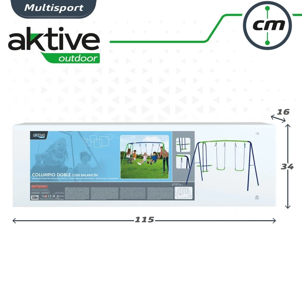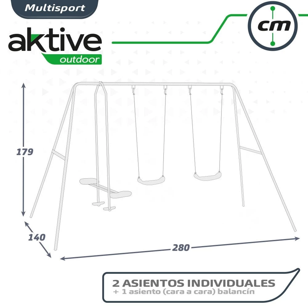 Columpio Aktive Sports con 2 asientos y 1 balancín, recomendado para 4 niños que no excedan de 180 kg en total. Completo columpio de 280x140x179 cm fabricado en metal recubierto con pintura epoxi antioxidante y PVC resistente. Asientos de 35,5x18x8,5 cm con cuerdas de 114 cm de largo. Balancín de 280x140x179 cm para 2 niños. Montaje sencillo, ideal para terraza o jardín. Recomendado a partir de 3 años. ¡Juega con Aktive!