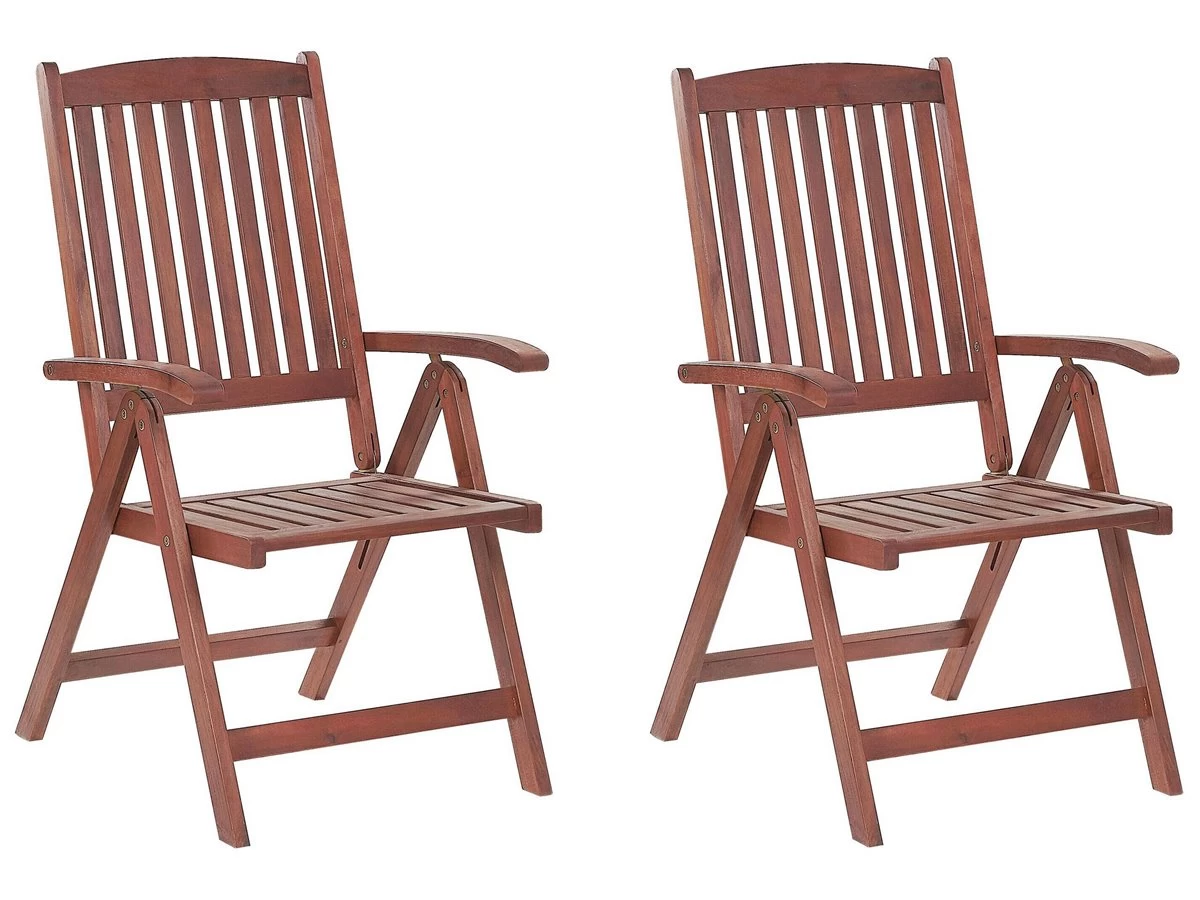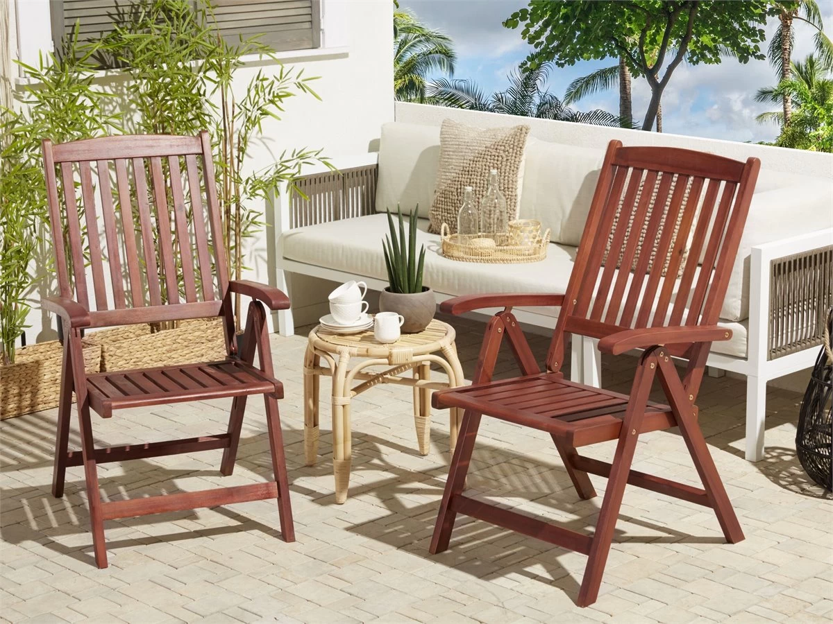 Sillas plegables para exteriores con respaldos ajustables. Agrega un toque de encanto campestre a tu jardín con estas elegantes sillas de inspiración rústica. Elaboradas de madera de acacia de alta calidad en un color marrón oscuro neutro, estas sillas complementan cualquier entorno al aire libre. La relajación también está garantizada gracias a los respaldos reclinables de las sillas que te permiten colocar estas piezas como desees y, para mayor comodidad, las sillas se pueden plegar para un fácil almacenamiento. Detalles: Tipo de Producto: Conjunto plegable Estilo: Tradicional Color: Madera oscura Tonalidad: Rojo oscuro Tipo de material: Madera maciza Material principal: Madera de acacia Material adicional: Acero Material de las patas: Madera maciza Material del asiento: Madera maciza Apoyabrazo: Sí Acabado: Aceitado Plegable: Sí Apilable: No Dimensiones: Altura del apoyabrazos: 67 cm Profundidad: 69 cm Altura del asiento: 44 cm Ancho: 54 cm Altura: 105 cm Superficie del asiento: 48×43 cm Peso: 10 kg Capacidad de peso: 160 kg La oferta incluye: 2 x Silla Ventajas: Diseño atemporal, Combina con todo tipo de decoración, Apariencia moderna y calidad durante muchos años, Plegable, ahorra espacio, Materiales naturales Información de montaje: No requiere montaje Información adicional: Por favor, ten en cuenta que la madera es un producto natural, y cada pieza puede presentar ligeras variaciones. Las diferencias en el color o la textura, como las arrugas u otras características naturales, no se consideran un defecto ni tampoco una base de reclamación, El producto viene con un libro de cuidados detallado para ayudarte a mantener tus muebles en las mejores condiciones durante muchos años. Consulta estos consejos para garantizar el mantenimiento adecuado de tus muebles nuevos – encontrarás las instrucciones de mantenimiento junto con el manual de montaje. Texto de resistencia: Gracias a su resistencia al agua, puedes utilizar el producto al aire libre y dejarlo a la intemperie durante lluvias ligeras. Si no es posible guardarlo en un lugar cerrado y protegido, recomendamos utilizar una funda protectora. La exposición prolongada a la humedad puede provocar daños en el mueble. Resistencia: Manchas Consejos de mantenimiento: Madera de acacia: 1.Limpiar con un limpiador suave y un paño suave en la dirección de la veta. Secar con un paño inmediatamente después de limpiar 2.Durante el invierno o en condiciones climáticas adversas, utilice una funda protectora o guarde los muebles en el interior 3.Los muebles con acabado de aceite deben volverse a engrasar antes de ponerlos en uso y al menos una vez al año, especialmente en el clima húmedo.