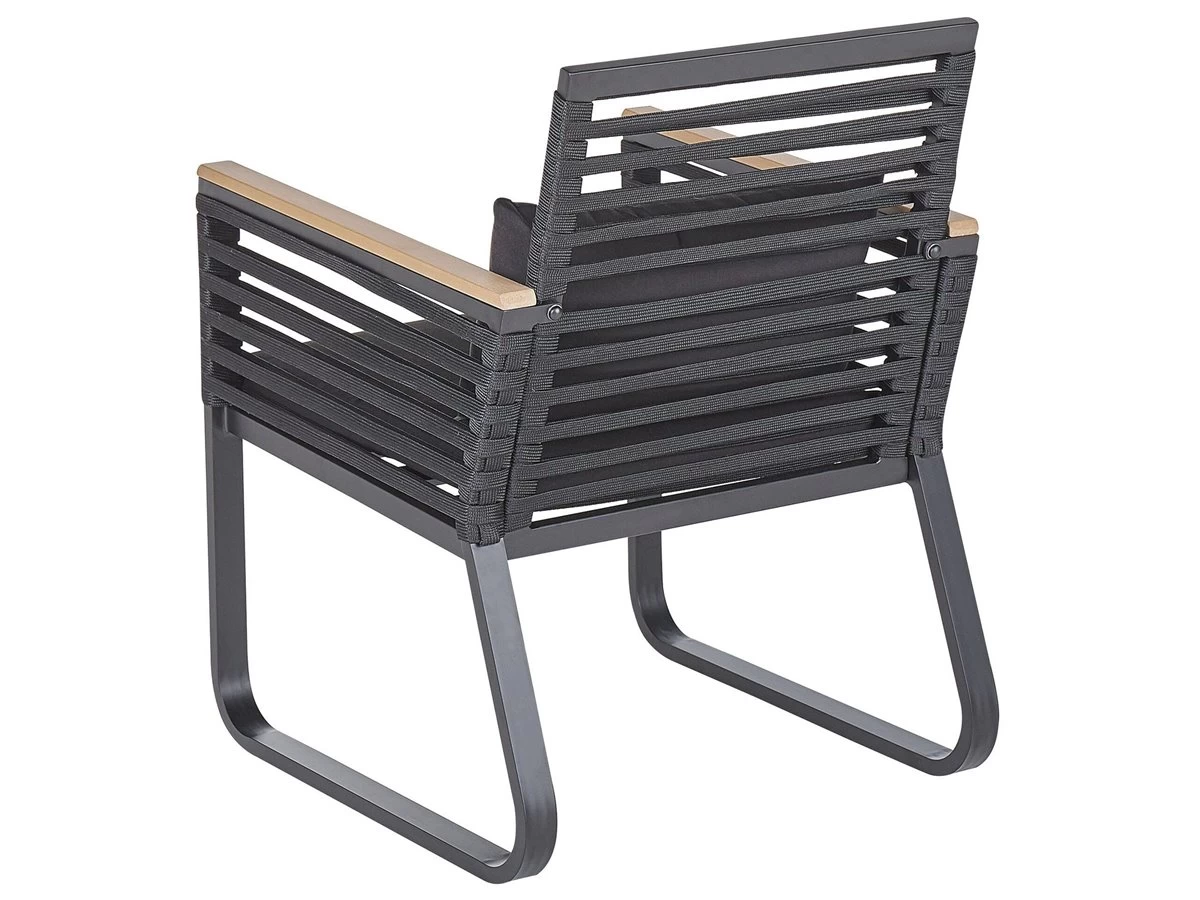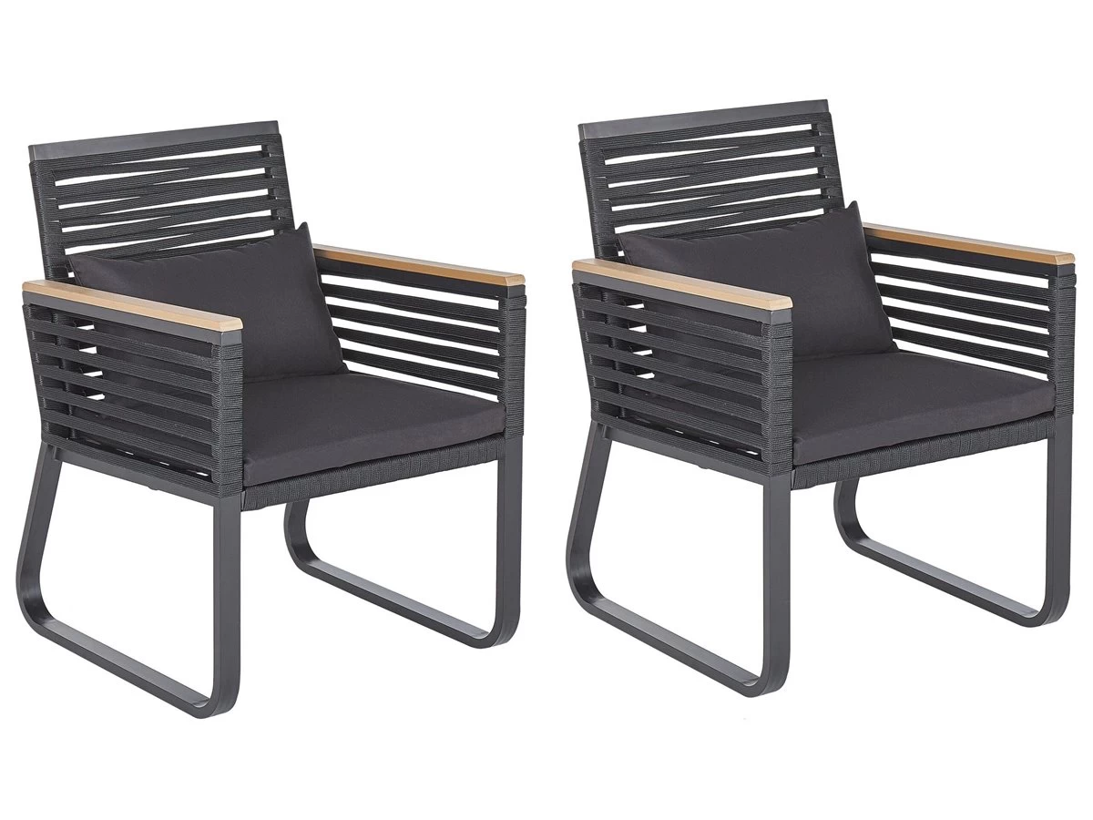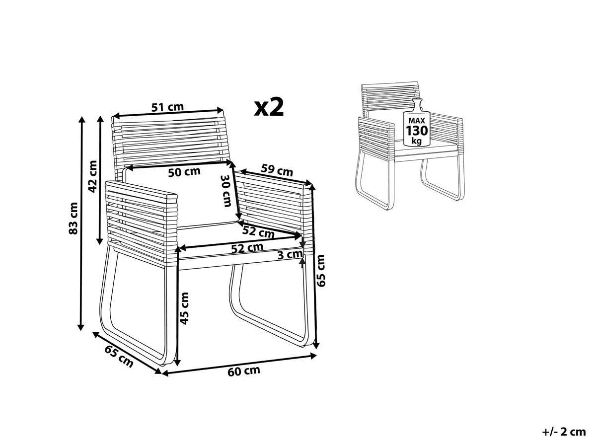 Juego de sillas. Añade a tu área exterior este conjunto de 2 sillas de jardín. La construcción de aluminio proporciona estabilidad y los elementos de madera plástica en los reposabrazos, comodidad. Los respaldos y asientos de estilo cuerda acolchados garantizan el mejor descanso. Utilízalas de forma independiente o combinadas con una mesa de jardín de su gama. Detalles: Tipo de Producto: Silla de jardín Estilo: Moderno Color: Negro Tipo de material: Metal Material principal: Aluminio Material adicional: Poliéster Material de las patas: Metal Material del asiento: Tejido Composición del Material: 100% Poliéster Apoyabrazo: Sí Acabado: Revestimiento en polvo Plegable: No Densidad de espuma del asiento: 28 kg/m3 Apilable: No Dimensiones: Altura del apoyabrazos: 65 cm Profundidad: 65 cm Espesor del asiento: 3 cm Altura del asiento: 45 cm Ancho: 60 cm Altura: 83 cm Superficie del asiento: 52×52 cm Peso: 7 kg Capacidad de peso: 130 kg La oferta incluye: 2 x Silla, 2 x Cojines del asiento, 2 x Cojín del respaldo Ventajas: Funda extraíble, Resistencia UV 6 (ISO 105-B02, Ideal para uso al aire libre, No requiere mantenimiento regular, Durable y robusto, Patas con tapas antideslizantes de seguridad Información de montaje: Requiere montaje completo. 20-40 min. Información adicional: Abre el embalaje con cuidado, especialmente cuando utilizas herramientas afiladas o puntiagudas, ya que pueden dañar el producto Texto de resistencia: El producto es resistente al viento, por lo que no debe volcarse ni perder estabilidad con ráfagas de viento. Resistencia: Viento Consejos de mantenimiento: Aluminio: 1.Limpiar con agua jabonosa y detergentes suaves. Quitar el polvo con un paño suave 2.Fuera de temporada, utilice una funda protectora o guarde los muebles en un lugar fresco y seco. Poliéster: 1.Lavar a mano únicamente, usar agua fría y un detergente suave 2.Cuando no esté en uso, manténgalo en un lugar limpio y seco para protegerlo de las condiciones atmosféricas 3.No secar en secadora ni planchar. Madera plástica: 1.El material es extremadamente resistente a la intemperie. Sin embargo, se recomienda utilizar una funda protectora para la temporada de invierno o, si es posible, guardar los muebles en un lugar fresco y seco 2.Manténgalo alejado de fuentes de calor, como parrilla o fuego, ya que las chispas pueden causar daños graves. No coloque utensilios calientes directamente sobre la superficie, 3.Limpiar con un limpiador a base de jabón suave y un paño suave