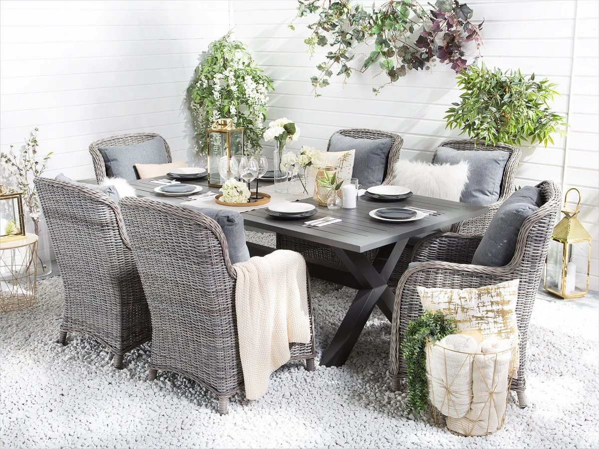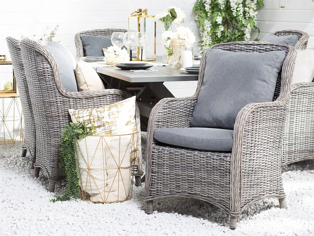 Juego de sillas de ratán sintético. Añade a tu zona exterior este conjunto de 2 sillas de jardín. Está fabricado a partir de ratán sintético de alta calidad. El respaldo acolchado y los cojines de asiento proporcionan la máxima comodidad. La estructura de aluminio resistente ofrece estabilidad. Combina bien con cualquier área contemporánea, tradicional o moderna. Detalles: Tipo de Producto: Silla de jardín Estilo: Moderno Color: Gris Tipo de material: Ratán sintético Material principal: Ratán sintético Material adicional: Poliéster Material de las patas: Mimbre sintético Material del asiento: Tejido Composición del Material: 100% Poliéster Apoyabrazo: Sí Acabado: Revestimiento en polvo Plegable: No Densidad de espuma del asiento: 28 kg/m3 Apilable: No Dimensiones: Altura del apoyabrazos: 64 cm Profundidad: 73 cm Espesor del asiento: 10 cm Altura del asiento: 38 cm Ancho: 60 cm Altura: 96 cm Superficie del asiento: 50×49 cm Peso: 10 kg Capacidad de peso: 100 kg La oferta incluye: 2 x Silla, 2 x Cojines del asiento, 2 x Cojín del respaldo Ventajas: Cojines muy cómodos para un confort ideal, Muy cómodo, Cómodos apoyabrazos, Diseño tradicional con un toque moderno, Muy fácil de conservar, Fabricación sólida y precisa, Resistencia UV 7 (ISO 105-B02, Patas con tapas antideslizantes de seguridad Información de montaje: No requiere montaje Texto de resistencia: Gracias a su resistencia al agua, puedes utilizar el producto al aire libre y dejarlo a la intemperie durante lluvias ligeras. Si no es posible guardarlo en un lugar cerrado y protegido, recomendamos utilizar una funda protectora. La exposición prolongada a la humedad puede provocar daños en el mueble. Resistencia: Agua ligera / humedad Consejos de mantenimiento: Ratán sintético: 1.Para alargar la vida útil del mueble, protéjalo de la exposición directa al sol 2.Se recomienda utilizar una funda protectora para la temporada de invierno o, si es posible, para mantener los muebles secos y frescos en el interior 3.Limpiar con detergentes a base de jabón. No utilizar limpiadores químicos corrosivos 4.Los utensilios o accesorios de vidrio pueden sobrecalentar la superficie. Poliéster: 1.No secar en secadora ni planchar 2.Lavar a mano únicamente, usar agua fría y un detergente suave 3.Cuando no esté en uso, manténgalo en un lugar limpio y seco para protegerlo de las condiciones atmosféricas.