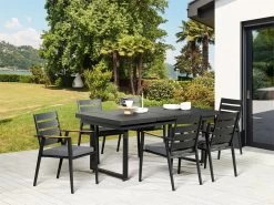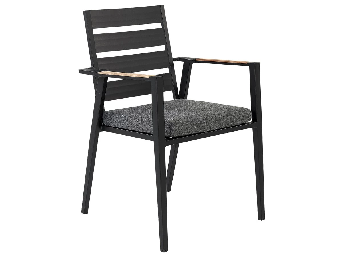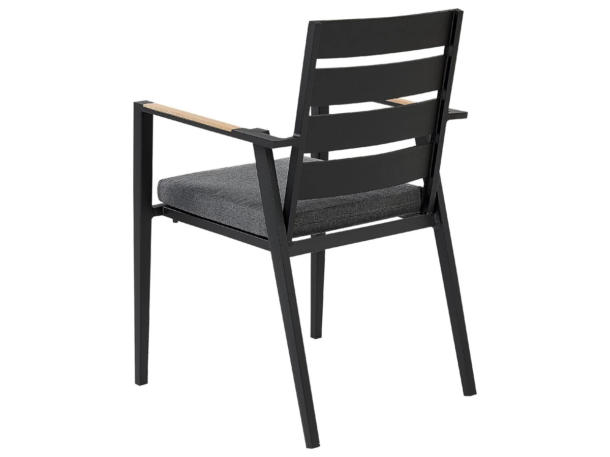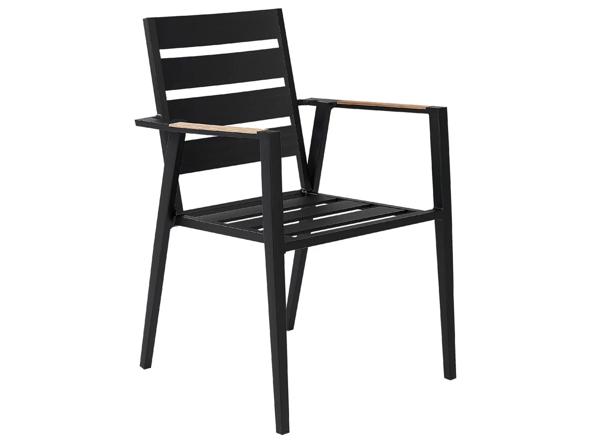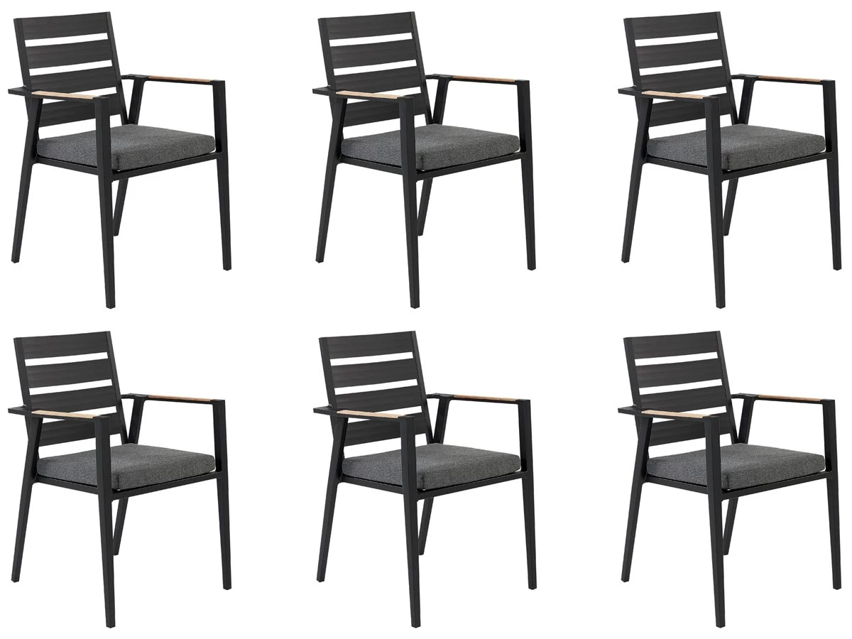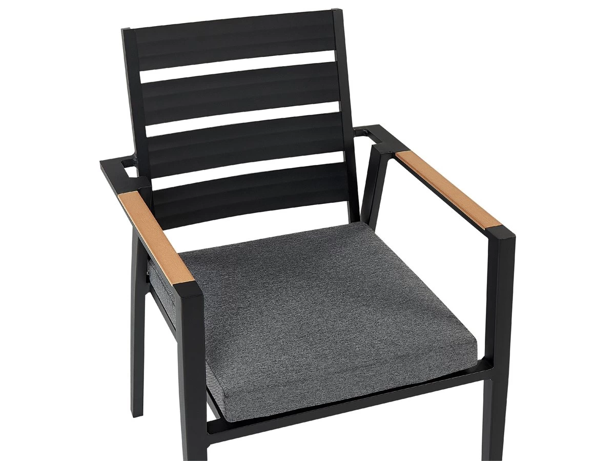 Juego de sillas de exterior. Añade elegancia a tu zona exterior con este conjunto de 6 sillas de jardín. Está fabricado a partir de metal duradero y de alta calidad. El respaldo de listones, el detalle de madera en los reposabrazos y las patas finas aportan un toque minimalista al diseño. Detalles: Tipo de Producto: Silla de jardín Estilo: Moderno Color: Negro Tipo de material: Tejido Material principal: Aluminio Material adicional: Poliéster Material de las patas: Material sintético Material del asiento: Tejido Composición del Material: 100% Poliéster Apoyabrazo: Sí Acabado: Revestimiento en polvo Plegable: No Densidad de espuma del asiento: 280 kg/m3 Apilable: Sí Dimensiones: Altura del apoyabrazos: 26 cm Profundidad: 58 cm Espesor del asiento: 5 cm Altura del asiento: 39 cm Ancho: 54 cm Altura: 86 cm Superficie del asiento: 43×43 cm Peso: 5 kg Capacidad de peso: 160 kg La oferta incluye: 6 x Silla, 6 x Cojines del asiento Ventajas: Funda extraíble, Perfecto para todo tipo de exterior, Construcción muy estable, Ideal para uso al aire libre, Patas con tapas antideslizantes de seguridad, Apilable, ahorra espacio Información de montaje: No requiere montaje Información adicional: Abre el embalaje con cuidado, especialmente cuando utilizas herramientas afiladas o puntiagudas, ya que pueden dañar el producto Texto de resistencia: Los muebles resistentes a los rayos UV muestran una mayor resistencia a la decoloración. Sin embargo, recomendamos que el producto se guarde en el interior cuando no esté en uso. Esto asegurará la máxima durabilidad de los muebles. Resistencia: Rayos UV Consejos de mantenimiento: Aluminio: 1.Fuera de temporada, utilice una funda protectora o guarde los muebles en un lugar fresco y seco 2.Limpiar con agua jabonosa y detergentes suaves. Quitar el polvo con un paño suave. Poliéster: 1.No secar en secadora y no planchar 2.Lavar a mano o seleccionar un ciclo de lavado de lana (30 ° C, a menos que el fabricante especifique lo contrario. Lavar del revés con la cremallera cerrada 3.Cuando no esté en uso, manténgalo en un lugar limpio y seco para protegerlo de las condiciones atmosféricas.