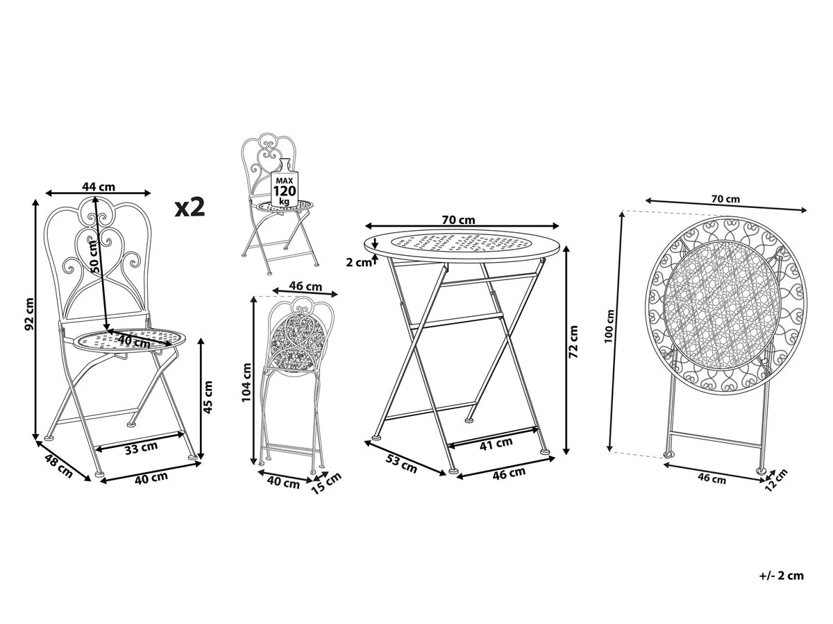 Set de balcón. Disfruta del mejor descanso al aire libre con este conjunto de balcón. El diseño inspirado en el estilo provenzal aporta elegancia a la decoración. De apariencia neutra, combina bien con cojines o mantas pertenecientes a cualquier esquema de color. Detalles: Tipo de Producto: Conjunto bistro Estilo: Tradicional Color: Beige Tonalidad: Beige claro Tipo de material: Metal Material principal: Hierro Material de la superficie: Metal Dimensiones: Dimensiones de la silla: 44x48x92 cm Dimensiones de la mesa de centro: 70x70x72 Altura del asiento: 45 cm Peso: 14 kg Capacidad de peso de la silla: 120 kg Capacidad de peso de la mesa: 40 kg La oferta incluye: 2 x Silla, 1 x Mesa Ventajas: Diseño elegante, Combinación perfecta de colores y materiales, Apariencia elegante, Ideal para uso al aire libre, Material impermeable y muy fácil de conservar, Plegable, ahorra espacio, Muy ligero y fácil de desplazar Información de montaje: No requiere montaje Información adicional: Abre el embalaje con cuidado, especialmente cuando utilizas herramientas afiladas o puntiagudas, ya que pueden dañar el producto, El efecto desgastado o las manchas visibles son intencionales y no se consideran un defecto. Texto de resistencia: Gracias a su resistencia al agua, puedes utilizar el producto al aire libre y dejarlo a la intemperie durante lluvias ligeras. Si no es posible guardarlo en un lugar cerrado y protegido, recomendamos utilizar una funda protectora. La exposición prolongada a la humedad puede provocar daños en el mueble. Resistencia: Agua ligera / humedad Consejos de mantenimiento: Hierro: 1.Los muebles de acero y sus elementos no deben exponerse al agua. De lo contrario, existe la posibilidad de que el agua oxidada salga de las tuberías del marco 2.Cuando no estén en uso, los muebles deben guardarse en el interior o bajo una cubierta protectora 3.Para aumentar la durabilidad del artículo, manténgalo seco y recuerde la limpieza regular 4.Cualquier daño a la capa de pintura exterior debe protegerse de la humedad 5.Para garantizar la protección contra la corrosión, evite los limpiadores alcalinos o ácidos. Después de limpiar, secar bien 6.Quite las tapas protectoras con regularidad para que salga todo el líquido, déjelas secar y utilice un spray anticorrosión si es necesario 7.Limpiar con detergentes suaves.