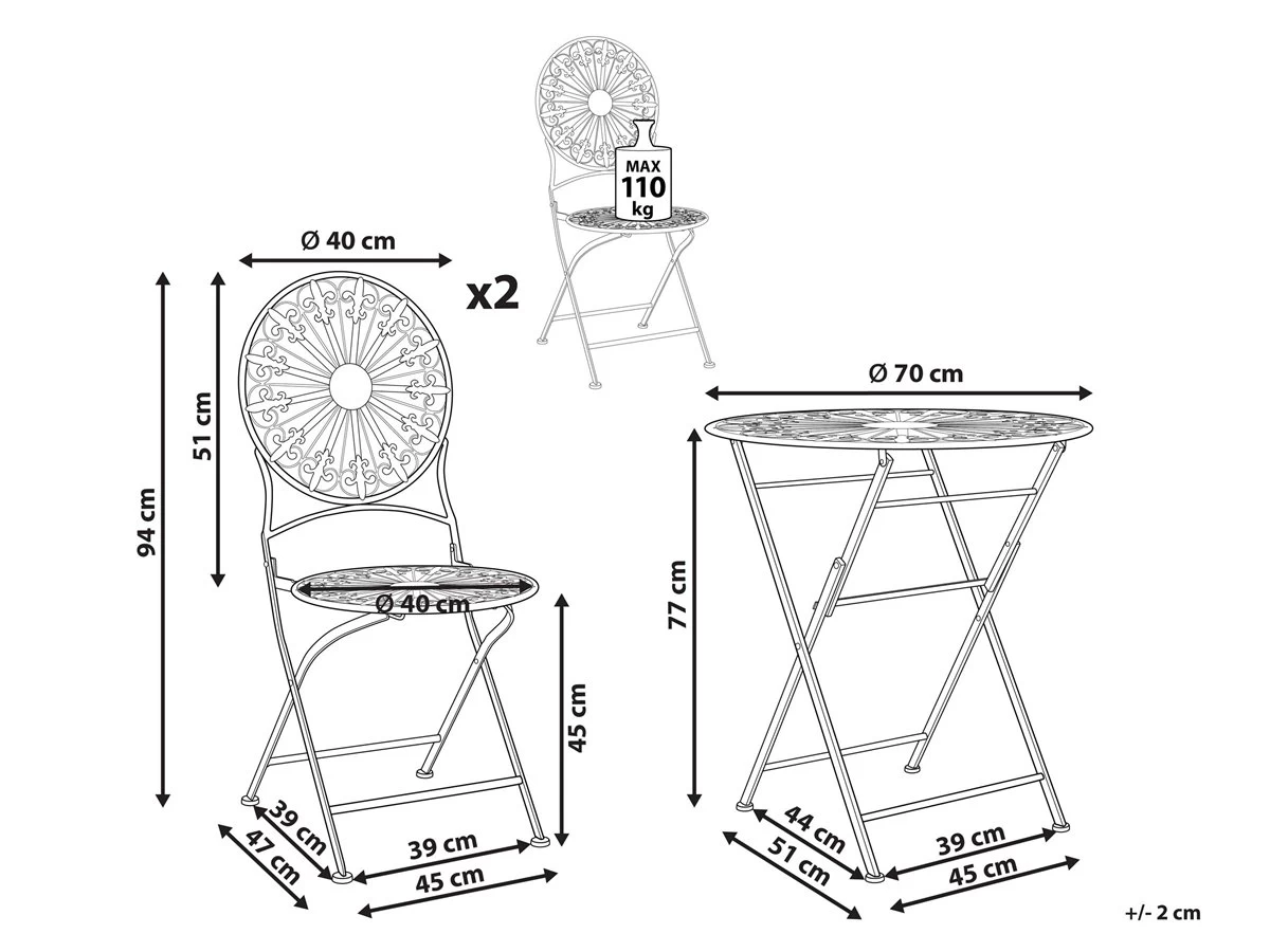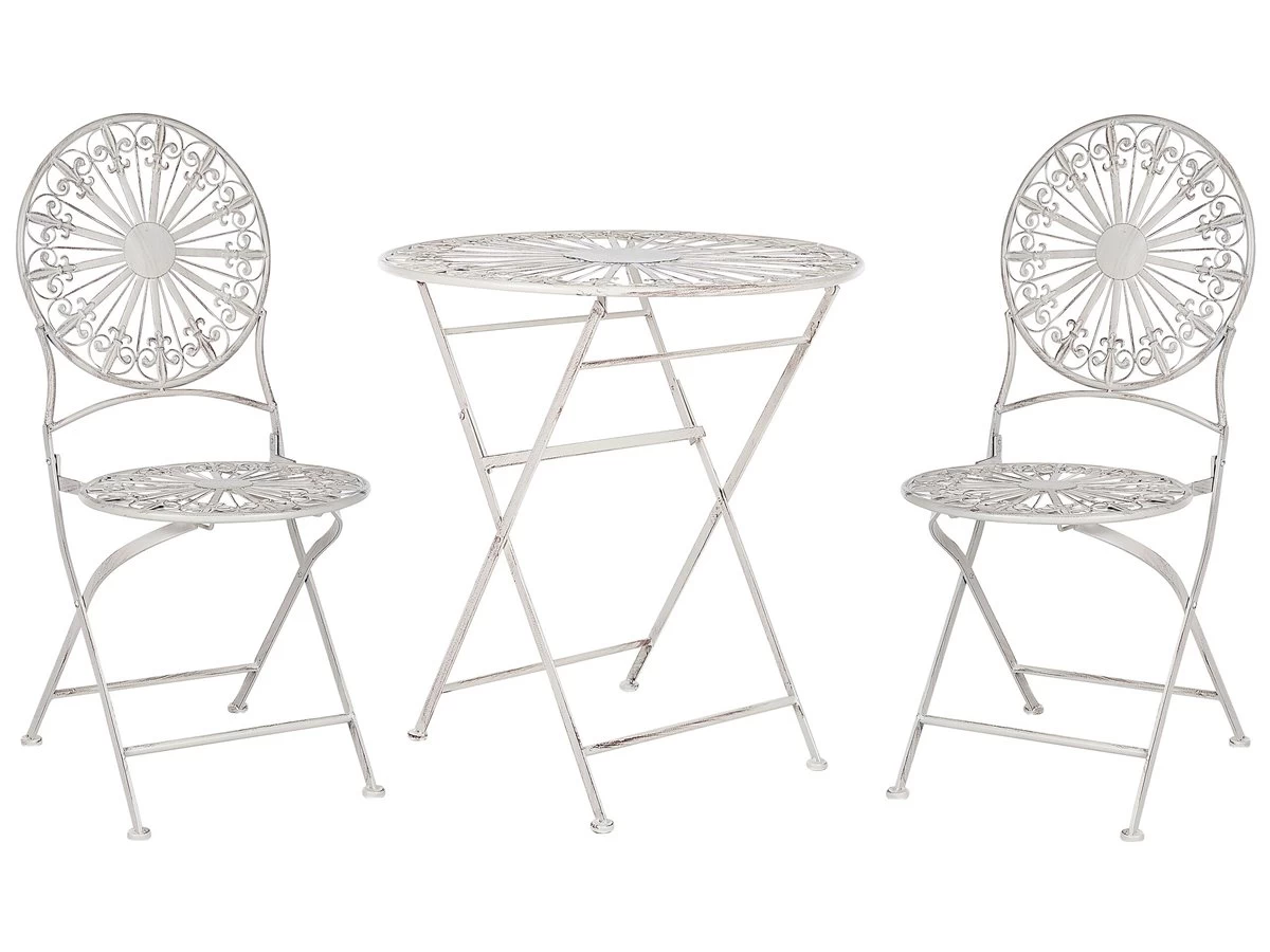 Juego de exterior. Crea un rincón de inspiración francesa en tu zona exterior con este conjunto de balcón. Está fabricado a partir de metal de alta calidad. Es plegable, lo que permite ahorrar espacio y facilita el transporte de una habitación a otra. El estilo retro y el aspecto desgastado aportan un encanto único. Detalles: Tipo de Producto: Conjunto bistro Estilo: Rústico Color: Blanco Tonalidad: Blanco crema Tipo de material: Acero Material principal: Hierro Material de la superficie: Metal Acabado: Revestimiento en polvo Dimensiones: Dimensiones de la silla: 45x47x94 cm Dimensiones de la mesa de centro: 45x51x77 Altura del asiento: 45 cm Peso: 11 kg Capacidad de peso de la silla: 110 kg Capacidad de peso de la mesa: 40 kg La oferta incluye: 2 x Silla, 1 x Mesa Ventajas: Estilo retro, Resistencia UV, Fabricación sólida y precisa, Plegable para un fácil almacenamiento, Compacto y perfecto para espacios limitados Información de montaje: No requiere montaje Información adicional: El efecto desgastado o las manchas visibles son intencionales y no se consideran un defecto. Texto de resistencia: Gracias al acabado especial, la superficie del producto es resistente a la oxidación. Esto significa que se puede utilizar en exteriores. Cuando el producto no esté en uso, se recomienda cubrirlo con una cubierta o colocarlo en un lugar seco. Resistencia: Intemperie Consejos de mantenimiento: Hierro: 1.Quite las tapas protectoras con regularidad para que salga todo el líquido, déjelas secar y utilice un spray anticorrosión si es necesario 2.Limpiar con detergentes suaves 3.Los muebles de acero y sus elementos no deben exponerse al agua. De lo contrario, existe la posibilidad de que el agua oxidada salga de las tuberías del marco 4.Cuando no estén en uso, los muebles deben guardarse en el interior o bajo una cubierta protectora 5.Para aumentar la durabilidad del artículo, manténgalo seco y recuerde la limpieza regular 6.Cualquier daño a la capa de pintura exterior debe protegerse de la humedad 7.Para garantizar la protección contra la corrosión, evite los limpiadores alcalinos o ácidos. Después de limpiar, secar bien.