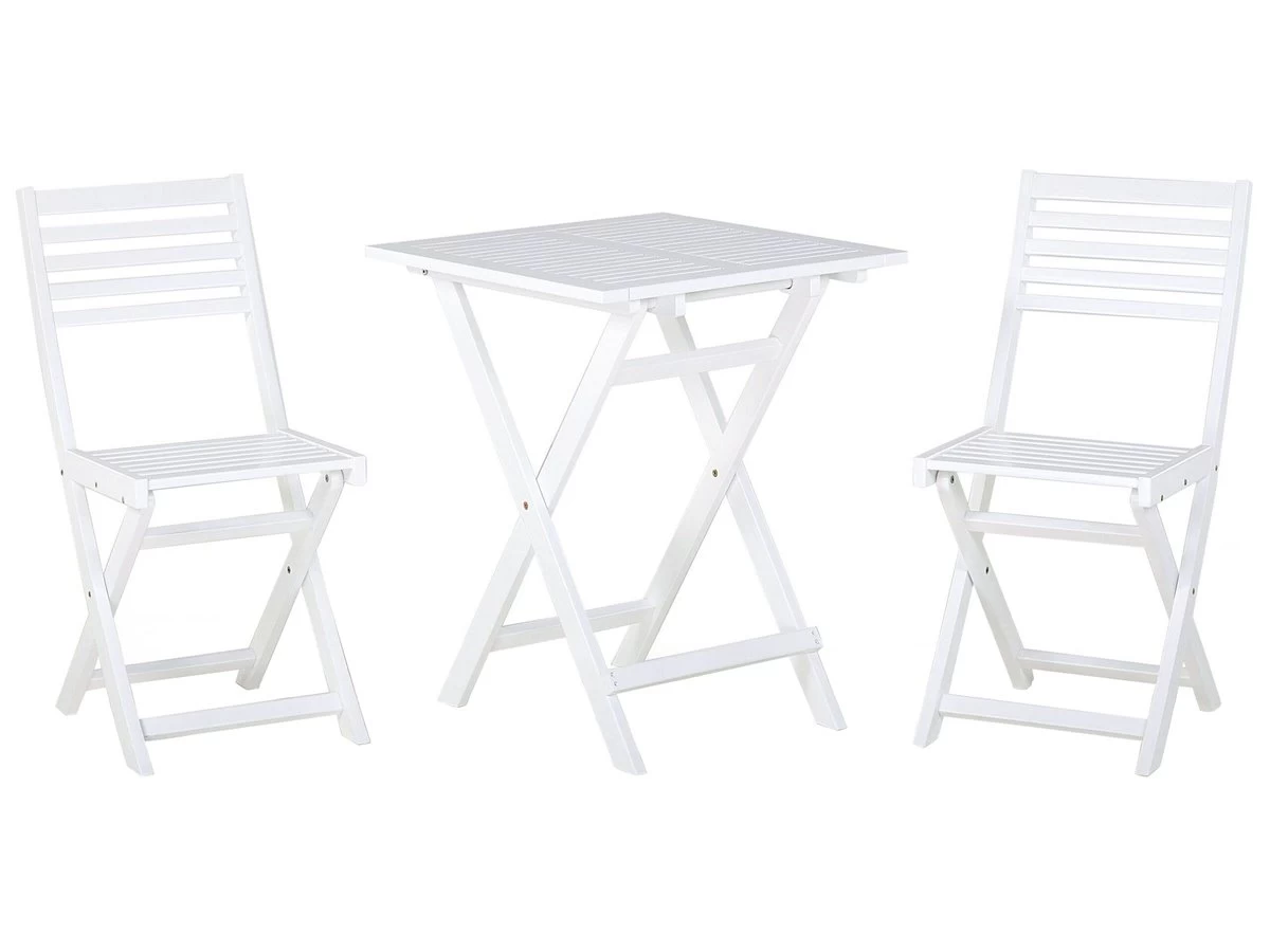 Conjunto de mesa y 2 sillas de madera. Este conjunto de balcón es una adición perfecta a cualquier jardín de estilo náutico o campestre. El juego es plegable, fácil de instalar y se puede guardar sin esfuerzo durante la temporada baja. Detalles: Tipo de Producto: Conjunto bistro Estilo: Escandinavo Color: Blanco Tipo de material: Madera maciza Material principal: Madera de acacia Material de la superficie: Madera maciza Acabado: Pintado Dimensiones: Dimensiones de la silla: 37x44x84 cm Dimensiones de la mesa de centro: 60x60x75 Altura del asiento: 45 cm Peso: 18 kg Capacidad de peso de la silla: 120 kg Capacidad de peso de la mesa: 120 kg La oferta incluye: 1 x Mesa, 2 x Silla Ventajas: Perfecto para todo tipo de exterior, Los nudos y vetas de madera natural hacen que cada pieza sea única, Materiales de la más alta calidad, Plegable para un fácil almacenamiento, Mantenimiento sencillo Información de montaje: Requiere montaje parcial. 20-40 min. Información adicional: El producto viene con un libro de cuidados detallado para ayudarte a mantener tus muebles en las mejores condiciones durante muchos años. Consulta estos consejos para garantizar el mantenimiento adecuado de tus muebles nuevos – encontrarás las instrucciones de mantenimiento junto con el manual de montaje. Texto de resistencia: Gracias a su resistencia al agua, puedes utilizar el producto al aire libre y dejarlo a la intemperie durante lluvias ligeras. Si no es posible guardarlo en un lugar cerrado y protegido, recomendamos utilizar una funda protectora. La exposición prolongada a la humedad puede provocar daños en el mueble. Resistencia: Agua ligera / humedad Consejos de mantenimiento: Madera de acacia: 1.Los muebles con acabado de aceite deben volverse a engrasar antes de ponerlos en uso y al menos una vez al año, especialmente en el clima húmedo 2.Limpiar con un limpiador suave y un paño suave en la dirección de la veta. Secar con un paño inmediatamente después de limpiar 3.Durante el invierno o en condiciones climáticas adversas, utilice una funda protectora o guarde los muebles en el interior.