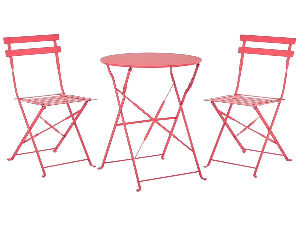 Juego de balcón de una mesa y 2 sillas. Este conjunto de balcón constituido por una mesa y 2 sillas es ideal para cualquier patio trasero o área exterior. Está fabricado a partir de acero que permite el uso en exteriores. Todos los componentes del juego son ligeros y plegables. Detalles: Tipo de Producto: Conjunto bistro Estilo: Moderno Color: Rojo Tipo de material: Acero Material principal: Acero Material de la superficie: Acero Acabado: Revestimiento en polvo Dimensiones: Dimensiones de la silla: 41x46x80 cm Dimensiones de la mesa de centro: 60x60x71 Altura del asiento: 45 cm Peso: 13 kg Capacidad de peso de la silla: 130 kg Capacidad de peso de la mesa: 60 kg La oferta incluye: 1 x Mesa, 2 x Silla Ventajas: Perfecto para todo tipo de exterior, Combina con todo tipo de decoración, No requiere mantenimiento regular, Plegable para un fácil almacenamiento, Patas con tapas antideslizantes de seguridad Información de montaje: No requiere montaje Texto de resistencia: El producto es resistente al viento, por lo que no debe volcarse ni perder estabilidad con ráfagas de viento. Resistencia: Viento Consejos de mantenimiento: Acero: 1.Durante el invierno, utilice una funda protectora o guarde los muebles en el interior 2.Durante la lluvia, se recomienda utilizar una funda protectora 3.Limpiar solo con agentes de limpieza suaves. No utilice limpiadores alcalinos o ácidos 4.Las lluvias ácidas, el agua salada y las tormentas de arena pueden dañar la capa protectora.