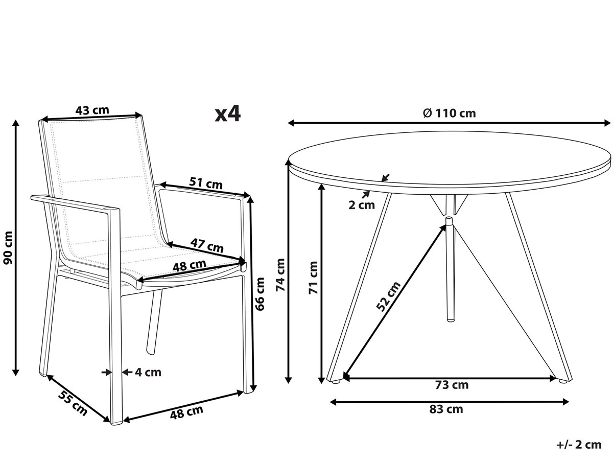 Juego de exterior. Añade a tu zona exterior este conjunto de comedor de diseño moderno. Está fabricado a partir de material duradero y de alta calidad. Las sillas tapizadas y los reposabrazos garantizan la máxima comodidad. La forma geométrica de las patas de la mesa completa el diseño. Utilizable en interiores y exteriores. Detalles: Tipo de Producto: Conjunto de comedor Estilo: Moderno Color: Negro Tipo de material: Material sintético Material principal: Aluminio Material adicional: Cerámica Composición del Material: 100% Poliéster Acabado: Revestimiento en polvo Dimensiones: Dimensiones de la silla: 48x55x90 cm Altura del asiento: 39 cm Dimensiones de la mesa: 110x110x74 cm Peso: 23 kg Capacidad de peso de la silla: 150 kg Capacidad de peso de la mesa: 70 kg La oferta incluye: 1 x Mesa, 4 x Silla Ventajas: Cojines muy cómodos para un confort ideal, Robusto marco resistente a la corrosión, Resistencia UV 5 (ISO 105-B02, Mantenimiento sencillo, Patas con tapas anti-deslizantes, Apilable, ahorra espacio Información de montaje: Requiere montaje de las patas. 20-40 min. Texto de resistencia: Gracias al acabado especial, la superficie del producto es resistente a la oxidación. Esto significa que se puede utilizar en exteriores. Cuando el producto no esté en uso, se recomienda cubrirlo con una cubierta o colocarlo en un lugar seco. Resistencia: Intemperie Consejos de mantenimiento: Aluminio: 1.Fuera de temporada, utilice una funda protectora o guarde los muebles en un lugar fresco y seco 2.Limpiar con agua jabonosa y detergentes suaves. Quitar el polvo con un paño suave. Cerámica: 1.Limpiar con un limpiador suave y un paño suave, secar después 2.El material es resistente a la intemperie, pero durante el invierno se recomienda utilizar una funda protectora o guardar los muebles en el interior. Poliéster: 1.Cuando no esté en uso, manténgalo en un lugar limpio y seco para protegerlo de las condiciones atmosféricas 2.No secar en secadora ni planchar 3.Lavar a mano únicamente, usar agua fría y un detergente suave.