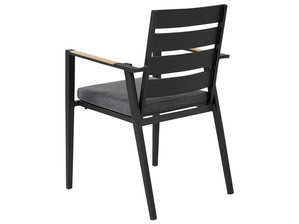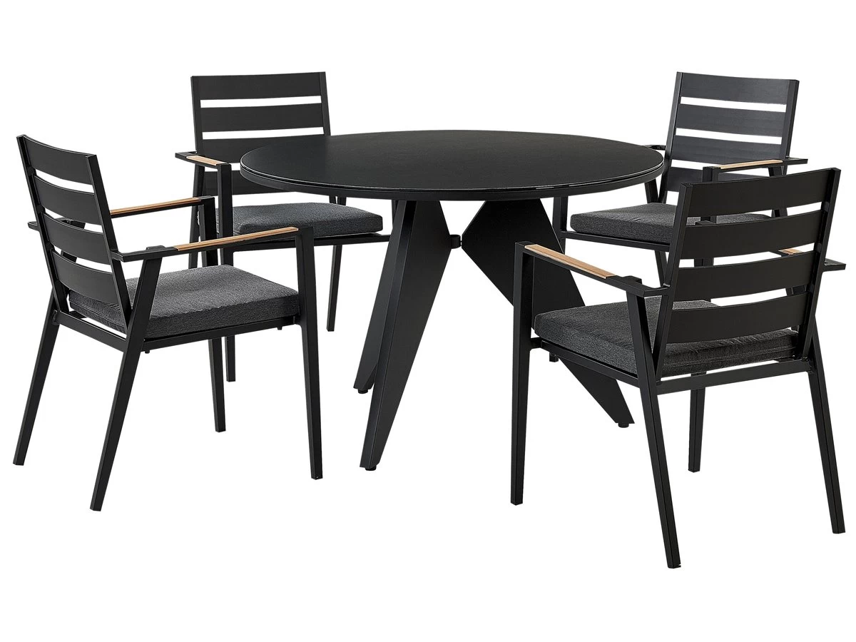 Juego de exterior. Añade elegancia a tu zona exterior con este conjunto de comedor. Está fabricado a partir de material duradero y de alta calidad. El respaldo de listones de la silla y los cojines gruesos aportan un aire de distinción. La forma geométrica de las patas de la mesa completa el diseño. Detalles: Tipo de Producto: Conjunto de comedor Estilo: Moderno Color: Negro Tipo de material: Material sintético Material principal: Aluminio Material adicional: Poliéster Composición del Material: 100% Poliéster Acabado: Revestimiento en polvo Densidad de espuma del asiento: 28 kg/m3 Dimensiones: Dimensiones de la silla: 49x54x86 cm Espesor del asiento: 5 cm Altura del asiento: 39 cm Dimensiones de la mesa: 110x110x74 cm Peso: 29 kg Capacidad de peso de la silla: 160 kg Capacidad de peso de la mesa: 70 kg La oferta incluye: 1 x Mesa, 4 x Silla, 4 x Cojín del asiento Ventajas: Cojines muy cómodos para un confort ideal, Resistencia UV, Robusto marco resistente a la corrosión, Mantenimiento sencillo, Patas con tapas anti-deslizantes, Apilable, ahorra espacio Información de montaje: Requiere montaje de las patas. 20-40 min. Texto de resistencia: Gracias al acabado especial, la superficie del producto es resistente a la oxidación. Esto significa que se puede utilizar en exteriores. Cuando el producto no esté en uso, se recomienda cubrirlo con una cubierta o colocarlo en un lugar seco. Resistencia: Intemperie Consejos de mantenimiento: Aluminio: 1.Limpiar con agua jabonosa y detergentes suaves. Quitar el polvo con un paño suave 2.Fuera de temporada, utilice una funda protectora o guarde los muebles en un lugar fresco y seco. Poliéster: 1.Cuando no esté en uso, manténgalo en un lugar limpio y seco para protegerlo de las condiciones atmosféricas 2.No secar en secadora ni planchar 3.Lavar a mano únicamente, usar agua fría y un detergente suave. Cerámica: 1.El material es resistente a la intemperie, pero durante el invierno se recomienda utilizar una funda protectora o guardar los muebles en el interior 2.Limpiar con un limpiador suave y un paño suave, secar después.