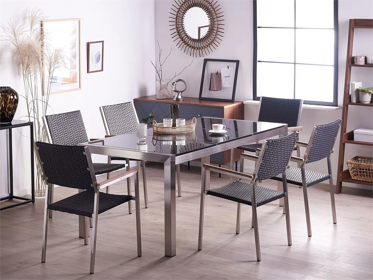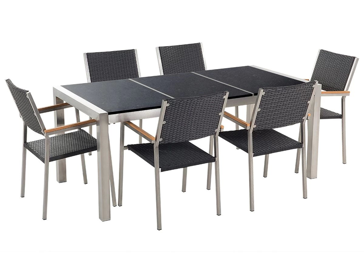 Juego de exterior. Añade elegancia a tu zona exterior con este conjunto de comedor. Está constituido por una mesa y 6 sillas. Fabricado a partir de acero inoxidable duradero y granito resistente a la intemperie. Las sillas son resistentes a los rayos UV y apilables, lo que permite ahorrar espacio. Detalles: Tipo de Producto: Conjunto de comedor Estilo: Moderno Color: Negro Tipo de material: Piedra Material principal: Acero inoxidable Material adicional: Madera plástica Material de la superficie: Piedra Acabado: Pulido Dimensiones: Dimensiones de la silla: 55x58x88 cm Altura del asiento: 44 cm Dimensiones de la mesa: 180x90x76 cm Peso: 140 kg Capacidad de peso de la silla: 160 kg Capacidad de peso de la mesa: 70 kg La oferta incluye: 1 x Mesa, 6 x Silla Ventajas: Perfecto para todo tipo de exterior, Robusto marco resistente a la corrosión, Resistencia UV 4 (ISO 105-B02, Resistente a las manchas, Material impermeable y muy fácil de conservar, Apilable para un almacenaje mejor, Montaje muy sencillo Información de montaje: Requiere montaje parcial. 20-40 min. Información adicional: El producto viene con un libro de cuidados detallado para ayudarte a mantener tus muebles en las mejores condiciones durante muchos años. Consulta estos consejos para garantizar el mantenimiento adecuado de tus muebles nuevos – encontrarás las instrucciones de mantenimiento junto con el manual de montaje. Texto de resistencia: Gracias a su resistencia al agua, puedes utilizar el producto al aire libre y dejarlo a la intemperie durante lluvias ligeras. Si no es posible guardarlo en un lugar cerrado y protegido, recomendamos utilizar una funda protectora. La exposición prolongada a la humedad puede provocar daños en el mueble. Resistencia: Agua ligera / humedad Consejos de mantenimiento: Granito: 1.Las manchas difíciles como la salsa de tomate o el vino tinto penetran rápidamente en la superficie y, por lo tanto, deben eliminarse inmediatamente 2.Seque con un paño después de limpiar 3.Durante el invierno, use una cubierta protectora o guarde los muebles en el interior 4.Utilice solo detergentes suaves o limpiadores específicos para granito. No utilice limpiadores abrasivos. Secar después de limpiar. Acero inoxidable: 1.Limpiar solo con agentes de limpieza suaves. No utilice limpiadores alcalinos o ácidos 2.Las lluvias ácidas, el agua salada y las tormentas de arena pueden dañar la capa protectora 3.Durante el invierno, utilice una funda protectora o guarde los muebles en el interior 4.Durante la lluvia, se recomienda utilizar una funda protectora. Ratán sintético: 1.Se recomienda utilizar una funda protectora para la temporada de invierno o, si es posible, para mantener los muebles secos y frescos en el interior 2.Limpiar con detergentes a base de jabón. No utilizar limpiadores químicos corrosivos 3.Los utensilios o accesorios de vidrio pueden sobrecalentar la superficie 4.Para alargar la vida útil del mueble, protéjalo de la exposición directa al sol.