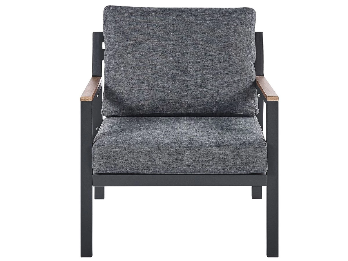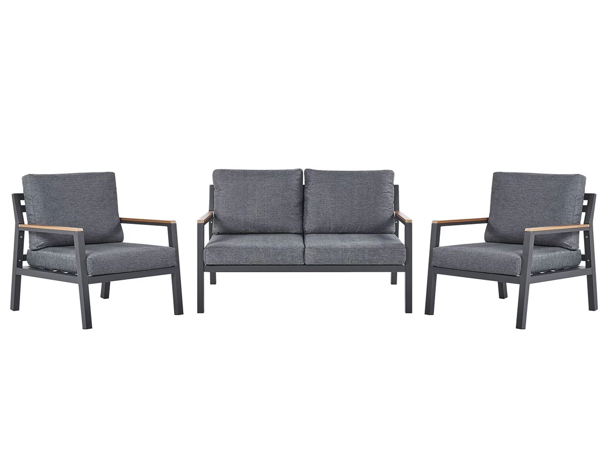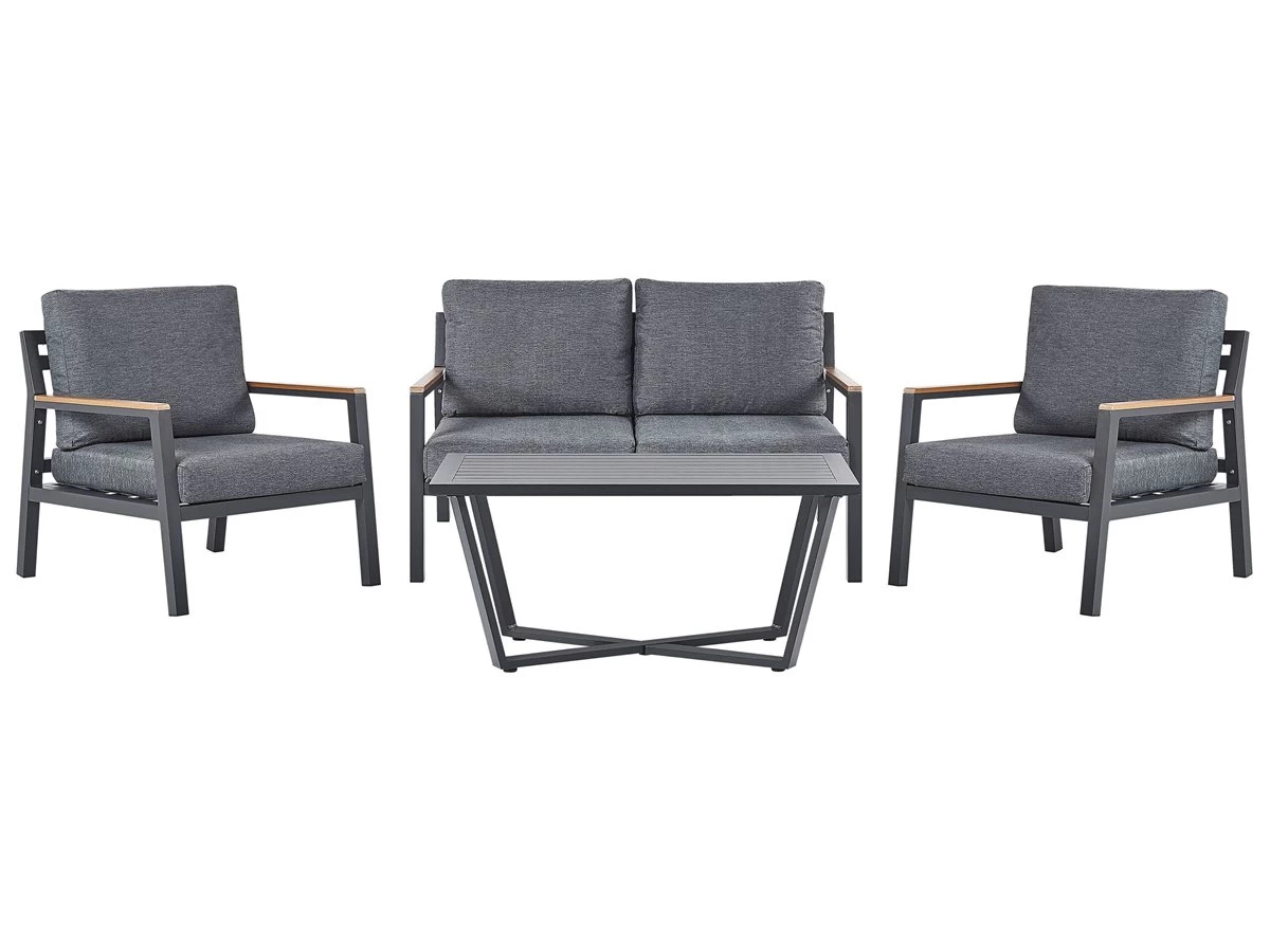 Juego de exterior con sillones y mesa. Prepara tu espacio al aire libre con este moderno conjunto de jardín. Compuesto por un sofá de dos plazas, sillones y una mesa rectangular, proporciona el suficiente espacio para que disfrutes del día soleado con tus amigos. Cada asiento contiene un cojín gris oscuro de máxima comodidad. Los marcos, hechos de aluminio de fácil mantenimiento, tienen un acabado de material similar a la madera en los apoyabrazos. Detalles: Tipo de Producto: Conjunto de jardín Estilo: Moderno Color: Negro Tonalidad: Gris oscuro Tipo de material: Metal Material principal: Aluminio Material adicional: Poliéster Material de la superficie: Metal Composición del Material: 100% Poliéster Acabado: Revestimiento en polvo Densidad de espuma del asiento: 22 kg/m3 Dimensiones: Dimensiones del sofá de 2 plazas: 128x79x70 Dimensiones del sillón: 68x79x70 Dimensiones de la mesa de centro: 100x59x46 Espesor del asiento: 10 cm Altura del asiento: 38 cm Peso: 42 kg Capacidad de peso de la mesa: 8 kg Capacidad de peso por persona: 160 kg La oferta incluye: 1 x Mesa de centro, 4 x Cojín del asiento, 4 x Cojín del respaldo, 1 x Sofá de 2 plazas, 2 x Sillón Ventajas: Brinda comodidad y relajación, Confort del asiento óptimo, Diseño elegante, Robusto marco resistente a la corrosión, Resistencia UV 4 (ISO 105-B05, Fundas extraíbles Información de montaje: Requiere montaje completo. 45-60 min. Información adicional: Evita colocar objetos de vidrio sobre la superficie del producto. Este material aumenta la temperatura de la luz solar, lo que puede causar sobrecalentamiento y daños al artículo. Texto de resistencia: El producto está hecho con tela resistente a los rayos UV, lo que significa que se puede usar bajo la luz del sol sin preocuparse por la pérdida de color. En cualquier caso, es recomendable colocar los muebles debajo de una cubierta impermeable cuando no se utilicen, para asegurar su máxima durabilidad. Resistencia: Rayos UV Consejos de mantenimiento: Aluminio: 1.Fuera de temporada, utilice una funda protectora o guarde los muebles en un lugar fresco y seco 2.Limpiar con agua jabonosa y detergentes suaves. Quitar el polvo con un paño suave. Poliéster: 1.Cuando no esté en uso, manténgalo en un lugar limpio y seco para protegerlo de las condiciones atmosféricas 2.No secar en secadora y no planchar 3.Lavar a mano o seleccionar un ciclo de lavado de lana (30 ° C, a menos que el fabricante especifique lo contrario. Lavar del revés con la cremallera cerrada.
