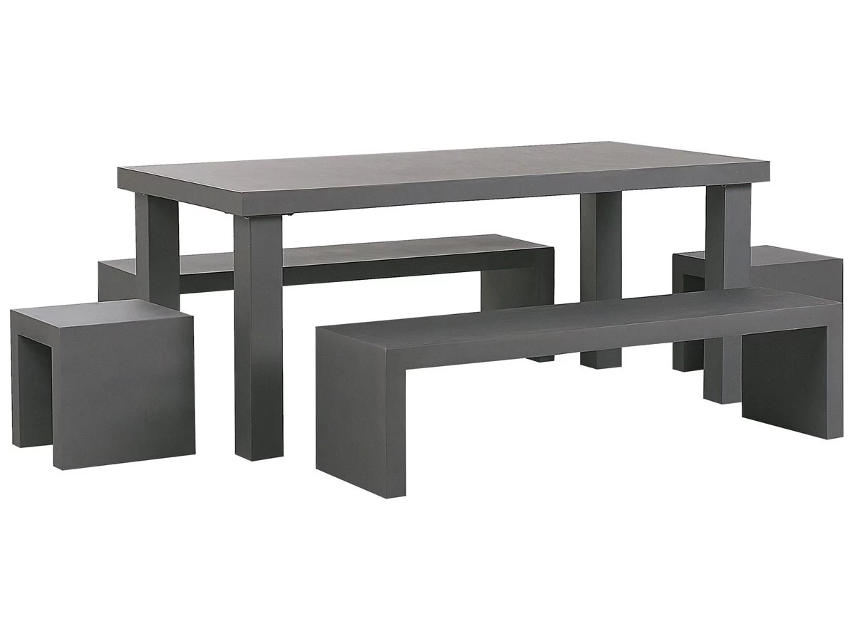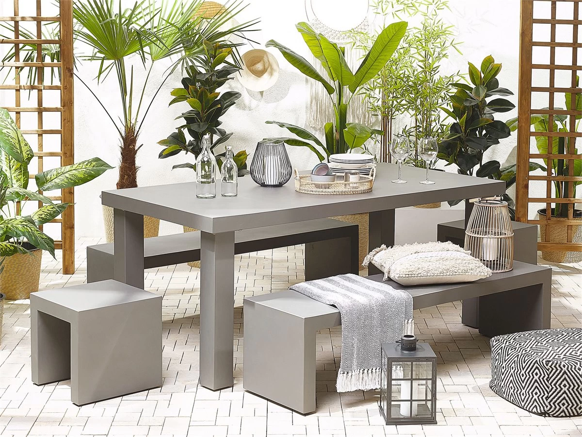 Conjunto de muebles de jardín para 6 personas. Un moderno juego de comedor de cemento que cambiará tu forma de pensar sobre esta materia prima. Con forma cuadrada y líneas simples y limpias que agregan una sensación industrial a tu exterior. Construido con cemento reforzado con un marco de acero para mayor estabilidad. De esa manera, es más liviano que el concreto sólido, lo que facilita el transporte de los muebles. El material cuidadosamente elegido es resistente a las manchas y fácil de cuidar. La forma minimalista combina perfectamente con el aspecto sencillo del clásico hormigón. Detalles: Tipo de Producto: Conjunto de comedor Estilo: Industrial Color: Gris Tipo de material: Cemento Material principal: Cemento reforzado con fibra Material adicional: Acero Material de la superficie: Cemento Acabado: Mate Dimensiones: Dimensiones del banco: 150x40x40 Dimensiones de la silla: 40x40x45 cm Altura del asiento: 40/45 cm Dimensiones de la mesa: 180x90x76 cm Peso: 136 kg Capacidad de peso de la silla: 240 kg Capacidad de peso de la mesa: 60 kg La oferta incluye: 1 x Mesa, 2 x Banco, 2 x Taburete Ventajas: Acabado de hormigón para aspecto industrial, Ideal para uso en interiores y exteriores, No requiere mantenimiento regular, Alta calidad, Estructura sólida y estable Información de montaje: Requiere montaje de las patas. 20-40 min. Información adicional: Ten en cuenta que cada modelo puede diferir ligeramente de la presentación en la imagen. La disposición de colores y piezas de material puede ser diferente. Esto se considera como la característica del producto, no su defecto. Dependiendo de la humedad del aire, los muebles de concreto pueden tener grietas, agujeros o cambiar de color. Es una característica natural del material y no afecta su calidad. Texto de resistencia: Gracias a su resistencia al agua, puedes utilizar el producto al aire libre y dejarlo a la intemperie durante lluvias ligeras. Si no es posible guardarlo en un lugar cerrado y protegido, recomendamos utilizar una funda protectora. La exposición prolongada a la humedad puede provocar daños en el mueble. Resistencia: Agua ligera / humedad Consejos de mantenimiento: Cemento: 1.Durante el invierno utilice una funda protectora o guarde los muebles en el interior 2.Para evitar manchas, no utilice detergentes cremosos o detergentes con ácidos o aceites.