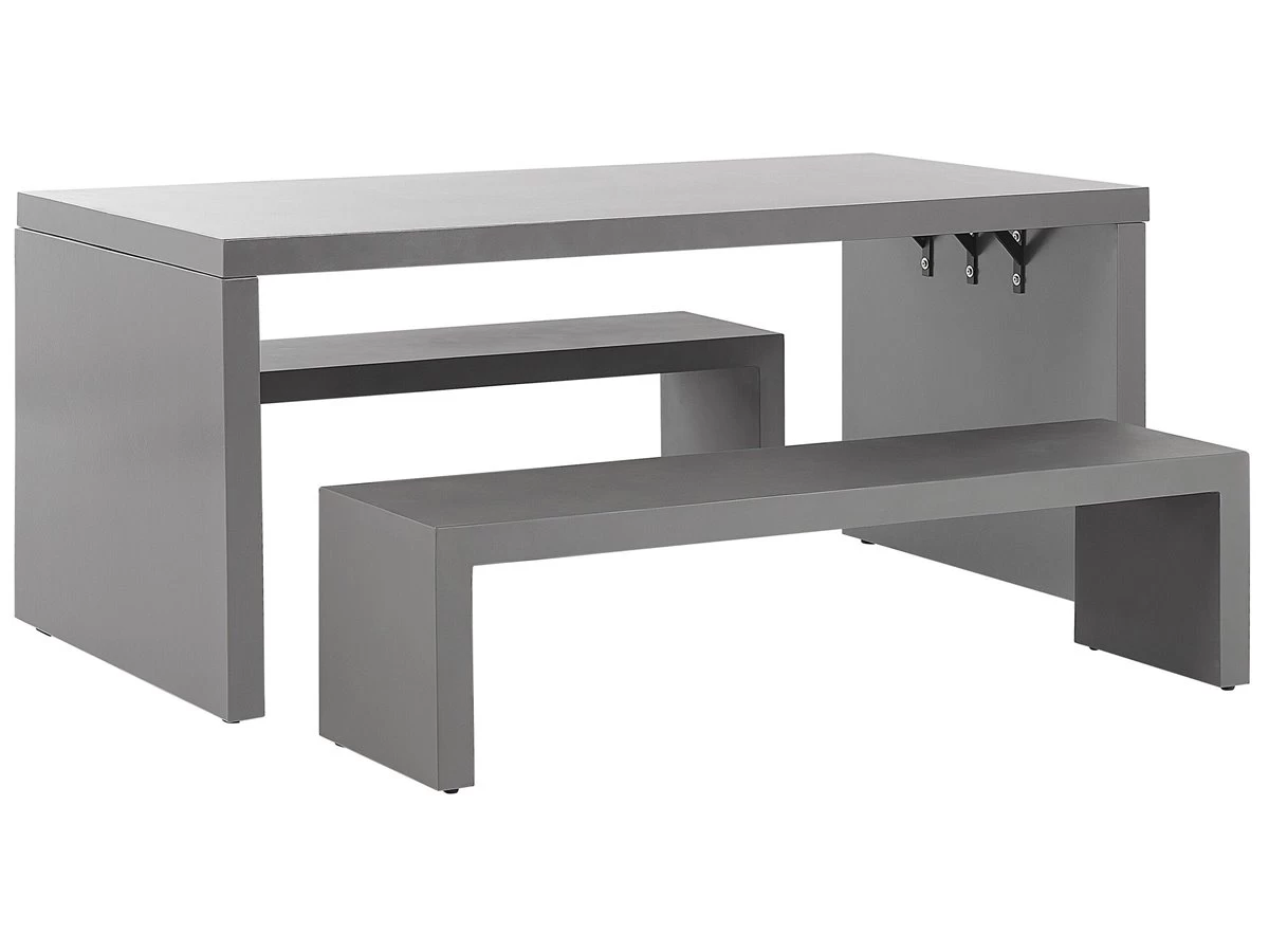 Conjunto de jardín de hormigón mesa y 2 bancos en forma de U. Este conjunto de jardín cambiará tu manera de pensar sobre el cemento. Constituido por una mesa y dos bancos, las líneas limpias añaden un toque industrial a tu exterior. Fabricada a partir de cemento reforzado con un marco de acero, la mesa es robusta e increíblemente elegante. El material elegido es resistente a las manchas y de fácil mantenimiento. La forma minimalista combina perfectamente con el aspecto sencillo hormigón. Detalles: Tipo de Producto: Conjunto de comedor Estilo: Industrial Color: Gris Tipo de material: Cemento Material principal: Cemento reforzado con fibra Material adicional: Acero Material de la superficie: Cemento Acabado: Mate Dimensiones: Dimensiones del banco: 150x40x40 Altura del asiento: 40 cm Dimensiones de la mesa: 180x90x78 cm Peso: 130 kg Capacidad de peso de la mesa: 90 kg La oferta incluye: 1 x Mesa, 2 x Banco Ventajas: Acabado de hormigón para aspecto industrial, Fabricación sólida y precisa, Ideal para uso en interiores y exteriores, Construcción muy estable, Mantenimiento sencillo Información de montaje: Requiere montaje de las patas. 20-40 min. Información adicional: Ten en cuenta que cada modelo puede diferir ligeramente de la presentación en la imagen. La disposición de colores y piezas de material puede ser diferente. Esto se considera como la característica del producto, no su defecto. Dependiendo de la humedad del aire, los muebles de concreto pueden tener grietas, agujeros o cambiar de color. Es una característica natural del material y no afecta su calidad. Texto de resistencia: Gracias a su resistencia al agua, puedes utilizar el producto al aire libre y dejarlo a la intemperie durante lluvias ligeras. Si no es posible guardarlo en un lugar cerrado y protegido, recomendamos utilizar una funda protectora. La exposición prolongada a la humedad puede provocar daños en el mueble. Resistencia: Agua ligera / humedad Consejos de mantenimiento: Cemento reforzado con fibra: 1.Durante el invierno utilice una funda protectora o guarde los muebles en el interior 2.Para evitar manchas, no utilice detergentes cremosos o detergentes con ácidos o aceites.