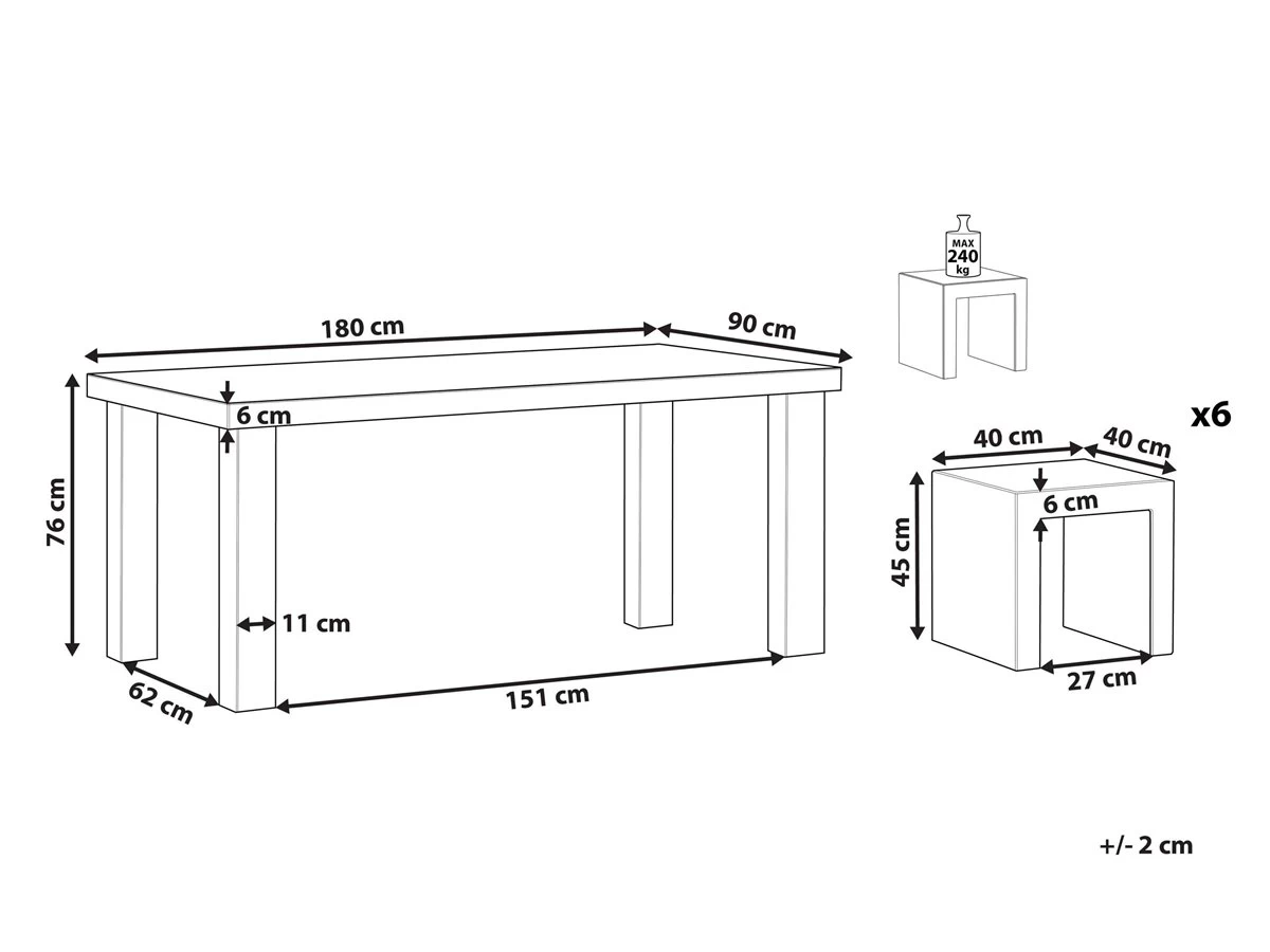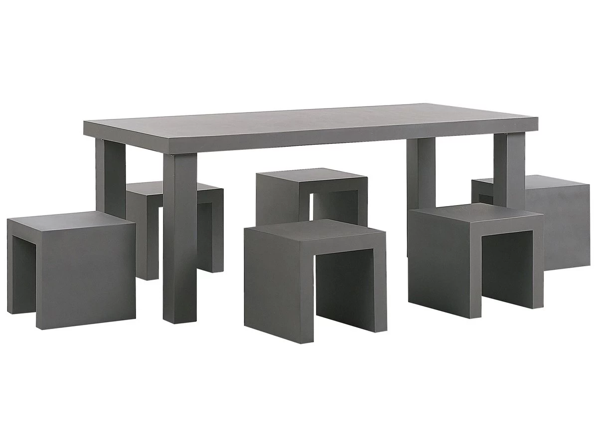 Conjunto de mesa y sillas para exterior. Un moderno juego de comedor de cemento que cambiará tu forma de pensar sobre este material. Con su forma cuadrada y líneas simples y limpias agregará una sensación industrial a tu exterior. Construido con cemento reforzado con un marco de acero para mayor estabilidad. De esa manera, es más liviano que el concreto sólido, lo que facilita el transporte de los muebles. El material cuidadosamente elegido es resistente a las manchas y fácil de cuidar. La forma minimalista combina perfectamente con el aspecto sencillo del clásico hormigón. Detalles: Tipo de Producto: Conjunto de comedor Estilo: Industrial Color: Gris Tipo de material: Cemento Material principal: Cemento reforzado con fibra Material adicional: Acero Material de la superficie: Cemento Acabado: Mate Dimensiones: Dimensiones de la silla: 40x40x45 cm Altura del asiento: 45 cm Dimensiones de la mesa: 180x90x76 cm Peso: 103 kg Capacidad de peso de la silla: 240 kg Capacidad de peso de la mesa: 90 kg La oferta incluye: 1 x Mesa, 6 x Taburete Ventajas: Acabado de hormigón para aspecto industrial, Ideal para uso en interiores y exteriores, No requiere mantenimiento regular, Alta calidad, Estructura sólida y estable Información de montaje: Requiere montaje de las patas. 20-40 min. Información adicional: Ten en cuenta que cada modelo puede diferir ligeramente de la presentación en la imagen. La disposición de colores y piezas de material puede ser diferente. Esto se considera como la característica del producto, no su defecto. Dependiendo de la humedad del aire, los muebles de concreto pueden tener grietas, agujeros o cambiar de color. Es una característica natural del material y no afecta su calidad. Texto de resistencia: Gracias a su resistencia al agua, puedes utilizar el producto al aire libre y dejarlo a la intemperie durante lluvias ligeras. Si no es posible guardarlo en un lugar cerrado y protegido, recomendamos utilizar una funda protectora. La exposición prolongada a la humedad puede provocar daños en el mueble. Resistencia: Agua ligera / humedad Consejos de mantenimiento: Cemento: 1.Para evitar manchas, no utilice detergentes cremosos o detergentes con ácidos o aceites 2.Durante el invierno utilice una funda protectora o guarde los muebles en el interior.