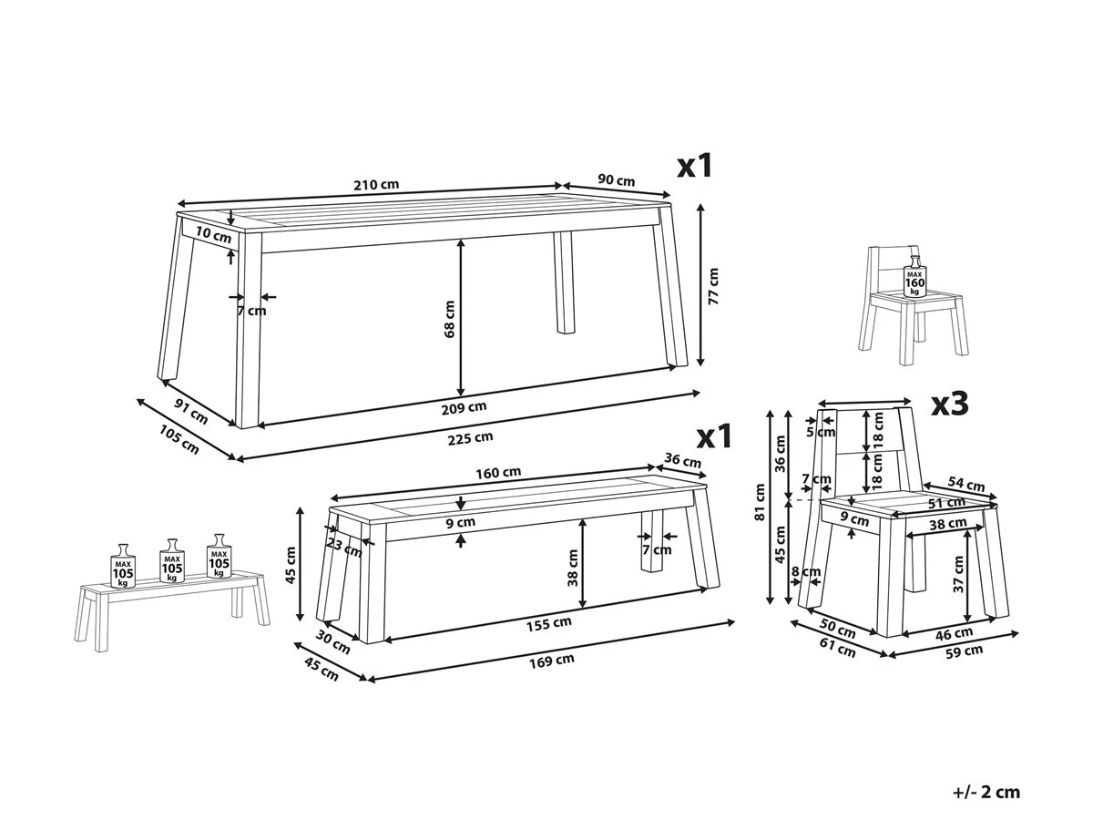 Conjunto de jardín de madera de acacia para 6 personas. Añade un toque rústico a tu interior o exterior con este práctico y elegante conjunto de jardín. La mesa, el banco y las 3 sillas ofrecen capacidad para 6 personas, con espacio suficiente para platos, aperitivos y bebidas. Este conjunto está hecho completamente de madera maciza de acacia que garantiza durabilidad y estabilidad. El color de la madera natural combinado con un diseño de líneas limpias combina con cualquier estilo de decoración. Detalles: Tipo de Producto: Conjunto de comedor Estilo: Tradicional Color: Madera clara Tipo de material: Madera maciza Material principal: Madera de acacia Material de la superficie: Madera maciza Acabado: Aceitado Dimensiones: Dimensiones del banco: 169x45x45 Dimensiones de la silla: 59x61x81 cm Altura del asiento: 46 cm Dimensiones de la mesa: 225x105x77 cm Dimensiones totales: 210x90x77 Peso: 92 kg Capacidad de peso de la silla: 160 kg Capacidad de peso de la mesa: 80 kg La oferta incluye: 1 x Mesa, 1 x Banco, 3 x Silla Ventajas: Asiento extremadamente cómodo, Perfecto para todo tipo de exterior, Materiales de la más alta calidad, No requiere mantenimiento regular, Ideal para uso en interiores y exteriores, Anchas patas de soporte que proporcionan la máxima estabilización Información de montaje: Requiere montaje completo. Más de 60 min. Información adicional: Por favor, ten en cuenta que la madera es un producto natural, y cada pieza puede presentar ligeras variaciones. Las diferencias en el color o la textura, como las arrugas u otras características naturales, no se consideran un defecto ni tampoco una base de reclamación, El producto viene con un libro de cuidados detallado para ayudarte a mantener tus muebles en las mejores condiciones durante muchos años. Consulta estos consejos para garantizar el mantenimiento adecuado de tus muebles nuevos – encontrarás las instrucciones de mantenimiento junto con el manual de montaje. Texto de resistencia: Gracias a su resistencia al agua, puedes utilizar el producto al aire libre y dejarlo a la intemperie durante lluvias ligeras. Si no es posible guardarlo en un lugar cerrado y protegido, recomendamos utilizar una funda protectora. La exposición prolongada a la humedad puede provocar daños en el mueble. Resistencia: Agua ligera / humedad Consejos de mantenimiento: Madera de acacia: 1.Durante el invierno o en condiciones climáticas adversas, utilice una funda protectora o guarde los muebles en el interior 2.Los muebles con acabado de aceite deben volverse a engrasar antes de ponerlos en uso y al menos una vez al año, especialmente en el clima húmedo 3.Limpiar con un limpiador suave y un paño suave en la dirección de la veta. Secar con un paño inmediatamente después de limpiar.