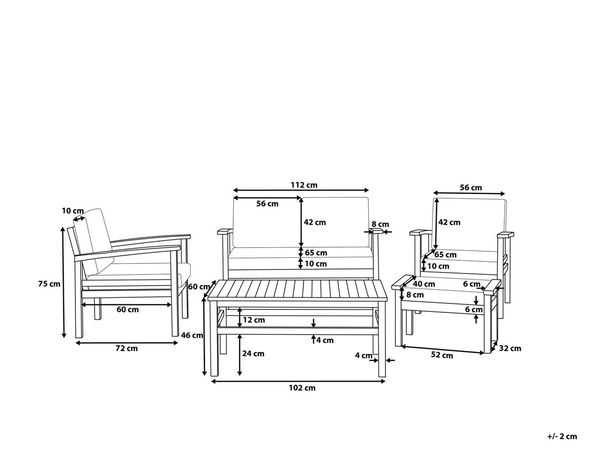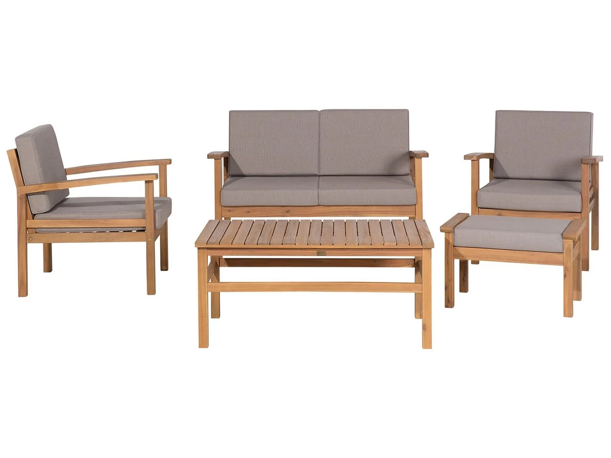 Conjunto de jardín de 5 piezas, en madera de acacia . Complementa el mobiliario de tu jardín con este encantador juego de jardín, compuesto por una mesa, biplaza, juego de sillones y otomana. La madera de acacia resistente proporciona a los muebles una durabilidad excepcional. El juego de jardín viene con un juego de cojines a juego, cada uno con un acolchado grueso para brindarte una experiencia de asiento absolutamente cómoda. Mantenido en un diseño campestre atemporal, el conjunto le ayuda a cumplir tus sueños de un jardín maravilloso. Detalles: Tipo de Producto: Conjunto de jardín Estilo: Moderno Color: Madera clara Tonalidad: Gris pardo Tipo de material: Madera maciza Material principal: Madera de acacia Material adicional: Poliéster Material de la superficie: Madera maciza Composición del Material: 100% Poliéster Acabado: Aceitado Densidad de espuma del asiento: 20 kg/m3 Dimensiones: Dimensiones del sillón: 72x72x75 Dimensiones del banco: 112x72x75 Dimensiones de la mesa de centro: 102x60x46 Dimensiones del reposapies: 64x44x40 cm Espesor del asiento: 10 cm Altura del asiento: 40 cm Peso: 76 kg Capacidad de peso de la mesa: 50 kg Capacidad de peso por persona: 130 kg La oferta incluye: 1 x Mesa, 1 x Banco, 2 x Sillón, 1 x Puf, 5 x Cojín del asiento, 4 x Cojín del respaldo Ventajas: Combina con todo tipo de decoración, Perfecto para todo tipo de exterior, Resistencia UV 3 (ISO 105-B02, Ideal para uso al aire libre, Fundas extraíbles, Materiales naturales Información de montaje: Requiere montaje completo. Más de 60 min. Información adicional: El producto viene con un libro de cuidados detallado para ayudarte a mantener tus muebles en las mejores condiciones durante muchos años. Consulta estos consejos para garantizar el mantenimiento adecuado de tus muebles nuevos – encontrarás las instrucciones de mantenimiento junto con el manual de montaje. Texto de resistencia: Gracias a su resistencia al agua, puedes utilizar el producto al aire libre y dejarlo a la intemperie durante lluvias ligeras. Si no es posible guardarlo en un lugar cerrado y protegido, recomendamos utilizar una funda protectora. La exposición prolongada a la humedad puede provocar daños en el mueble. Resistencia: Agua ligera / humedad Consejos de mantenimiento: Madera de acacia: 1.Durante el invierno o en condiciones climáticas adversas, utilice una funda protectora o guarde los muebles en el interior 2.Los muebles con acabado de aceite deben volverse a engrasar antes de ponerlos en uso y al menos una vez al año, especialmente en el clima húmedo 3.Limpiar con un limpiador suave y un paño suave en la dirección de la veta. Secar con un paño inmediatamente después de limpiar. Poliéster: 1.Lavar a mano únicamente, usar agua fría y un detergente suave 2.Cuando no esté en uso, manténgalo en un lugar limpio y seco para protegerlo de las condiciones atmosféricas 3.No secar en secadora ni planchar.
