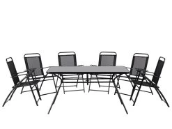 Juego de exterior negro de mesa y 6 sillas. Este práctico juego de mesa y 6 sillas ofrece muchísimas posibilidades de organización para tu exterior. Elaborado por materiales de la más alta calidad, el conjunto cuenta con una elegante mesa con estructura en metal y tablero en vidrio templado y con 6 confortables sillas también de metal. Pensado por un uso al aire libre, el mueble será la elección ideal para un jardín o una terraza. Gracias al revestimiento en polvo antioxidante, el juego resiste a la intemperie, garantizándole una larga vida útil. Detalles: Tipo de Producto: Conjunto de comedor Estilo: Moderno Color: Negro Tipo de material: Acero Material principal: Acero Material adicional: Vidrio templado Material de la superficie: Vidrio Composición del Material: 90% PVC Acabado: Brillante Dimensiones: Dimensiones de la silla: 48x66x90 cm Altura del asiento: 38 cm Dimensiones de la mesa: 140x80x73 cm Dimensiones totales: 180x90x76 Peso: 48 kg Capacidad de peso de la silla: 110 kg Capacidad de peso de la mesa: 75 kg La oferta incluye: 1 x Mesa, 6 x Silla Ventajas: Respaldo alto y asiento muy cómodo, Cómodos apoyabrazos, Material ligero y durable, Resiste a todo tipo de clima, Material impermeable y muy fácil de conservar, Resistencia UV 4 (ISO 105-B05, Plegable para un fácil almacenamiento, Apilable para un almacenaje mejor, Tablero en vidrio templado de seguridad Información de montaje: Requiere montaje parcial. 20-40 min. Texto de resistencia: Gracias a su resistencia al agua, puedes utilizar el producto al aire libre y dejarlo a la intemperie durante lluvias ligeras. Si no es posible guardarlo en un lugar cerrado y protegido, recomendamos utilizar una funda protectora. La exposición prolongada a la humedad puede provocar daños en el mueble. Resistencia: Agua ligera / humedad Consejos de mantenimiento: Vidrio templado: 1.Para evitar rayones, no use un limpiador cremoso 2.Si el producto presenta un efecto de cristal agrietado, es importante protegerlo de la humedad 3.Limpiar con un detergente suave o acondicionador de vidrio con un paño suave. Secar después de limpiar 4.Secar después de la lluvia o la nieve. Durante el invierno, utilice una funda protectora o guarde los muebles en el interior. Acero: 1.Quite las tapas protectoras con regularidad para que salga todo el líquido, déjelas secar y utilice un spray anticorrosión si es necesario 2.Limpiar con detergentes suaves 3.Los muebles de acero y sus elementos no deben exponerse al agua. De lo contrario, existe la posibilidad de que el agua oxidada salga de las tuberías del marco 4.Cuando no estén en uso, los muebles deben guardarse en el interior o bajo una cubierta protectora 5.Para aumentar la durabilidad del artículo, manténgalo seco y recuerde la limpieza regular 6.Cualquier daño a la capa de pintura exterior debe protegerse de la humedad 7.Para garantizar la protección contra la corrosión, evite los limpiadores alcalinos o ácidos. Después de limpiar, secar bien. Textil trenzado: 1.El material es extremadamente resistente a la intemperie. Sin embargo, se recomienda utilizar una funda protectora para la temporada de invierno o, si es posible, guardar los muebles en un lugar fresco y seco 2.Limpiar con un limpiador a base de jabón suave y un paño suave, 3.Manténgalo alejado de fuentes de calor, como parrilla o fuego, ya que las chispas pueden causar daños graves. No coloque utensilios calientes directamente sobre la superficie