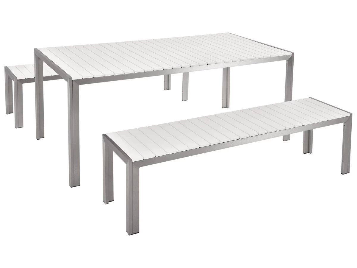 Conjunto de exterior Mesa y 2 Bancos. Este moderno juego de comedor al aire libre iluminará tu jardín o patio, dándole un toque elegante. Hecho de materiales resistentes y duraderos, incluido un marco de aluminio cepillado, el conjunto demuestra ser resistente y duradero. Sus amplios asientos garantizan suficiente espacio y comodidad para todos sus invitados y familiares. El diseño de transición del conjunto se ve mejor cuando se combina con cualquier decoración contemporánea o moderna. Detalles: Tipo de Producto: Conjunto de comedor Estilo: Industrial Color: Blanco Tipo de material: Material sintético Material principal: Madera plástica Material adicional: Aluminio Material de la superficie: Material sintético Acabado: Revestimiento en polvo Dimensiones: Dimensiones del banco: 165x40x45 Altura del asiento: 45 cm Dimensiones de la mesa: 180x90x75 cm Peso: 56 kg Capacidad de peso de la mesa: 100 kg La oferta incluye: 1 x Mesa, 2 x Banco Ventajas: Asiento extremadamente cómodo, Perfecto para todo tipo de exterior, Resistencia UV, Muy fácil de conservar, Robusto marco resistente a la corrosión, Ideal para uso al aire libre, Resiste a todo tipo de clima Información de montaje: Requiere montaje parcial. 45-60 min. Información adicional: Evita colocar objetos de vidrio sobre la superficie del producto. Este material aumenta la temperatura de la luz solar, lo que puede causar sobrecalentamiento y daños al artículo. El producto viene con un libro de cuidados detallado para ayudarte a mantener tus muebles en las mejores condiciones durante muchos años. Consulta estos consejos para garantizar el mantenimiento adecuado de tus muebles nuevos – encontrarás las instrucciones de mantenimiento junto con el manual de montaje. Texto de resistencia: Gracias al acabado especial, la superficie del producto es resistente a la oxidación. Esto significa que se puede utilizar en exteriores. Cuando el producto no esté en uso, se recomienda cubrirlo con una cubierta o colocarlo en un lugar seco. Resistencia: Intemperie Consejos de mantenimiento: Madera plástica: 1.El material es extremadamente resistente a la intemperie. Sin embargo, se recomienda utilizar una funda protectora para la temporada de invierno o, si es posible, guardar los muebles en un lugar fresco y seco 2.Manténgalo alejado de fuentes de calor, como parrilla o fuego, ya que las chispas pueden causar daños graves. No coloque utensilios calientes directamente sobre la superficie, 3.Limpiar con un limpiador a base de jabón suave y un paño suave Aluminio: 1.Fuera de temporada, utilice una funda protectora o guarde los muebles en un lugar fresco y seco 2.Limpiar con agua jabonosa y detergentes suaves. Quitar el polvo con un paño suave.