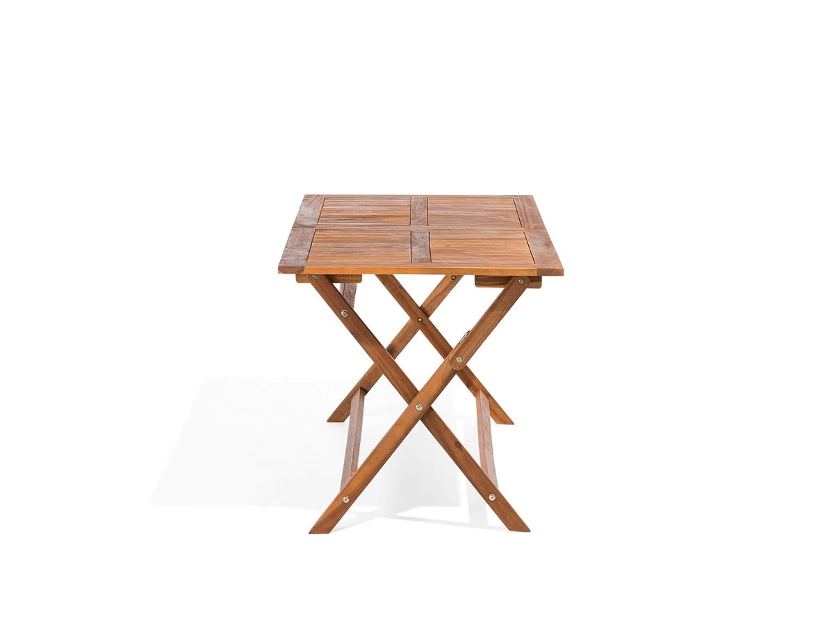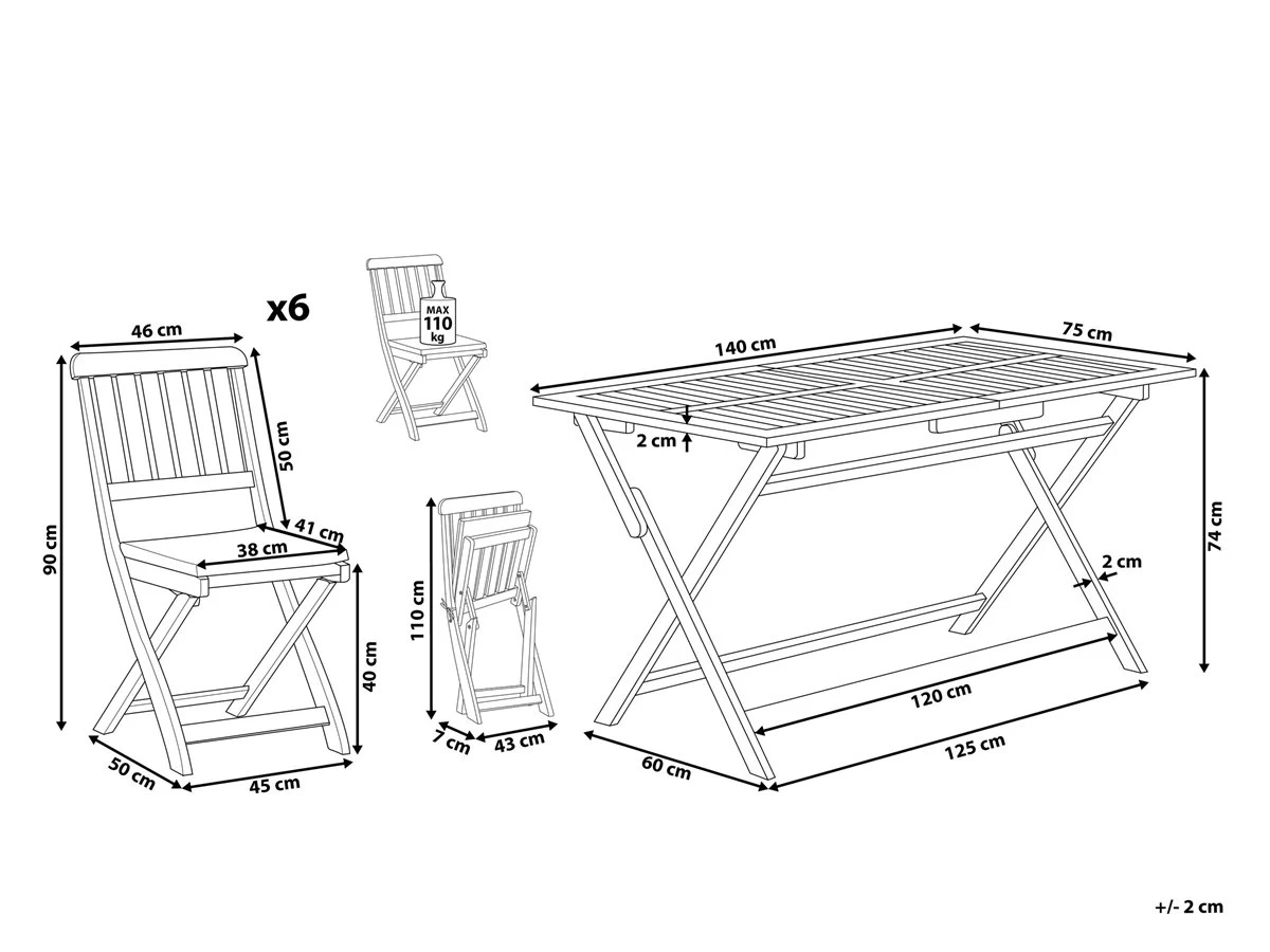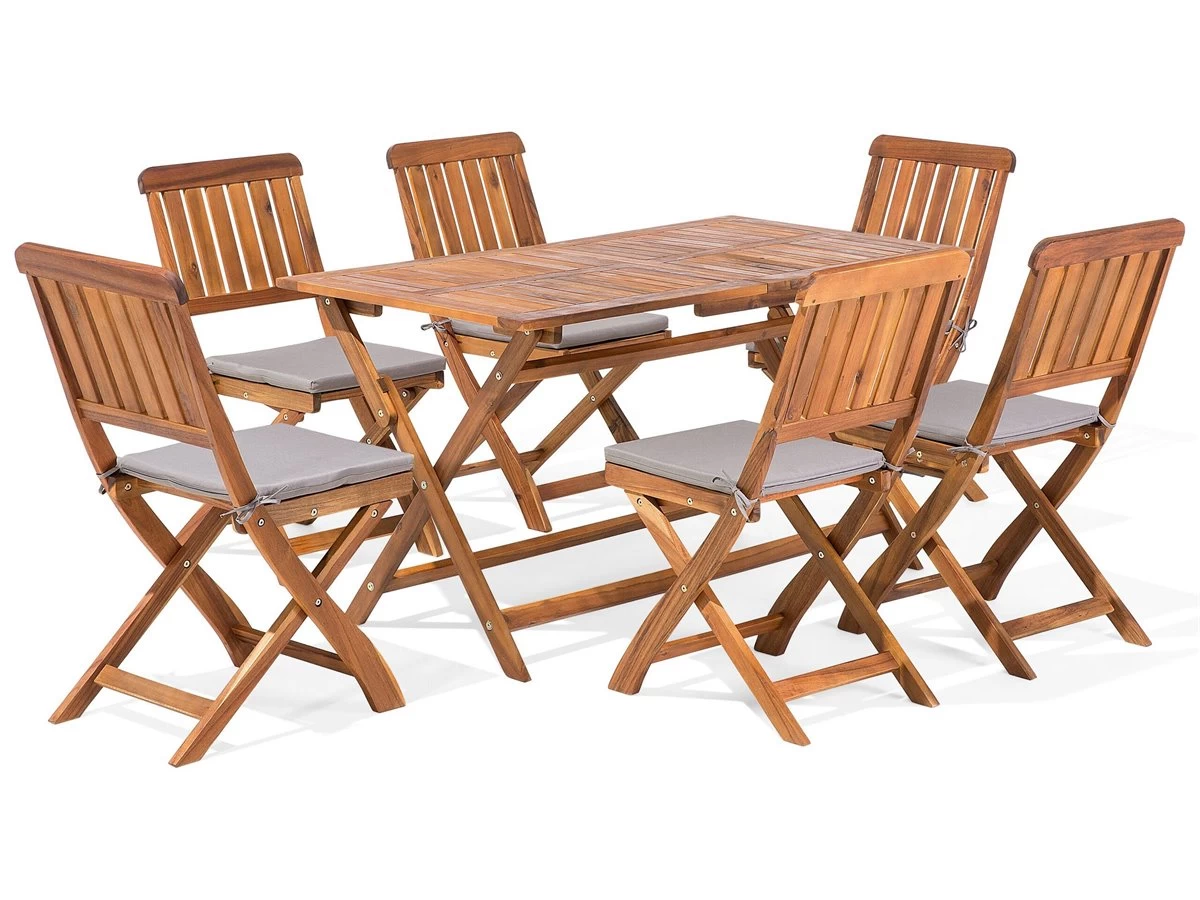 Conjunto de jardín de madera de acacia con estilo rústico. A todos nos gusta pasar los días soleados y cálidas noches de verano en el jardín disfrutando de estos momentos maravillosos rodeados de familia y amigos. Este conjunto de jardín viene con 6 prácticas y cómodas sillas. La mesa rectangular es un sitio perfecto para hacer una barbacoa o tomar un café. El conjunto está elaborado de madera de acacia engrasada, lo que garantiza su durabilidad y facilidad de limpiar. Detalles: Tipo de Producto: Conjunto de comedor Estilo: Rústico Color: Madera oscura Tipo de material: Madera maciza Material principal: Madera de acacia Material adicional: Poliéster Material de la superficie: Madera maciza Composición del Material: 100% Poliéster Acabado: Aceitado Densidad de espuma del asiento: 18 kg/m3 Dimensiones: Dimensiones de la silla: 46x50x90 cm Espesor del asiento: 3 cm Altura del asiento: 40 cm Dimensiones de la mesa: 140x75x74 cm Peso: 30 kg Capacidad de peso de la silla: 110 kg Capacidad de peso de la mesa: 110 kg La oferta incluye: 1 x Mesa, 6 x Silla, 6 x Cojines del asiento Ventajas: Las tiras ofrecen una fijación segura, Diseño atemporal, Resistencia UV 4 (ISO 105-B02, Plegable para un fácil almacenamiento, Fundas extraíbles Información de montaje: Requiere montaje parcial. 20-40 min. Información adicional: Por favor, ten en cuenta que la madera es un producto natural, y cada pieza puede presentar ligeras variaciones. Las diferencias en el color o la textura, como las arrugas u otras características naturales, no se consideran un defecto ni tampoco una base de reclamación, El producto viene con un libro de cuidados detallado para ayudarte a mantener tus muebles en las mejores condiciones durante muchos años. Consulta estos consejos para garantizar el mantenimiento adecuado de tus muebles nuevos – encontrarás las instrucciones de mantenimiento junto con el manual de montaje. Texto de resistencia: Gracias a su resistencia al agua, puedes utilizar el producto al aire libre y dejarlo a la intemperie durante lluvias ligeras. Si no es posible guardarlo en un lugar cerrado y protegido, recomendamos utilizar una funda protectora. La exposición prolongada a la humedad puede provocar daños en el mueble. Resistencia: Agua ligera / humedad Consejos de mantenimiento: Madera de acacia: 1.Durante el invierno o en condiciones climáticas adversas, utilice una funda protectora o guarde los muebles en el interior 2.Los muebles con acabado de aceite deben volverse a engrasar antes de ponerlos en uso y al menos una vez al año, especialmente en el clima húmedo 3.Limpiar con un limpiador suave y un paño suave en la dirección de la veta. Secar con un paño inmediatamente después de limpiar.