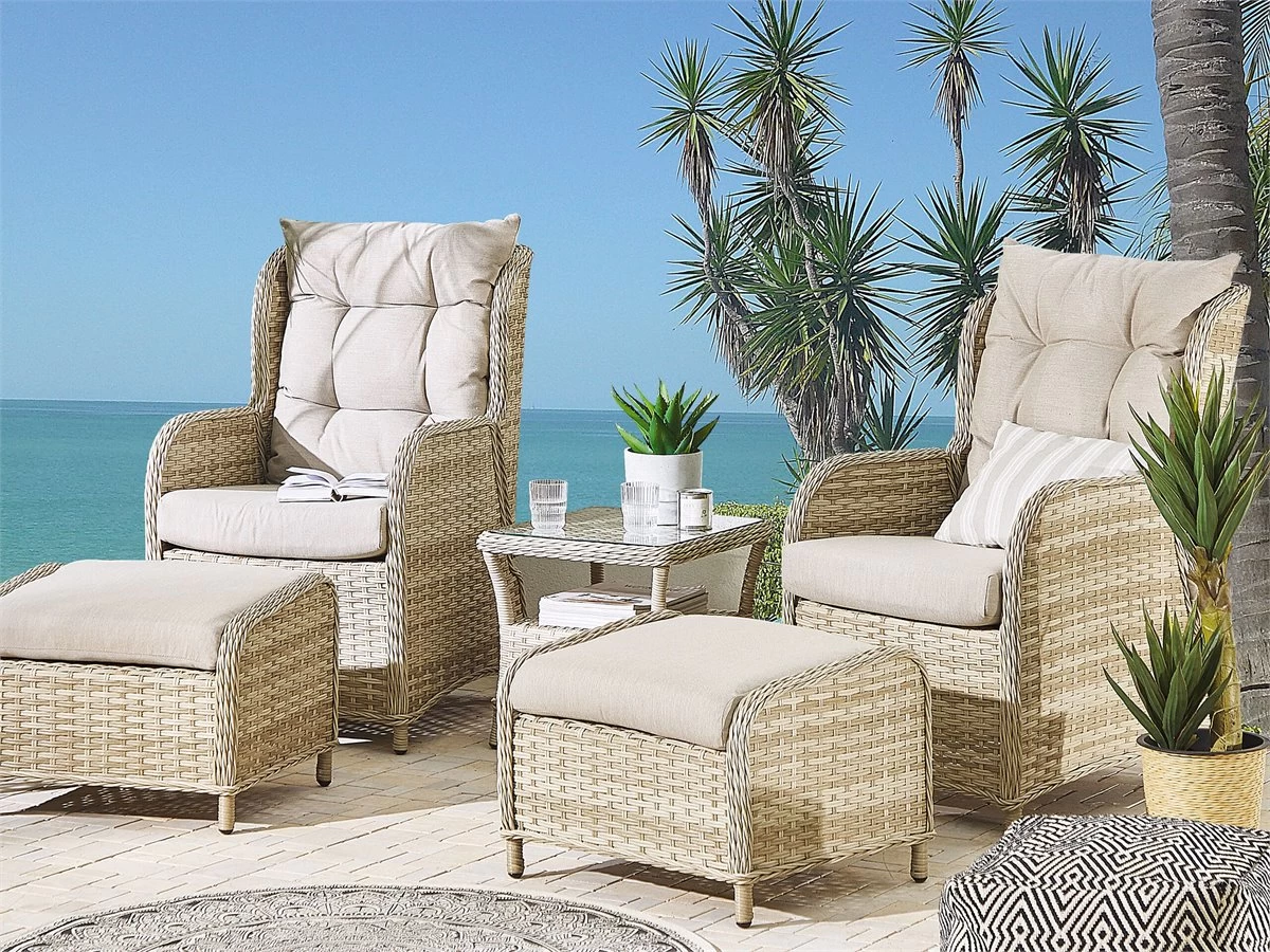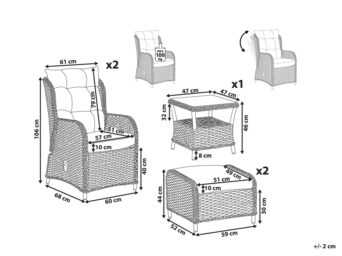 Juego de mimbre reclinable . Relájate en este cómodo jardín para dos. Consiste en dos sillones de respaldo alto combinados con reposapiés a juego y cojines gruesos y ofrece un lugar acogedor para descansar durante las noches cálidas de verano. Viene con una pequeña mesa de centro con tapa de vidrio templado y un estante adicional para libros, revistas o decoraciones. Con el marco fabricado en aluminio resistente y un cuerpo de ratán sintético duradero, este conjunto soporta condiciones climáticas adversas. Las piezas son fáciles de limpiar y los cojines de los asientos se pueden lavar y refrescar gracias a las fundas con cremallera. El conjunto se ve perfecto combinado con accesorios tradicionales o boho. Detalles: Tipo de Producto: Conjunto longue Estilo: Boho Color: Beige Tonalidad: Gris pardo Tipo de material: Ratán sintético Material principal: Ratán sintético Material adicional: Aluminio Material de la superficie: Vidrio Composición del Material: 100% Poliéster Acabado: Revestimiento en polvo Densidad de espuma del asiento: 25 kg/m3 Dimensiones: Dimensiones del sillón: 106x61x68 Dimensiones de la mesa de centro: 46x47x47 Dimensiones del reposapies: 44x52x59 cm Espesor del asiento: 10 cm Altura del asiento: 40 cm Peso: 46 kg Capacidad de peso de la mesa: 30 kg Capacidad de peso por persona: 100 kg La oferta incluye: 2 x Sillón, 2 x Taburete, 1 x Mesa de centro, 2 x Cojines del asiento, 2 x Cojín del respaldo, 2 x Cojín Ventajas: Práctico reposapiés, Perfecto para todo tipo de exterior, Muy fácil de conservar, Resistente a las bajas y altas temperaturas, Resistencia UV 5 (ISO 105-B02, Fundas extraíbles, Tablero en vidrio templado de seguridad, Respaldo ajustable Información de montaje: No requiere montaje Información adicional: El producto viene con un libro de cuidados detallado para ayudarte a mantener tus muebles en las mejores condiciones durante muchos años. Consulta estos consejos para garantizar el mantenimiento adecuado de tus muebles nuevos – encontrarás las instrucciones de mantenimiento junto con el manual de montaje. Texto de resistencia: Gracias a su resistencia al agua, puedes utilizar el producto al aire libre y dejarlo a la intemperie durante lluvias ligeras. Si no es posible guardarlo en un lugar cerrado y protegido, recomendamos utilizar una funda protectora. La exposición prolongada a la humedad puede provocar daños en el mueble. Resistencia: Agua ligera / humedad Consejos de mantenimiento: Ratán sintético: 1.Se recomienda utilizar una funda protectora para la temporada de invierno o, si es posible, para mantener los muebles secos y frescos en el interior 2.Limpiar con detergentes a base de jabón. No utilizar limpiadores químicos corrosivos 3.Los utensilios o accesorios de vidrio pueden sobrecalentar la superficie 4.Para alargar la vida útil del mueble, protéjalo de la exposición directa al sol. Poliéster: 1.Lavar a mano únicamente, usar agua fría y un detergente suave 2.Cuando no esté en uso, manténgalo en un lugar limpio y seco para protegerlo de las condiciones atmosféricas 3.No secar en secadora ni planchar. Vidrio templado: 1.Secar después de la lluvia o la nieve. Durante el invierno, utilice una funda protectora o guarde los muebles en el interior 2.Para evitar rayones, no use un limpiador cremoso 3.Limpiar con un detergente suave o acondicionador de vidrio con un paño suave. Secar después de limpiar.