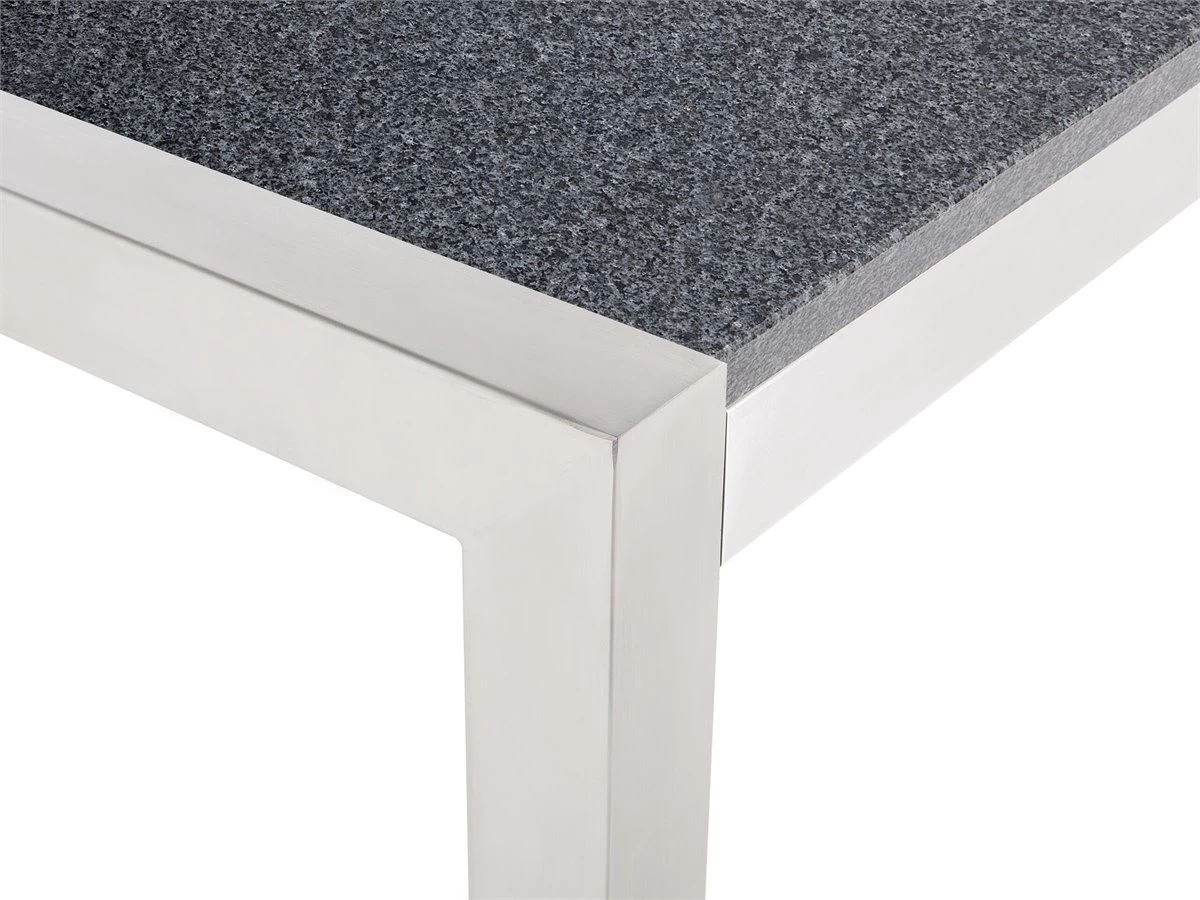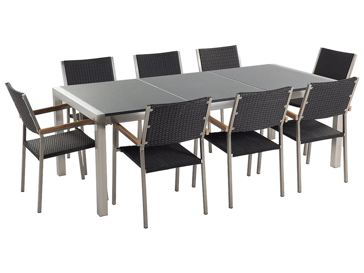 Lujoso conjunto de jardín de mesa en acero inoxidable y granito, con 8 sillas. Añade elegancia a tu zona exterior con este conjunto de comedor. Está constituido por una mesa y 8 sillas. Fabricado a partir de acero inoxidable duradero y granito resistente a la intemperie. Las sillas son resistentes a los rayos UV y apilables, lo que permite ahorrar espacio. Detalles: Tipo de Producto: Conjunto de comedor Estilo: Moderno Color: Negro Tonalidad: Grafito Tipo de material: Piedra Material principal: Acero inoxidable Material adicional: Madera plástica Material de la superficie: Piedra Acabado: Pulido Dimensiones: Dimensiones de la silla: 55x58x87 cm Altura del asiento: 44 cm Dimensiones de la mesa: 220x100x74 cm Peso: 129 kg Capacidad de peso de la silla: 160 kg Capacidad de peso de la mesa: 70 kg La oferta incluye: 1 x Mesa, 8 x Silla Ventajas: Perfecto para todo tipo de exterior, Robusto marco resistente a la corrosión, Resistencia UV 4 (ISO 105-B02, Resistente a las manchas, Material impermeable y muy fácil de conservar, Apilable para un almacenaje mejor, Montaje muy sencillo Información de montaje: Requiere montaje parcial. 20-40 min. Información adicional: El producto viene con un libro de cuidados detallado para ayudarte a mantener tus muebles en las mejores condiciones durante muchos años. Consulta estos consejos para garantizar el mantenimiento adecuado de tus muebles nuevos – encontrarás las instrucciones de mantenimiento junto con el manual de montaje. Texto de resistencia: Gracias a su resistencia al agua, puedes utilizar el producto al aire libre y dejarlo a la intemperie durante lluvias ligeras. Si no es posible guardarlo en un lugar cerrado y protegido, recomendamos utilizar una funda protectora. La exposición prolongada a la humedad puede provocar daños en el mueble. Resistencia: Agua ligera / humedad Consejos de mantenimiento: Granito: 1.Las manchas difíciles como la salsa de tomate o el vino tinto penetran rápidamente en la superficie y, por lo tanto, deben eliminarse inmediatamente 2.Seque con un paño después de limpiar 3.Durante el invierno, use una cubierta protectora o guarde los muebles en el interior 4.Utilice solo detergentes suaves o limpiadores específicos para granito. No utilice limpiadores abrasivos. Secar después de limpiar. Acero inoxidable: 1.Limpiar solo con agentes de limpieza suaves. No utilice limpiadores alcalinos o ácidos 2.Las lluvias ácidas, el agua salada y las tormentas de arena pueden dañar la capa protectora 3.Durante el invierno, utilice una funda protectora o guarde los muebles en el interior 4.Durante la lluvia, se recomienda utilizar una funda protectora. Ratán sintético: 1.Se recomienda utilizar una funda protectora para la temporada de invierno o, si es posible, para mantener los muebles secos y frescos en el interior 2.Limpiar con detergentes a base de jabón. No utilizar limpiadores químicos corrosivos 3.Los utensilios o accesorios de vidrio pueden sobrecalentar la superficie 4.Para alargar la vida útil del mueble, protéjalo de la exposición directa al sol.