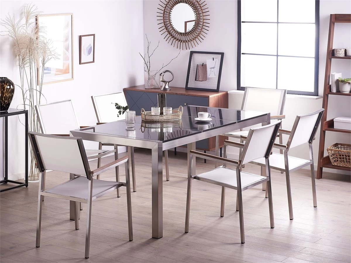 Lujoso conjunto de comedor para jardín, mesa con superficie de piedra natural. Añade elegancia a tu zona exterior con este conjunto de comedor. Está constituido por una mesa y 6 sillas. Fabricado a partir de acero inoxidable duradero y granito resistente a la intemperie. Las sillas son resistentes a los rayos UV y apilables, lo que permite ahorrar espacio. Detalles: Tipo de Producto: Conjunto de comedor Estilo: Moderno Color: Negro Tonalidad: Grafito Tipo de material: Piedra Material principal: Acero inoxidable Material adicional: Madera plástica Material de la superficie: Piedra Composición del Material: 90% PVC Acabado: Pulido Dimensiones: Dimensiones de la silla: 55x58x87 cm Altura del asiento: 44 cm Dimensiones de la mesa: 180x90x74 cm Peso: 135 kg Capacidad de peso de la silla: 160 kg Capacidad de peso de la mesa: 70 kg La oferta incluye: 1 x Mesa, 6 x Silla Ventajas: Perfecto para todo tipo de exterior, Robusto marco resistente a la corrosión, Resistencia UV 4 (ISO 105-B02, Resistente a las manchas, Material impermeable y muy fácil de conservar, Apilable para un almacenaje mejor, Montaje muy sencillo Información de montaje: Requiere montaje parcial. 20-40 min. Información adicional: El producto viene con un libro de cuidados detallado para ayudarte a mantener tus muebles en las mejores condiciones durante muchos años. Consulta estos consejos para garantizar el mantenimiento adecuado de tus muebles nuevos – encontrarás las instrucciones de mantenimiento junto con el manual de montaje. Texto de resistencia: Gracias a su resistencia al agua, puedes utilizar el producto al aire libre y dejarlo a la intemperie durante lluvias ligeras. Si no es posible guardarlo en un lugar cerrado y protegido, recomendamos utilizar una funda protectora. La exposición prolongada a la humedad puede provocar daños en el mueble. Resistencia: Agua ligera / humedad Consejos de mantenimiento: Granito: 1.Seque con un paño después de limpiar 2.Durante el invierno, use una cubierta protectora o guarde los muebles en el interior 3.Utilice solo detergentes suaves o limpiadores específicos para granito. No utilice limpiadores abrasivos. Secar después de limpiar 4.Las manchas difíciles como la salsa de tomate o el vino tinto penetran rápidamente en la superficie y, por lo tanto, deben eliminarse inmediatamente. Acero inoxidable: 1.Las lluvias ácidas, el agua salada y las tormentas de arena pueden dañar la capa protectora 2.Durante el invierno, utilice una funda protectora o guarde los muebles en el interior 3.Durante la lluvia, se recomienda utilizar una funda protectora 4.Limpiar solo con agentes de limpieza suaves. No utilice limpiadores alcalinos o ácidos. Textil trenzado: 1.El material es extremadamente resistente a la intemperie. Sin embargo, se recomienda utilizar una funda protectora para la temporada de invierno o, si es posible, guardar los muebles en un lugar fresco y seco 2.Manténgalo alejado de fuentes de calor, como parrilla o fuego, ya que las chispas pueden causar daños graves. No coloque utensilios calientes directamente sobre la superficie, 3.Limpiar con un limpiador a base de jabón suave y un paño suave
