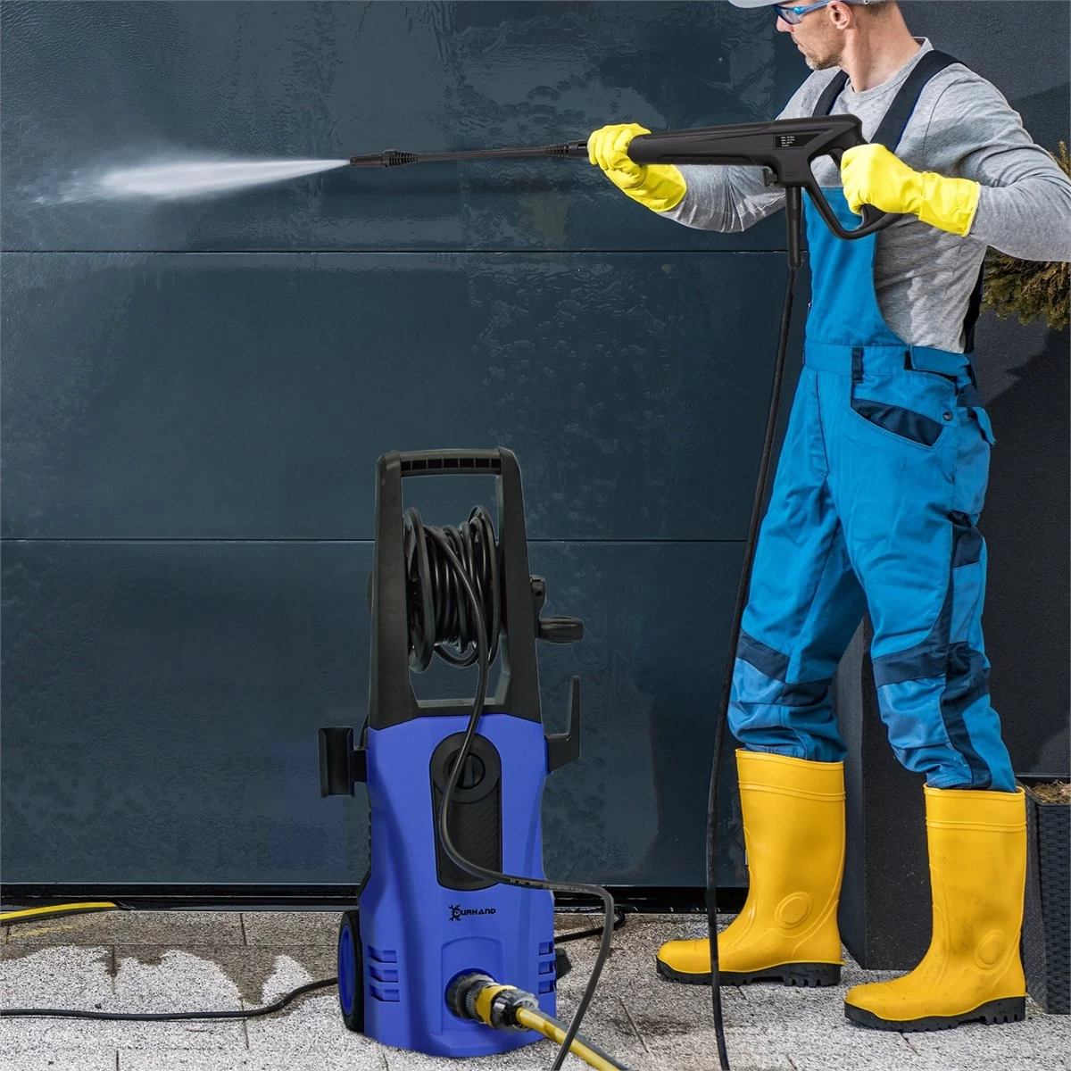 ¿Tu casa se ve vieja desde el exterior? ¿Tus coches están cubiertos de barro? Echa un vistazo a esta hidrolimpiadora portátil de DURHAND. Esta limpiadora a alta presión puede hacer frente a múltiples tareas de limpieza. Con un motor potente de 1800 W, una presión máxima de 150 bar y un caudal de 510L/h, permite tratar manchas persistentes. Características – Ángulo de boquilla ajustable de 0° a 75° – Se pone en marcha y se detiene automáticamente al apretar o aflojar el gatillo – Viene con carrete de manguera integrado, soporte para la pistola pulverizadora y gancho para el cable de alimentación para mantenerlo organizado – El mango y el soporte de la pistola pulverizadora son desmontables para reducir su tamaño – Adecuado para limpiar vehículos, paredes exteriores, suelos de terrazas, muebles de exterior, vallas de jardín, etc. – Requiere montaje Especificaciones – Color: azul, negro – Material: polipropileno (PP, cobre, aluminio – Medidas totales: 35x27x78 cm (LxANxAL – Longitud de la manguera: 6 m – Longitud del cable de alimentación: 5 m – Tensión nominal: 220V-240V – Frecuencia nominal: 50/60 Hz – Potencia nominal: 1800 W – Presión nominal: 100 bar – Presión máxima: 150 bar – Protección de entrada: IPX5 – Caudal nominal: 360 L/h – Caudal máximo: 510 L/h – Referencia: 845-867V91BU