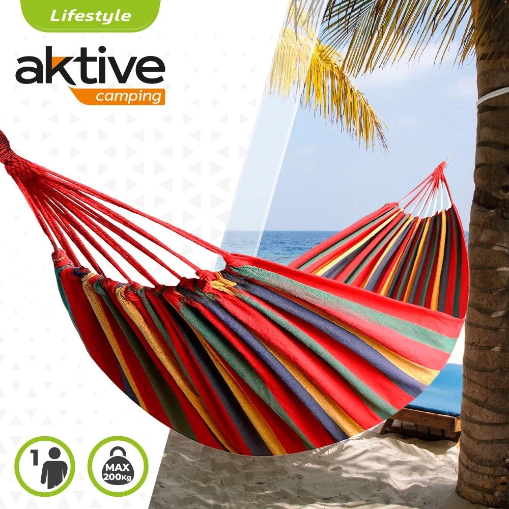 Hamaca de algodón Aktive Camping. La hamaca está fabricada con algodón de alta calidad en color rojo, lila, verde y amarillo, mide 200×100 cm, soporta un peso máximo de 200 kg y tiene capacidad para 1 persona. Incluye 1 cuerda blanca con 2 metros de largo para atar a una pared o árboles. Incluye bolsa de transporte para transportar.