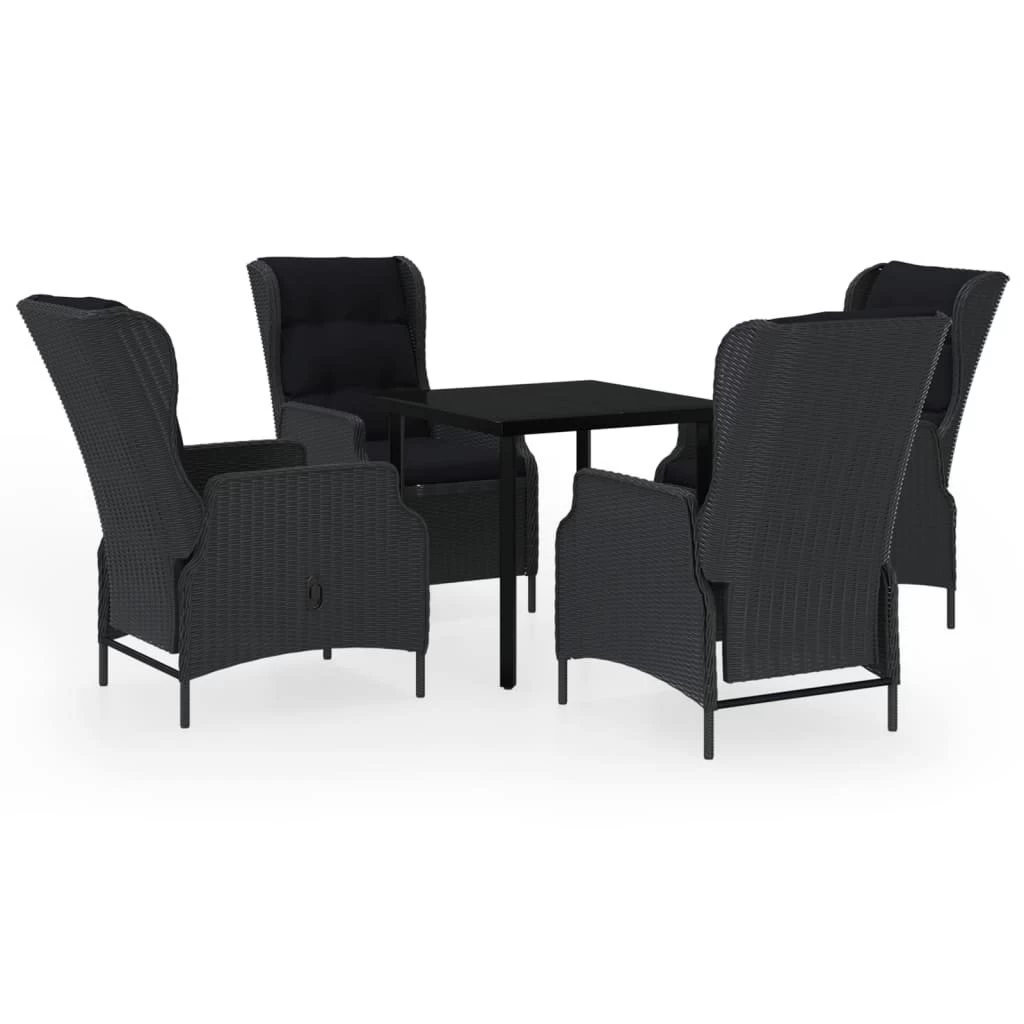 ¡Disfruta de una buena comida o cena en el espacio al aire libre de tu casa con este juego de comedor para jardín! Con un diseño elegante, ¡se convertirá en el centro de atención del jardín o patio! El práctico juego de comedor para exterior tiene una estructura de acero, por lo que es fuerte y robusto. Las sillas reclinables de jardín están hechas de ratán PE, resistente al agua y que no necesita mantenimiento, por lo que son perfectas para usar al aire libre. Los cojines acolchados dan un plus de comodidad a la hora de las comidas. La funda del cojín está equipada con una cremallera, es extraíble y lavable. Gracias al mecanismo de elevación a gas, el respaldo también se puede regular para que encuentres la mejor postura. Al tocar el botón del lateral, el respaldo se reclina para ofrecer una posición cómoda. Asimismo, la lisa superficie de vidrio se limpia fácilmente con un paño húmedo y es perfecta para colocar comida, bebida y otros artículos decorativos. Nota: Para prolongar la vida de tus muebles de exterior, te recomendamos que los protejas con una funda impermeable. Mesa:Color: NegroMaterial: Acero con recubrimiento en polvo, vidrioDimensiones: 80 x 80 x 74 cm (largo x ancho x altoSilla:Color de la silla: Gris oscuroColor del cojín: NegroMaterial de la silla: Ratán PE redondo, acero con recubrimiento en polvoMaterial del cojín: Funda 100% poliéster con relleno de espumaDimensiones de la silla (no reclinada: 57 x 88 x 100 cm (ancho x profundo x altoDimensiones de la silla (reclinada: 57 x 121 x 80 cm (ancho x profundo x altoAnchura del asiento: 50 cmProfundidad del asiento: 59 cmAltura del asiento desde el suelo: 39 cmAltura del reposabrazos desde el suelo: 60 cmGrosor del cojín del asiento: 6 cmGrosor del cojín de respaldo: 10 cmPosee función reclinableRequiere montaje: SíLa entrega contiene:1 x Mesa4 x Silla4 x Cojines de asiento4 x Cojines trasero