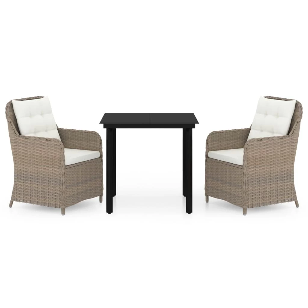 ¡Disfruta de una buena comida o cena en el espacio al aire libre de tu casa con este juego de comedor para jardín! Con un diseño elegante, ¡se convertirá en el centro de atención del jardín o patio! El práctico juego de comedor para exterior tiene una estructura de acero, por lo que es fuerte y robusto. Las sillas de jardín están hechas de ratán PE, resistente al agua y que no necesita mantenimiento, por lo que son perfectas para usar al aire libre. La forma ergonómica y los cojines acolchados y extraíbles con relleno de espuma proporcionan el confort definitivo. Las fundas de cojines y almohadones son de poliéster, apenas necesitan cuidados y se pueden quitar fácilmente para lavarlas. Asimismo, la lisa superficie de vidrio se limpia fácilmente con un paño húmedo y es perfecta para colocar comida, bebida y otros artículos decorativos. Nota: Para prolongar la vida de tus muebles de exterior, te recomendamos que los protejas con una funda impermeable. Mesa:Color: NegroMaterial: Acero con recubrimiento en polvo, vidrioDimensiones: 80 x 80 x 74 cm (largo x ancho x altoSilla:Color de la silla: MarrónColor de cojines: Blanco cremaMaterial de la silla: Ratán PE, acero con recubrimiento en polvoMaterial del cojín: 100% poliésterDimensiones de la silla: 64 x 65 x 90 cm (ancho x profundo x altoAnchura del asiento: 54 cmProfundidad del asiento: 49 cmAltura del asiento desde el suelo sin cojín: 41 cmAltura del reposabrazos desde el suelo: 54 cmResistente a la intemperieRequiere montaje: SíLa entrega contiene:1 x Mesa2 x Silla2 x Cojines de asiento2 x Cojines de respaldo