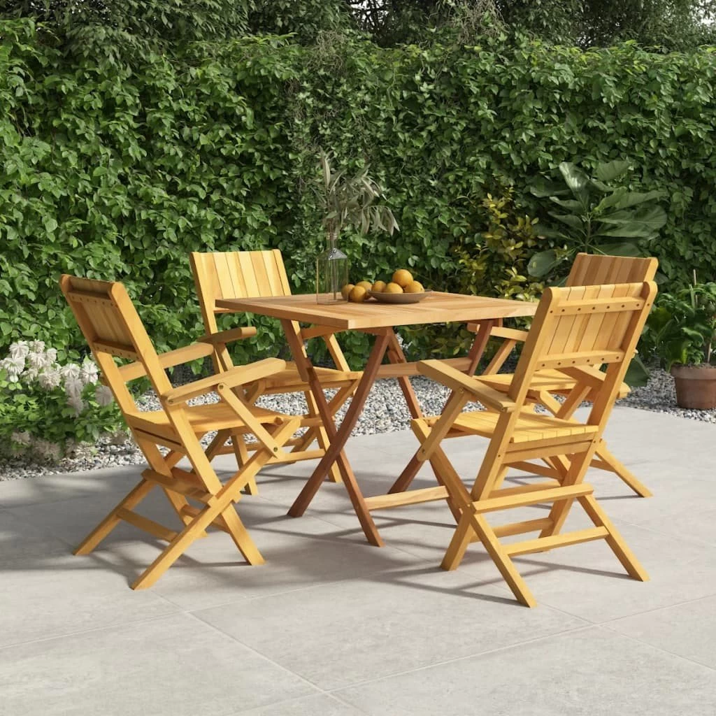 ¡Relájate y disfruta de un delicioso café y comidas con tu familia y amigos con este clásico juego de comedor de jardín de madera! Madera maciza de teca: El juego de comedor está hecho de madera maciza de teca. La madera maciza de teca es un bonito material natural. Ha sido curada, secada al horno y después lijada finamente para darle un aspecto muy suave. La madera de teca es conocida por su excepcional fuerza y resistencia a la intemperie.Función plegable: El juego de comedor de exterior se puede plegar para ahorrar espacio cuando no se use.Cómodo: El respaldo de la silla de comedor para jardín te ofrece un soporte excelente y proporciona una comodidad óptima.Superficie robusta: La resistente superficie de la mesa de comedor es perfecta para colocar comida, bebidas, jarrones, fruteros u otros artículos decorativos.Agujero para la sombrilla: La mesa tiene un orificio para la sombrilla en la superficie, para que puedas colocarla fácilmente y crear un lugar con sombra.Diseño de listones: La silla de comedor para exterior con un diseño de listones tiene un aspecto sencillo y atemporal. Nota:Para asegurarte de que tus muebles de exterior se mantengan hermosos, recomendamos protegerlos con una funda impermeable. Mesa:Material: Madera maciza de teca con acabado de base acuosaDimensiones: 85 x 85 x 76 cm (largo x ancho x altoDiámetro del orificio para la sombrilla: 5 cmSilla de jardín plegable:Material: Madera maciza de teca con acabado de base acuosaDimensiones (cada una: 55 x 61 x 90 cm (largo x ancho x altoDimensiones de asiento: 41 x 43 cm (ancho x profundoAltura del asiento desde el suelo: 45 cmAltura del reposabrazos desde el suelo: 66,5 cmMáx. capacidad de carga (por asiento: 110 kgRequiere montaje: SíLa entrega incluye:1 x Mesa4 x Silla de jardín plegable