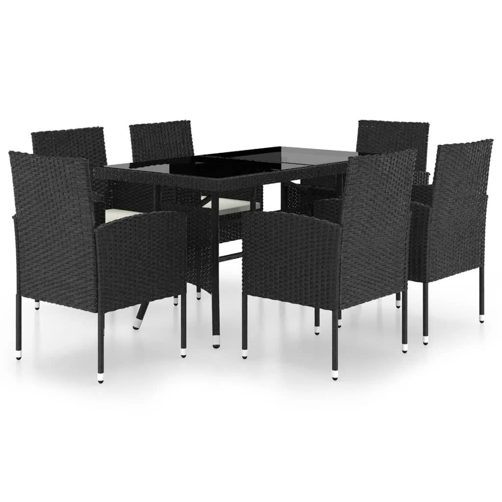 ¡Crea una estética atractiva y cohesionada en el espacio al aire libre de tu casa con este juego de comedor para jardín de ratán sintético! La mesa y las sillas de comedor están hecha de ratán PE de bajo mantenimiento, por lo que son fáciles de limpiar con un paño húmedo y también son perfecta para usar al aire libre. Gracias a la estructuras de acero, la mesa y las sillas son estables y seguras. La superficie de vidrio también da un toque lujoso al espacio exterior de tu casa. Además, los cojines gruesos y extraíbles son muy cómodos. Ten en cuenta que recomendamos cubrir el set de comedor en caso de lluvia, nieve y heladas para que sea más duradero. Mesa:Color: NegroMaterial: Ratán PE, acero Material de la superficie: VidrioDimensiones de la mesa: 140 x 80 x 74 cm (largo x ancho x altoFácil de limpiarSilla:Color: NegroColor de los cojines: Blanco cremaMaterial: Ratán PE, acero Material del cojín: 100% poliésterDimensiones de la silla: 52 x 56 x 88 cm (ancho x profundo x altoDimensiones del cojín: 47 x 46 x 5 cm (ancho x profundo x grosorAnchura del asiento: 47 cmProfundidad del asiento: 46 cmAltura del asiento desde el suelo: 43 cmAltura del reposabrazos desde el suelo: 66 cmRequiere montaje: SíLa entrega incluye:1 x Mesa6 x Sillas6 x Cojines de asiento