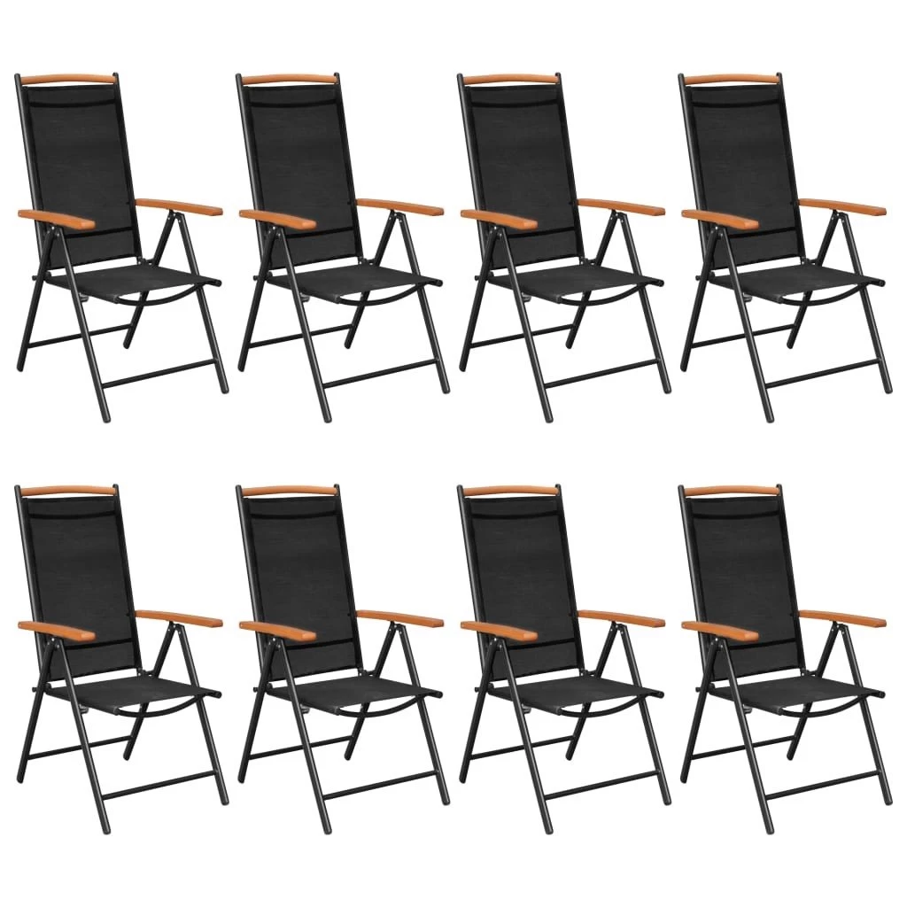 Este juego de comedor para jardín, práctico y elegante, es perfecto para relajarse o cenar en el jardín o patio. La estructura de aluminio con recubrimiento en polvo hace que el conjunto de muebles sea muy robusto y duradero. Las sillas de jardín tienen asientos y respaldos de textilene suave al tacto, son regulables en 7 posiciones, por lo que siempre puedes encontrar la posición de asiento más cómoda. Los reposabrazos de madera aglomerada y la barra superior refuerzan la elegancia de las sillas. Las sillas con reposabrazos se pueden plegar para ahorrar espacio cuando no se utilizan. La mesa tiene una superficie de WPC, que es fácil de limpiar y apta para usar al aire libre. Nota: Para prolongar la vida útil de los muebles de exterior, te recomendamos que los limpies con regularidad y no los dejes al aire libre sin protección innecesariamente.Limpieza: Usar una solución de jabón suaveAlmacenamiento: Si es posible, guarda el producto en un lugar fresco y seco en el interior. Si el producto se almacena al aire libre, protégelo con una funda impermeable. Limpia y seca el exceso de agua o nieve de las superficies planas después de una lluvia o nevada. Permite la ventilación para evitar daños relacionados con la humedad. Color: NegroMaterial: Aluminio con recubrimiento en polvo, textilene, madera aglomerada, WPCDimensiones de la silla: 58 x 65 x 109 cm (ancho x profundo x altoAnchura del asiento: 44 cmProfundidad del asiento: 44 cmAltura del asiento desde el suelo: 43,5 cmAltura del reposabrazos desde el suelo: 65 cmEl respaldo se reclina en 7 posicionesDimensiones de la mesa: 185 x 90 x 74 cm (largo x ancho x altoRequiere montaje: SíLa entrega incluye:1 x Mesa8 x Sillas