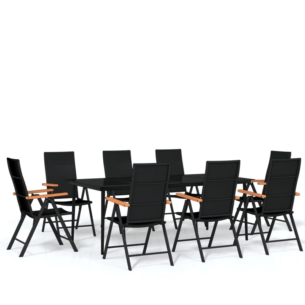 ¡Crea una estética atractiva y cohesionada en el espacio al aire libre de tu casa con este juego de comedor para jardín! Este juego de comedor de jardín está hecho de una estructura de acero con recubrimiento en polvo, lo que la hace robusta y estable para el uso diario al aire libre. La superficie de vidrio liso es fácil de limpiar con un paño húmedo y es perfecto para colocar comidas, bebidas y otros artículos decorativos. Las sillas de jardín están hechas de ratán PE, lo que las hace livianas y resistentes al agua. Además, los respaldos de las sillas tienen 7 posiciones de reclinado, para que siempre puedas encontrar la posición más cómoda para sentarte. Nota: Recomendamos cubrir este conjunto de muebles de jardín cuando llueva, nieve o hiele. Nota: Para prolongar la vida de tus muebles de exterior, te recomendamos que los protejas con una funda impermeable. Mesa: Color: Negro Material: Acero con recubrimiento en polvo, vidrio templado Dimensiones: 200 x 100 x 74 cm (largo x ancho x altoSilla: Color: Negro Material: Ratán PE, aluminio con recubrimiento de polvo, WPC Dimensiones: 55 x 64 x 105 cm (ancho x profundo x alto Los respaldos de las sillas se reclinan en 7 posicionesResistente a la intemperieRequiere montaje: SíLa entrega contiene: 1 x Mesa 8 x Silla