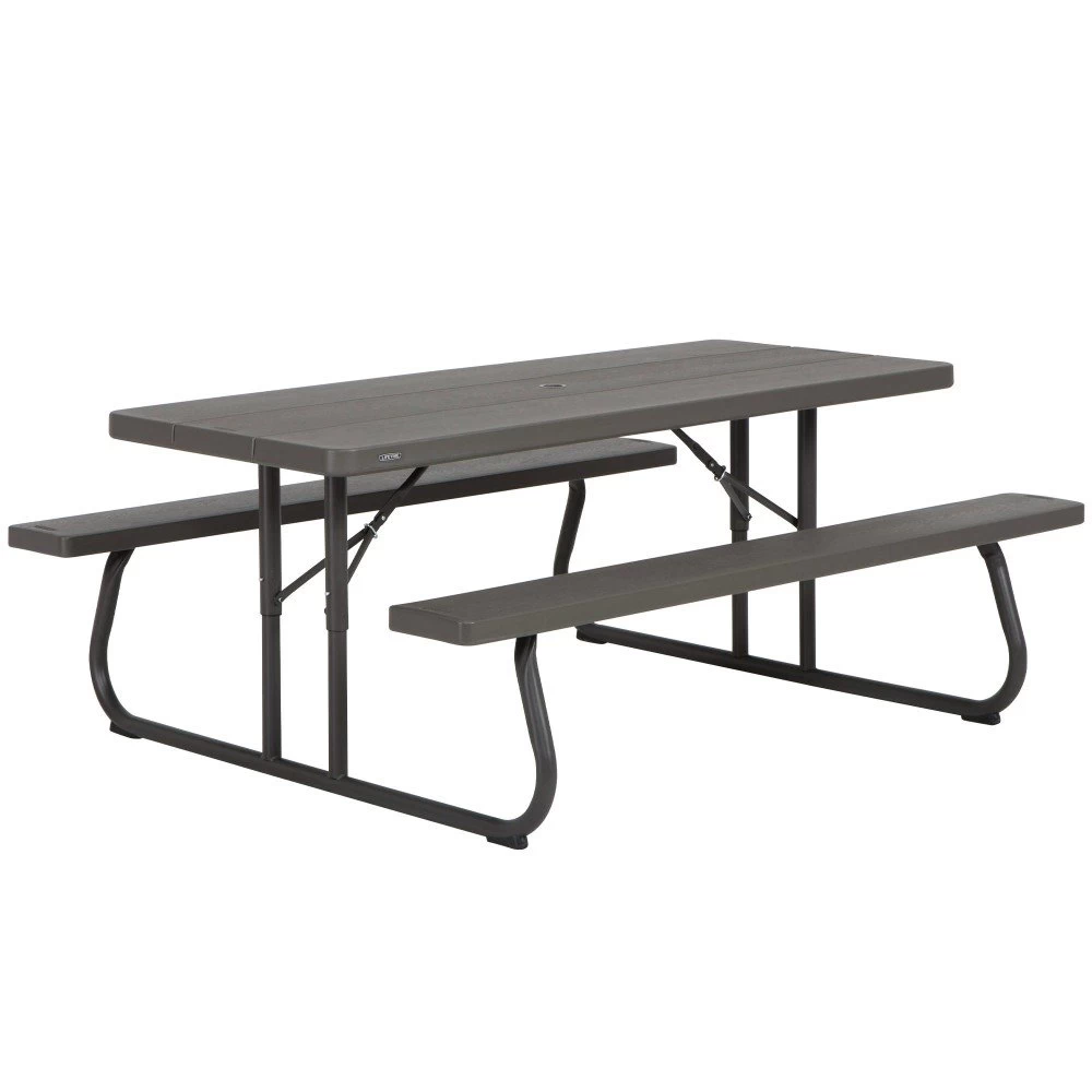 Mesa plegable con bancos LIFETIME acabado símil madera. Medidas mesa: 183x76x74 cm, medidas bancos: 183x23x47 cm, máx: 408 Kg (8 personas. Conjunto de piezaúnica, mesa y bancos de polietileno de alta densidad con protección UV, alta resistencia en exterior. Estructura gruesa y robusta en acero recubierto con acabado antióxido. Agujero central con tapón para sombrilla Ø 44,5 mm.