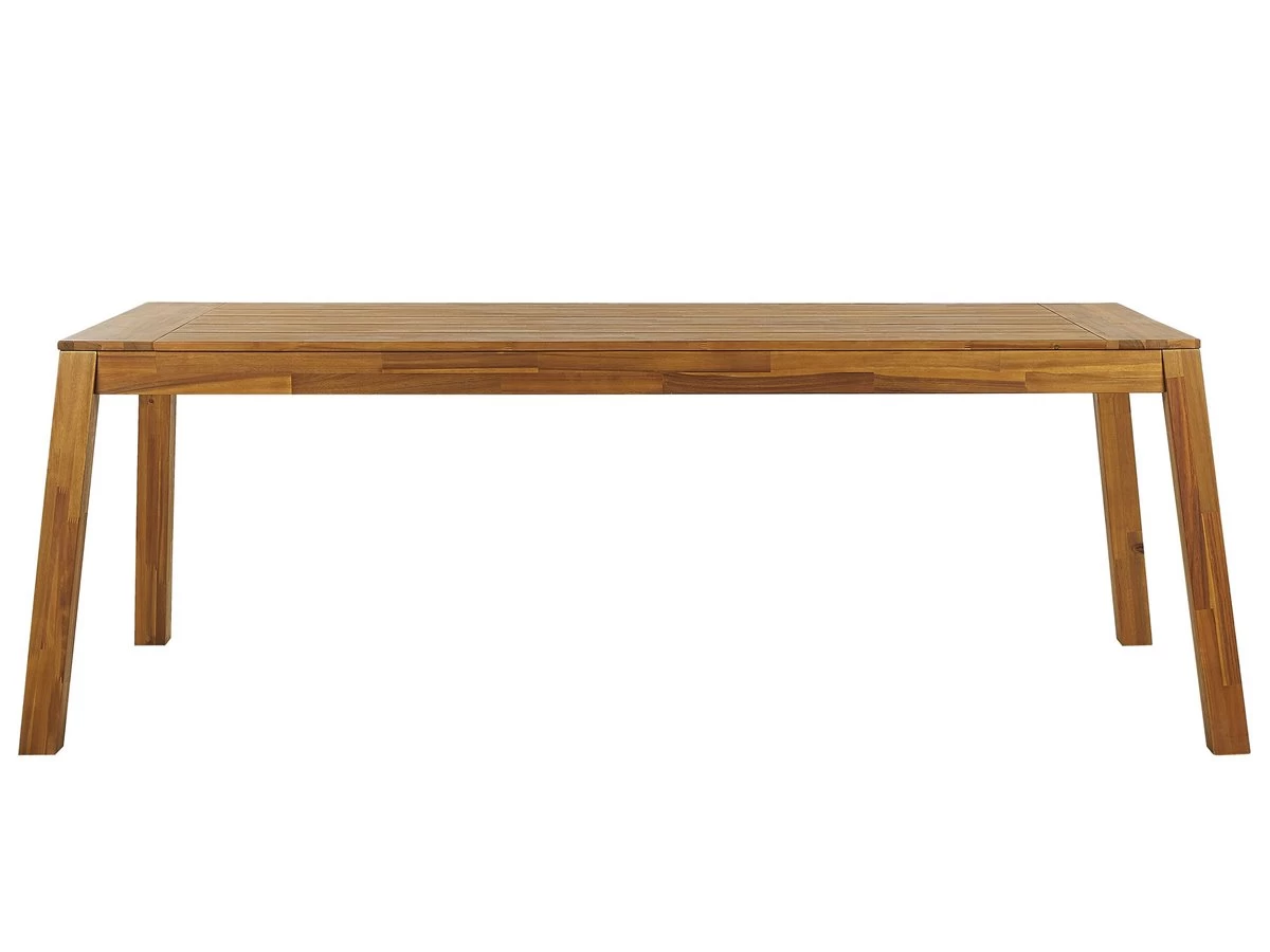 Mesa de exterior. Añade un toque rústico a tu jardín con esta mesa de comedor. Hecha de madera maciza de acacia que garantiza durabilidad y estabilidad, por lo que se puede utilizar tanto en interiores como en exteriores. Sus vetas de madera desprenden un efecto natural, haciendo que cada mesa sea diferente. El color de la madera clara hace que se adapte fácilmente a una gran variedad de decoraciones. Detalles: Tipo de Producto: Mesa de comedor Estilo: Rústico Color: Madera clara Tipo de material: Madera maciza Material principal: Madera de acacia Material de las patas: Madera maciza Material de la superficie: Madera maciza Forma: Rectangular Acabado: Aceitado Dimensiones: Ancho: 90 cm Longitud: 210 cm Altura: 77 cm Peso: 38 kg Capacidad de peso: 80 kg La oferta incluye: 1 x Mesa Ventajas: Perfecto para todo tipo de exterior, Materiales de la más alta calidad, No requiere mantenimiento regular, Ideal para uso en interiores y exteriores, Anchas patas de soporte que proporcionan la máxima estabilización Información de montaje: Requiere montaje de las patas. 20-40 min. Información adicional: Por favor, ten en cuenta que la madera es un producto natural, y cada pieza puede presentar ligeras variaciones. Las diferencias en el color o la textura, como las arrugas u otras características naturales, no se consideran un defecto ni tampoco una base de reclamación, El producto viene con un libro de cuidados detallado para ayudarte a mantener tus muebles en las mejores condiciones durante muchos años. Consulta estos consejos para garantizar el mantenimiento adecuado de tus muebles nuevos – encontrarás las instrucciones de mantenimiento junto con el manual de montaje. Texto de resistencia: El producto es resistente al viento, por lo que no debe volcarse ni perder estabilidad con ráfagas de viento. Resistencia: Viento Consejos de mantenimiento: Madera de acacia: 1.Los muebles con acabado de aceite deben volverse a engrasar antes de ponerlos en uso y al menos una vez al año, especialmente en el clima húmedo 2.Limpiar con un limpiador suave y un paño suave en la dirección de la veta. Secar con un paño inmediatamente después de limpiar 3.Durante el invierno o en condiciones climáticas adversas, utilice una funda protectora o guarde los muebles en el interior.