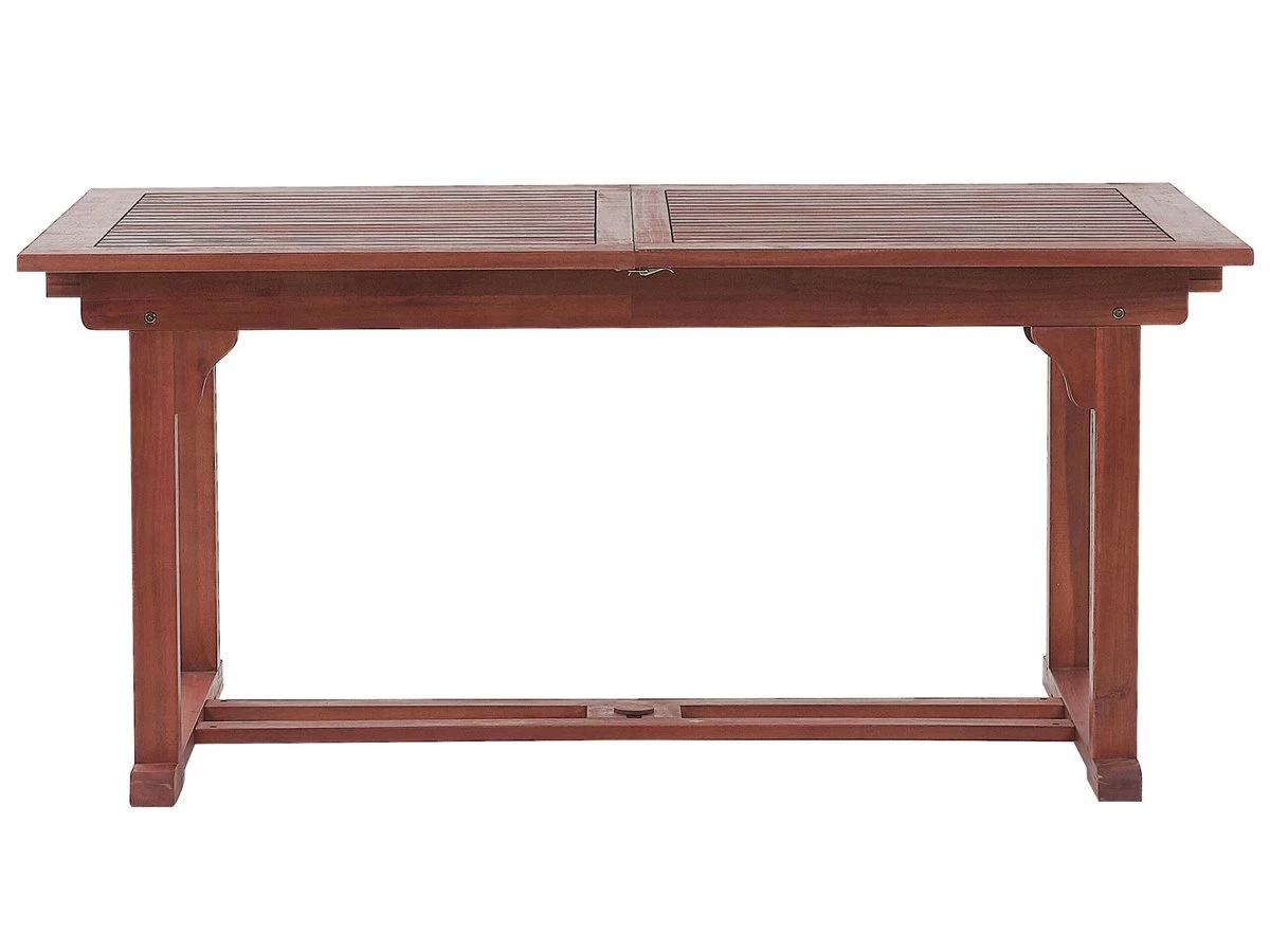 Mesa de exterior. Esta elegante y extensible mesa de jardín de madera es una gran adición a tu terraza o jardín. Está hecha de madera de acacia sólida y duradera. La mesa también tiene un agujero para la sombrilla en el medio de la parte superior, lo que te permite crear sombra sobre tu mesa durante los días soleados. Puedes extender esta pieza fácilmente cuando esperas invitados, lo que hace que la mesa sea una adición acogedora a cualquier jardín. Detalles: Tipo de Producto: Mesa extensible Estilo: Rústico Color: Madera oscura Tonalidad: Rojo oscuro Tipo de material: Madera maciza Material principal: Madera de acacia Material adicional: Acero Material de las patas: Madera maciza Material de la superficie: Madera maciza Forma: Rectangular Acabado: Aceitado Dimensiones: Ancho: 90 cm Longitud: 160/220 cm Altura: 74 cm Peso: 38 kg Capacidad de peso: 75 kg La oferta incluye: 1 x Mesa Ventajas: Diseño atemporal, Combina con todo tipo de decoración, Apariencia moderna y calidad durante muchos años, La mesa extensible proporciona espacio adicional, Materiales naturales Información de montaje: Requiere montaje parcial. 20-40 min. Información adicional: Por favor, ten en cuenta que la madera es un producto natural, y cada pieza puede presentar ligeras variaciones. Las diferencias en el color o la textura, como las arrugas u otras características naturales, no se consideran un defecto ni tampoco una base de reclamación, El producto viene con un libro de cuidados detallado para ayudarte a mantener tus muebles en las mejores condiciones durante muchos años. Consulta estos consejos para garantizar el mantenimiento adecuado de tus muebles nuevos – encontrarás las instrucciones de mantenimiento junto con el manual de montaje. Texto de resistencia: Gracias a su resistencia al agua, puedes utilizar el producto al aire libre y dejarlo a la intemperie durante lluvias ligeras. Si no es posible guardarlo en un lugar cerrado y protegido, recomendamos utilizar una funda protectora. La exposición prolongada a la humedad puede provocar daños en el mueble. Resistencia: Manchas Consejos de mantenimiento: Madera de acacia: 1.Los muebles con acabado de aceite deben volverse a engrasar antes de ponerlos en uso y al menos una vez al año, especialmente en el clima húmedo 2.Limpiar con un limpiador suave y un paño suave en la dirección de la veta. Secar con un paño inmediatamente después de limpiar 3.Durante el invierno o en condiciones climáticas adversas, utilice una funda protectora o guarde los muebles en el interior.
