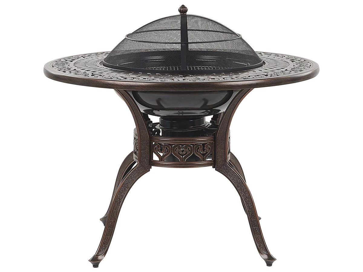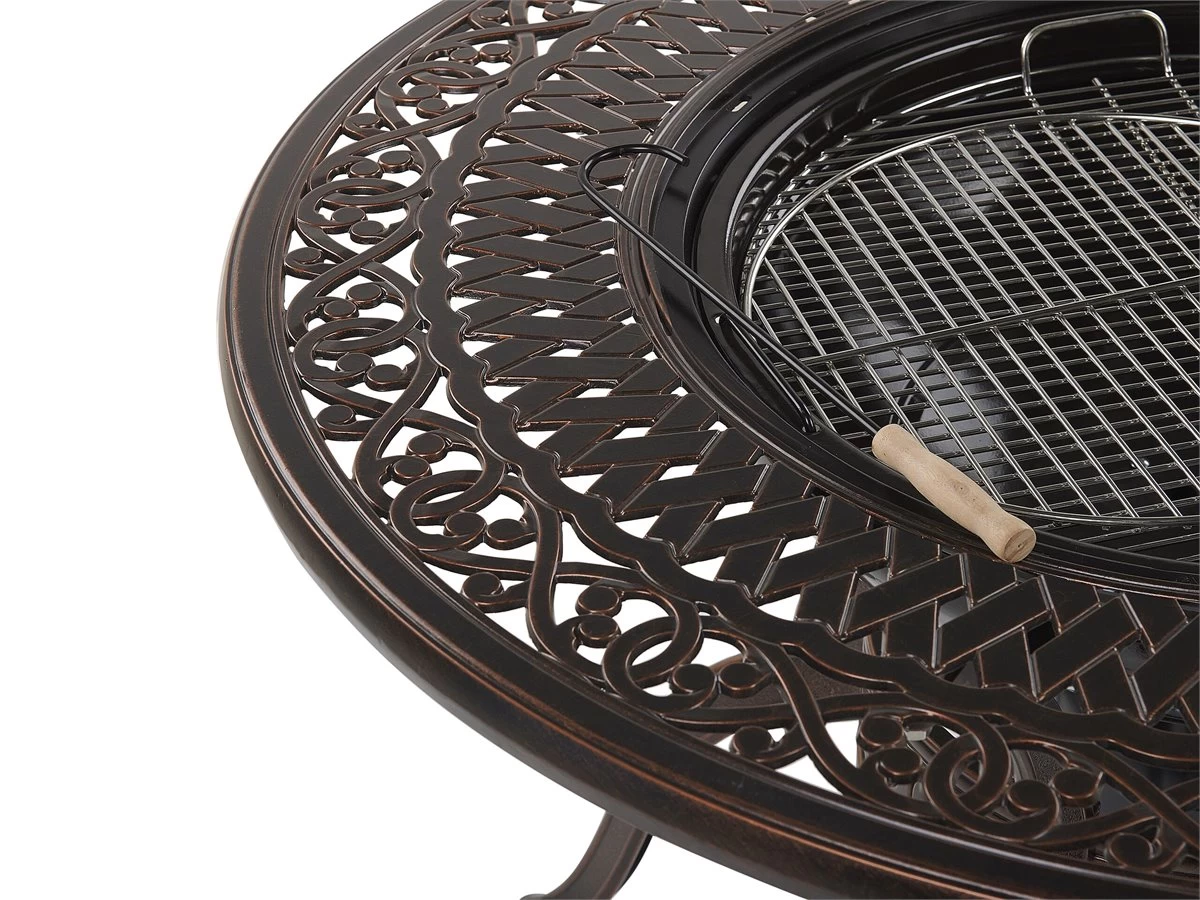 Mesa de exterior. Aprovecha al máximo los cálidos días de verano y disfruta de la máxima comodidad gracias a esta mesa de barbacoa. Hecha de aluminio robusto, embellece cada terraza o balcón con un elegante acento vintage. La mesa viene con una parrilla incorporada que se puede cubrir con una tapa extraíble. Configúrala con sillas complementarias y disfruta de un lugar perfecto para cenar al aire libre. Detalles: Tipo de Producto: Mesa de jardín Estilo: Retro Color: Marrón Tonalidad: Marrón oscuro Tipo de material: Metal Material principal: Aluminio Material de la superficie: Metal Forma: Redonda Acabado: Pulido Dimensiones: Ancho: 105 cm Longitud: 105 cm Altura: 72 cm Peso: 35 kg Capacidad de peso: 150 kg La oferta incluye: 1 x Mesa Ventajas: Incluye el pozo de fuego , Diseño tradicional con un toque moderno, Pieza estable y robusta, Muy fácil de conservar, Resiste a todo tipo de clima Información de montaje: Requiere montaje completo. 20-40 min. Texto de resistencia: El producto es resistente al agua, lo que significa que no se dañará expuesto a la lluvia o en contacto con otros líquidos. Puede dejarlo al aire libre incluso durante fuertes lluvias o humedad. Durante la temporada de invierno es recomendable almacenar el producto en el interior o bajo una cubierta impermeable. Resistencia: Agua Consejos de mantenimiento: Aluminio: 1.Fuera de temporada, utilice una funda protectora o guarde los muebles en un lugar fresco y seco 2.Limpiar con agua jabonosa y detergentes suaves. Quitar el polvo con un paño suave.
