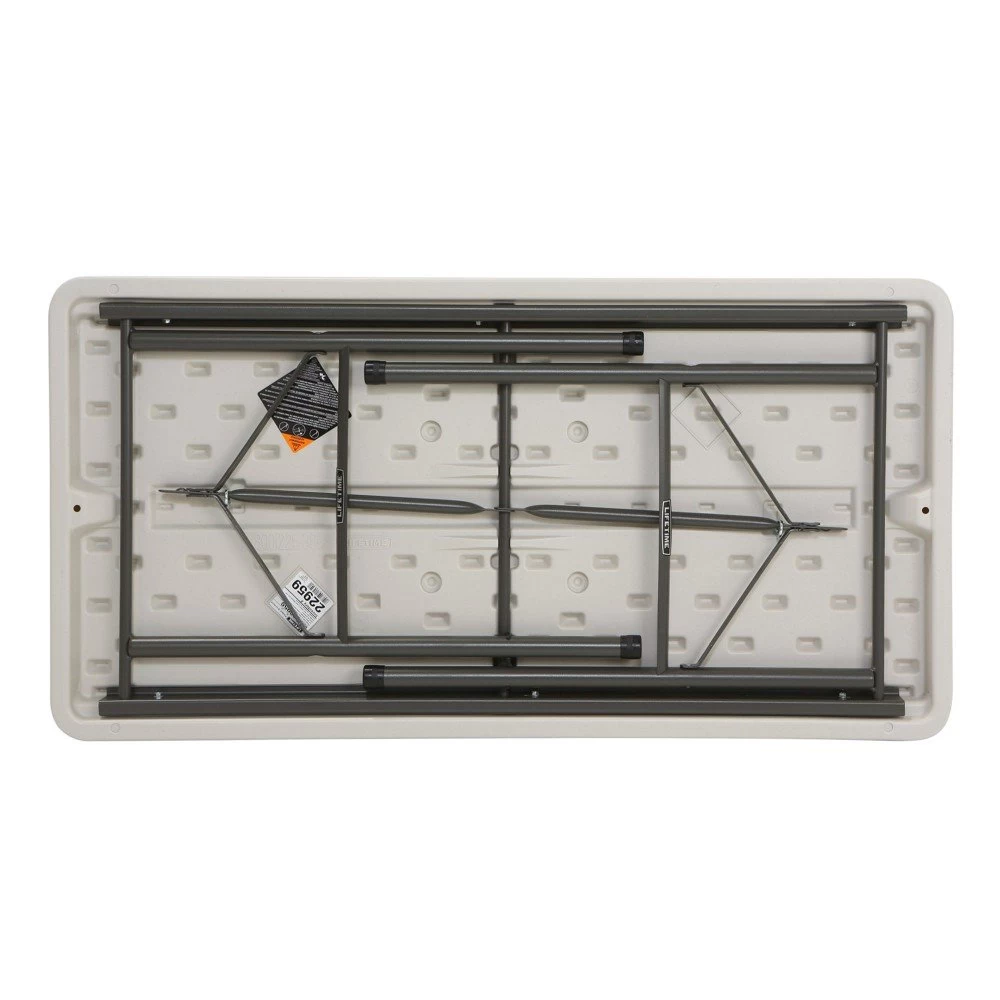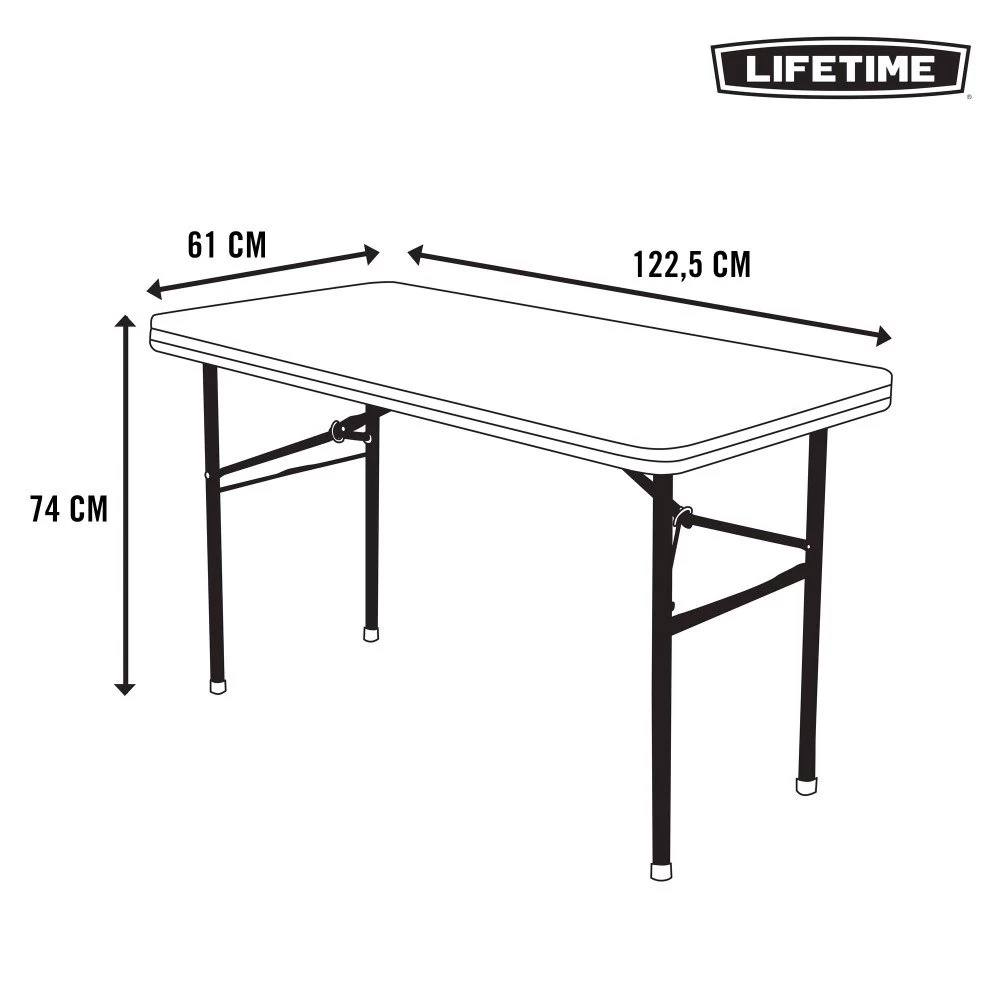 Mesa plegable ultrarresistente LIFETIME con tablero de polietileno de alta densidad y estructura robusta en acero recubierto con acabado en polvo antióxido. Compacta, ligera (9 kg y pensada para uso exterior e interior, ideal para 4 personas. Mide 122 x 61 cm y su altura montada es de 74 cm. Plegado compacto y firme, sistema de seguridad antiapertura/ciere y topes antideslizantes.