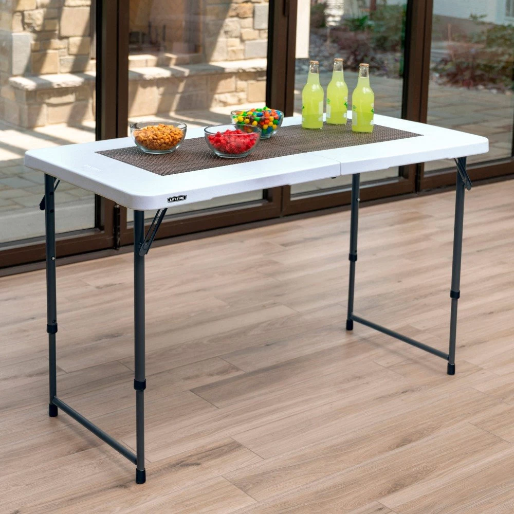 Mesa plegable para interior y exterior LIFETIME con medidas desplegada 122 x 61 cm. Patas con 4 alturas regulables 56-61-74-91 cm para adaptarse al uso. Plegada mide 62 x 61 x 8 cm y su peso máximo soportado es 340 kg. Fabricada de material ultrarresistente: polietileno de alta densidad con protección UV y armazón de acero recubierto, resiste manchas y condiciones climatológicas adversas. Diseño ligero y versátil, propone todas las opciones que necesitas en una mesa.