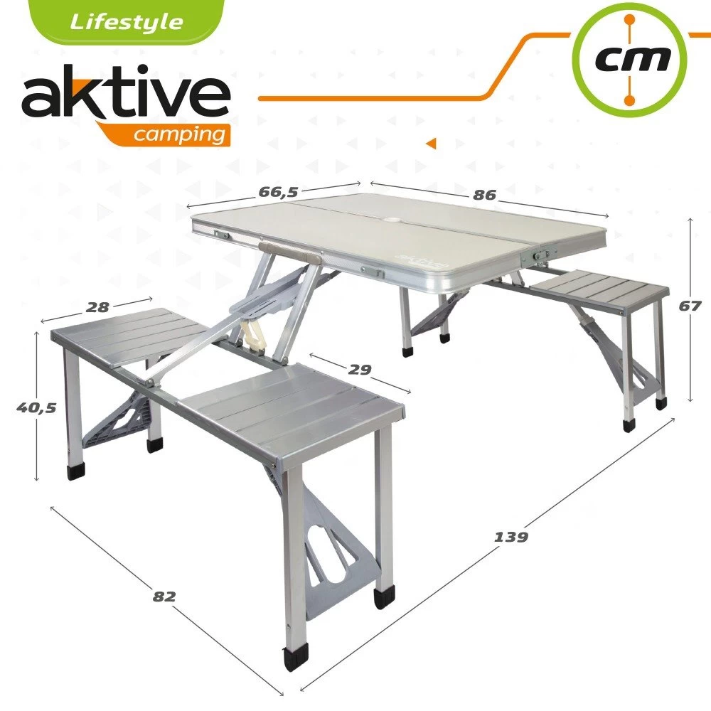 Mesa maleta plegable con asientos plegables Aktive. Esta mesa plegable mide desplegada 135x86x67 cm y plegada mide 92x14x42 cm. Una mesa muy práctica para las salidas al aire libre de toda la familia ya que tiene 4 asientos y soporta un peso máximo de 80 Kg. La estructura es de aluminio. Incorpora tacos antideslizantes en las patas. Sillas fáciles de plegar bajo la mesa. La mesa incorpora cierre de seguridad y asa en un lateral para transportar. Además se puede colocar una sombrilla (no incluida en el centro de la mesa.