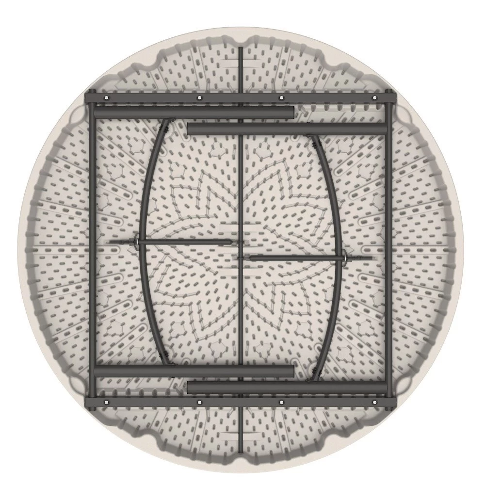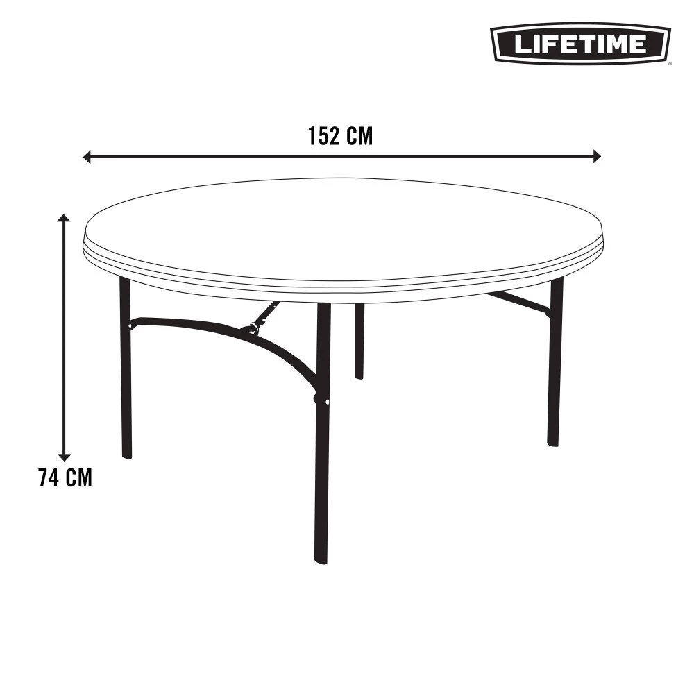 Mesa redonda portátil con patas abatibles Lifetime color crema. Tablero de polietileno de alta densidad con protección UV y estructura robusta de acero con revestimiento en polvo antióxido. Medidas: 152 cm de diámetro; altura: 74 cm. Sus patas se pliegan y esconden debajo del tablero y cuentan con anclajes de seguridad. Duradera, resistente y ligera. Perfecta para 8 personas.