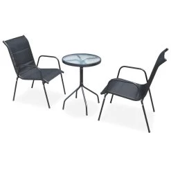 Este sofisticado conjunto de comedor para exterior se convertirá en el centro de atención de su jardín, patio o comedor. Las cómodas sillas son de acero con recubrimiento en polvo de gran calidad. Gracias a la firme tela de textilene con acolchado impermeable, nuestras sillas son muy cómodas, resistentes al agua y fáciles de limpiar. Las sillas son apilables para ahorrar espacio. La mesa tiene una superficie de 5 mm de grosor hecha de vidrio templado con textura ondulada, sobre la que puede colocar bebidas, aperitivos o elementos decorativos. También posee una robusta estructura de acero con recubrimiento en polvo que es duradera y fácil de mantener. El montaje es sencillo. La entrega incluye 1 mesa y 2 sillas de textilene. Nota: Le recomendamos que tape el mueble en condiciones de lluvia, nieve y heladas. Color de la mesa y las sillas: NegroMaterial de la mesa: Estructura de acero con recubrimiento en polvo + superficie de vidrio templadoMaterial de las sillas: Estructura de acero con recubrimiento en polvo + asiento y respaldo de textilene con acolchadoDimensiones de la mesa: 50 x 71 cm (diámetro x alturaDimensiones de la silla: 51 x 66 x 88 cm (ancho x profundo x altoAnchura de asiento: 50 cmProfundidad del asiento: 45 cmAltura del asiento desde el suelo: 40 cmAltura del reposabrazos desde el suelo: 59 cmSuperficie de vidrio de 5 mm de grosor con textura onduladaSillas apilablesFácil montajeLa entrega incluye 1 mesa y 2 sillasMaterial: Poliéster: 30%, PVC: 70%