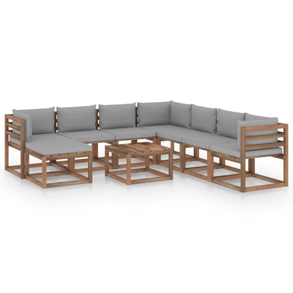 Este juego de muebles de jardín es una excelente opción para relajarte y disfrutar del buen tiempo, echar una siesta o charlar con tu familia o amigos. El conjunto de jardín está hecho de madera maciza de pino, lo que lo hace robusto y estable. ¡Puedes combinarlo con otros segmentos modulares para crear tus propias configuraciones de set de salón de jardín personal! Nota: Para prolongar la vida útil de los muebles de exterior, te recomendamos que los limpies con regularidad y no los dejes al aire libre sin protección innecesariamente.Limpieza: Usa una solución de jabón suaveAlmacenamiento: Si es posible, guarda el producto en un lugar fresco y seco en el interior. Si el producto se almacena al aire libre, protégelo con una funda impermeable. Limpia y seca el exceso de agua o nieve de las superficies planas después de una lluvia o nevada. Permite la ventilación para evitar daños relacionados con la humedad. Color del cojín: GrisMaterial: Madera de pino impregnada, tela (100% poliésterDimensiones del reposapiés/mesa: 60 x 60 x 36,5 cm (largo x ancho x altoDimensiones del sofá central: 60 x 64 x 70 cm (ancho x profundo x altoDimensiones del sofá esquinero: 64 x 64 x 70 cm (ancho x profundo x altoDimensiones del cojín de asiento: 60 x 60 x 6 cm (largo x ancho x grosorDimensiones de cojín de respaldo: 60 x 38 x 13 cm (largo x ancho x grosorDimensiones de cojín lateral: 55,5 x 38 x 13 cm (largo x ancho x grosorRequiere montaje: SíLa entrega incluye:1 x Mesa1 x Reposapiés4 x Sofás centrales3 x Sofás de esquina8 x Cojines de asiento7 x Cojines de respaldo3 x Cojín lateral