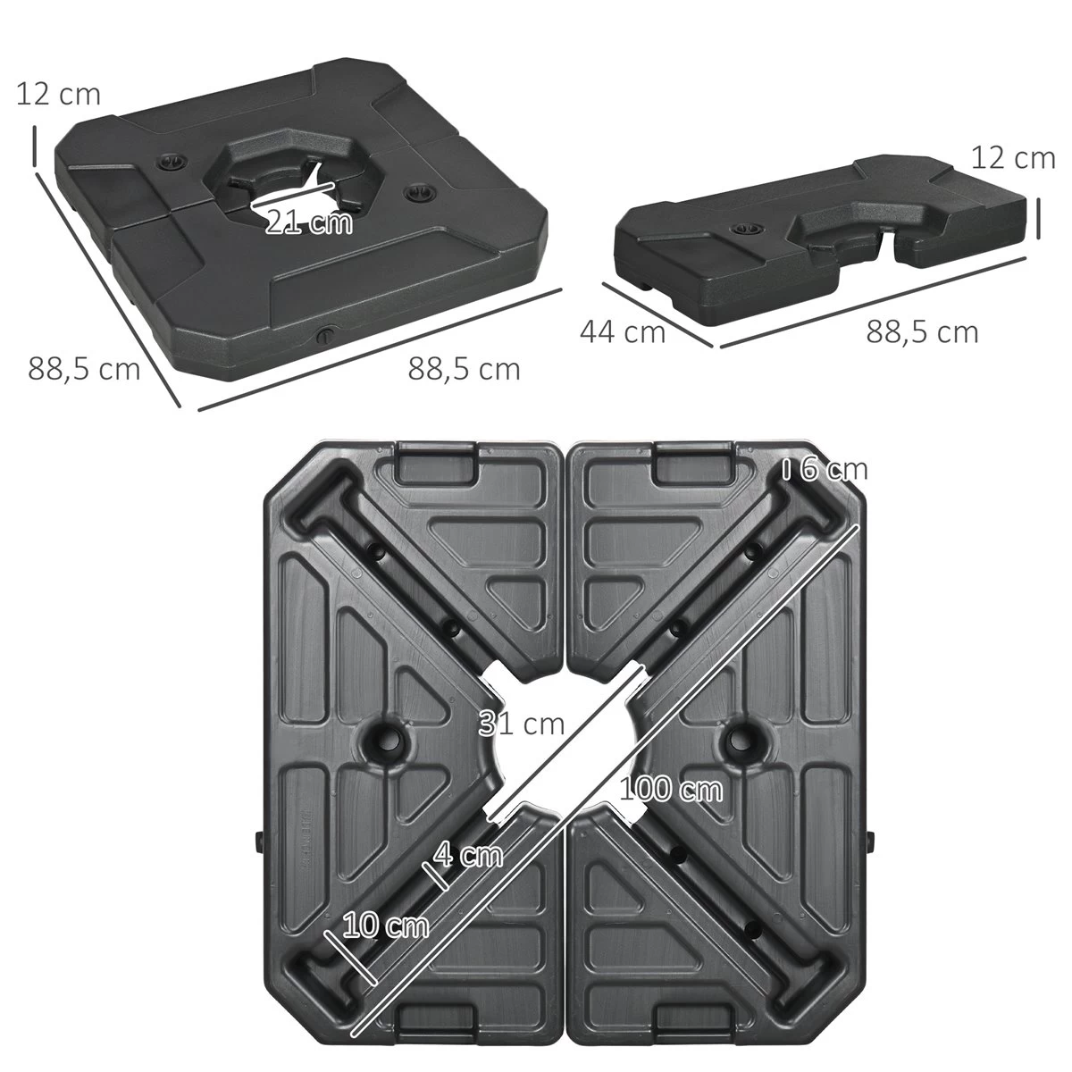 Si deseas que tu parasol voladizo esté siempre firme, estable y seguro en su lugar, estas placas de peso para base cruzada de Outsunny son perfectas. Fabricadas en HDPE, son 2 piezas que encajan fácilmente y pueden contener hasta 70 kg de arena y 110 kg de agua en total. Combina estas placas de peso con un parasol con base en cruz y crea tu propio oasis sombreado. Características – 2 Placas de peso para bases de sombrilla cruzadas (base no incluida – Fabricadas en HDPE resistente con recubrimiento protector, ideal para uso en exteriores – Se pueden llenar con hasta 70 kg de agua y 110 kg de arena – Cada placa tiene una tapa removible, facilitando así el llenado, vaciado y limpieza – Cuando no están en uso, se pueden apilar fácilmente para un almacenaje más fácil – Adecuado para tener en el jardín, en la piscina o en otros espacios al aire libre – Requiere montaje – Apto para sombrillas con referencia: 84D-187 y 84D-161 – Nota: la base cruzada NO está incluida Especificaciones – Color: negro – Material: HDPE – Medidas totales: 88,5×88,5×12 cm (LxANxAL – Medidas de cada placa: 88,5x44x12 cm (LxANxAL – Peso neto de cada placa: 3,3 kg – Apto para base de cruz: 100x10x6 cm (LxANxAL – Referencia: 84D-199V00BK