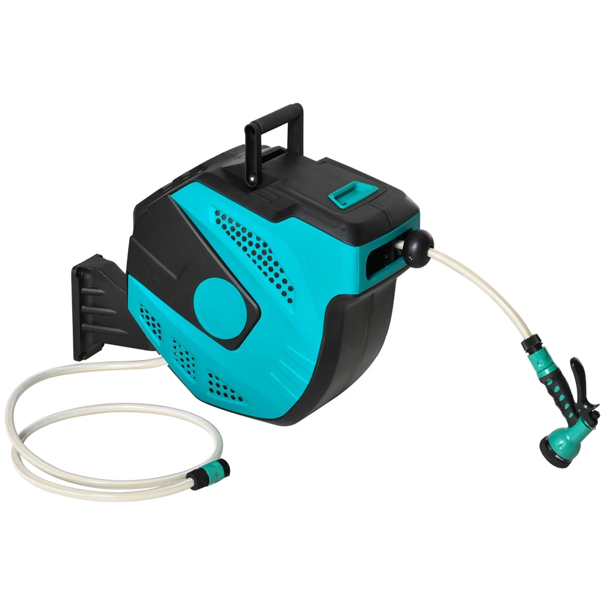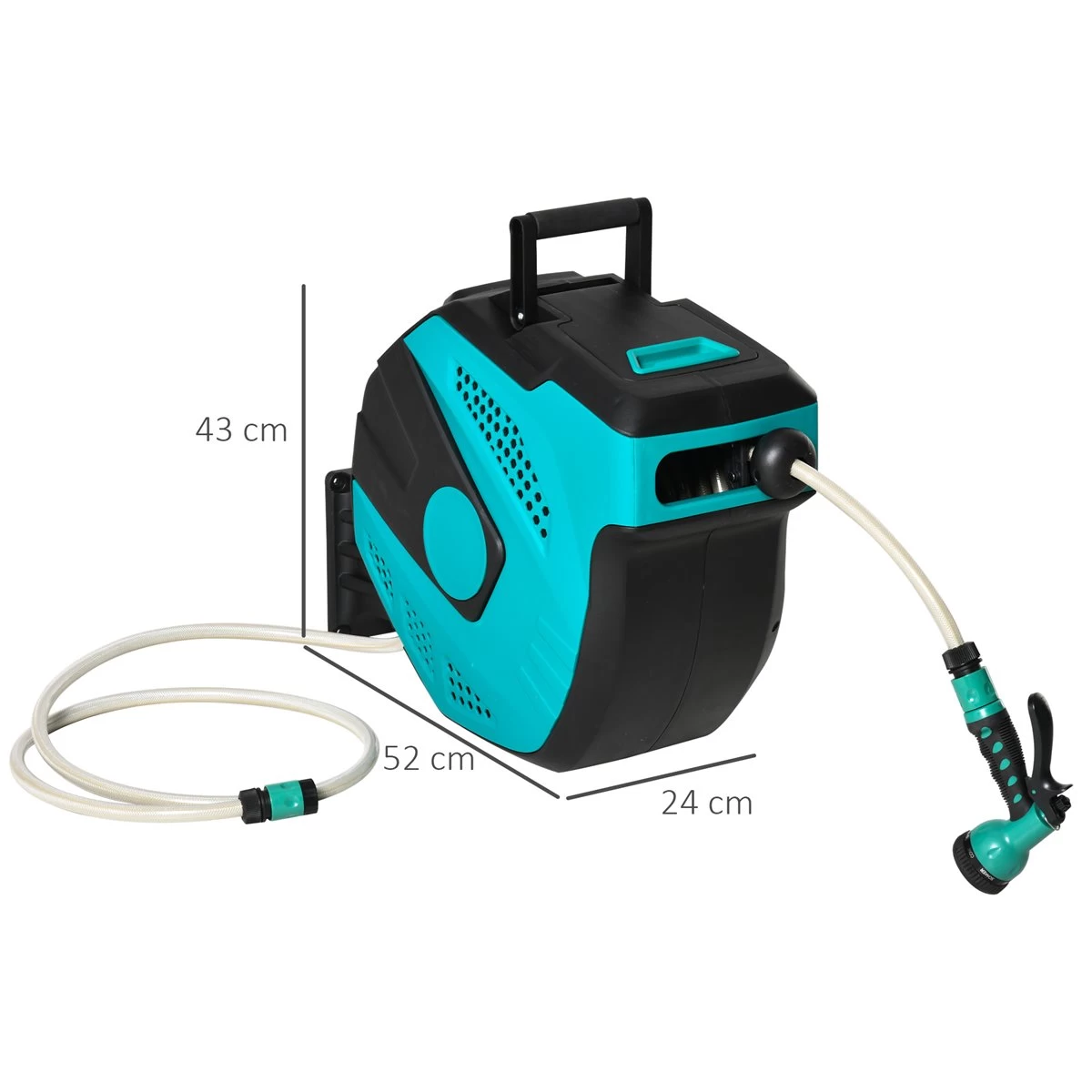 Si quieres una manguera para tu patio o jardín y no quieres estar pendiente de si se te tuerce, enrolla o tener que enrollarla manualmente cuando terminas, este carrete con manguera de Outsunny es lo que necesitas. Cuenta con una manguera de 20 metros que se enrolla automáticamente con bloqueo para fijarla en cualquier posición. El cabezal cuenta con 7 posiciones distintas de riego, ideal para regar tus plantas, césped, limpiar tu patio, coche, balcón y más. Características – La manguera de agua de 20 m de longitud ofrece una gran amplitud de trabajo y libertad de movimiento – Carrete de polipropileno de alta calidad, resistente a impactos y a la intemperie – Sistema de enrollado automático para mayor durabilidad y comodidad de uso – Siete modos diferentes de riego y manguera con función de bloqueo – Excelente para regar jardines, césped, patios, limpieza de vehículos y más – Incluye soporte de montaje giratorio de 180 grados, tornillos y tacos de pared – Se requiere montaje – NOTA: Antes de recoger la manguera dentro del carrete, asegúrese de que no gotee. Guarde la manguera y el carrete en el interior durante los meses de invierno para prolongar su vida útil Especificaciones – Color: negro y verde – Material: plástico PP (carrete y PVC (manguera – Medidas totales: 52x43x24 cm (LxANxAL – Longitud de la manguera de agua: 20 m – Diámetro de la manguera de agua: 11 mm (interior, 15 mm (exterior – Longitud de la manguera de conexión: 1,95 m – Presión de trabajo: 10 bar – Presión de rotura: 30 bar – Temperatura de trabajo: -5-45℃ – Referencia: 845-495